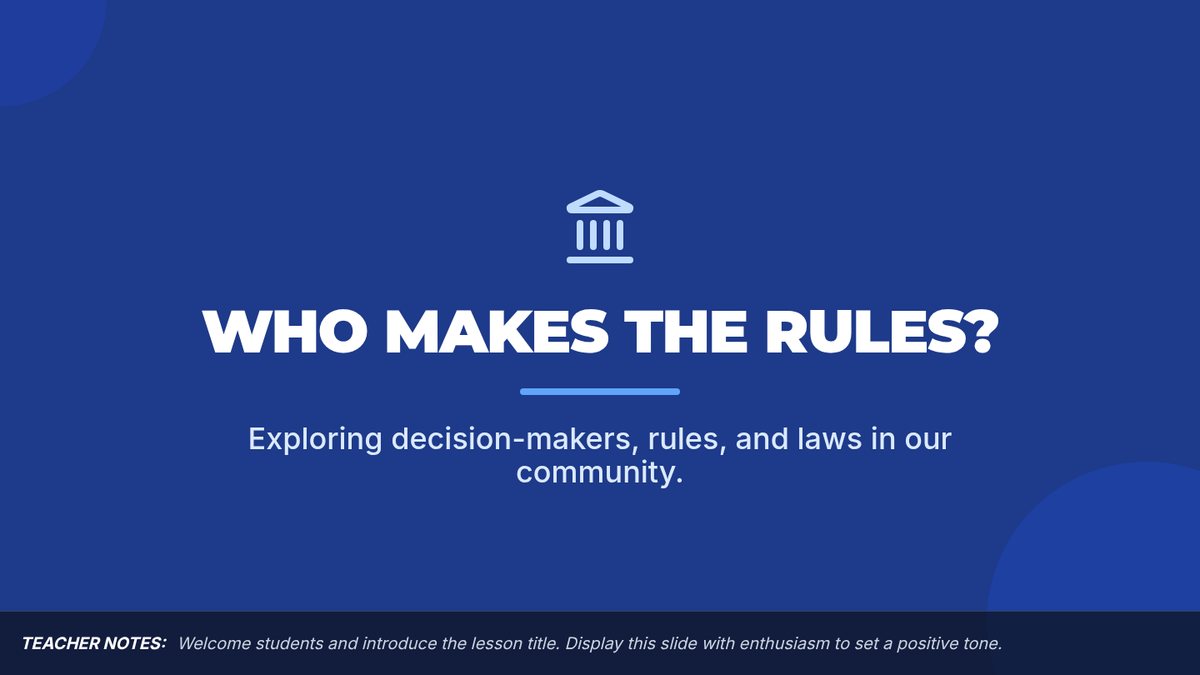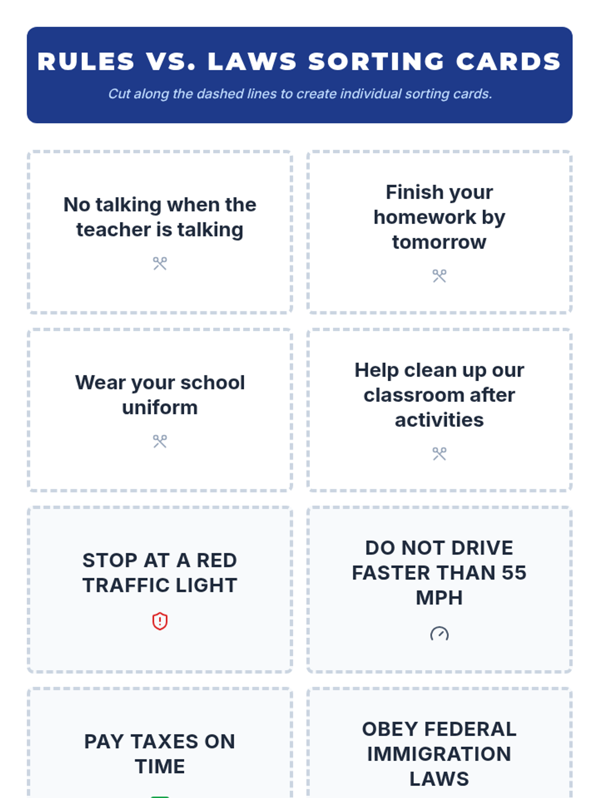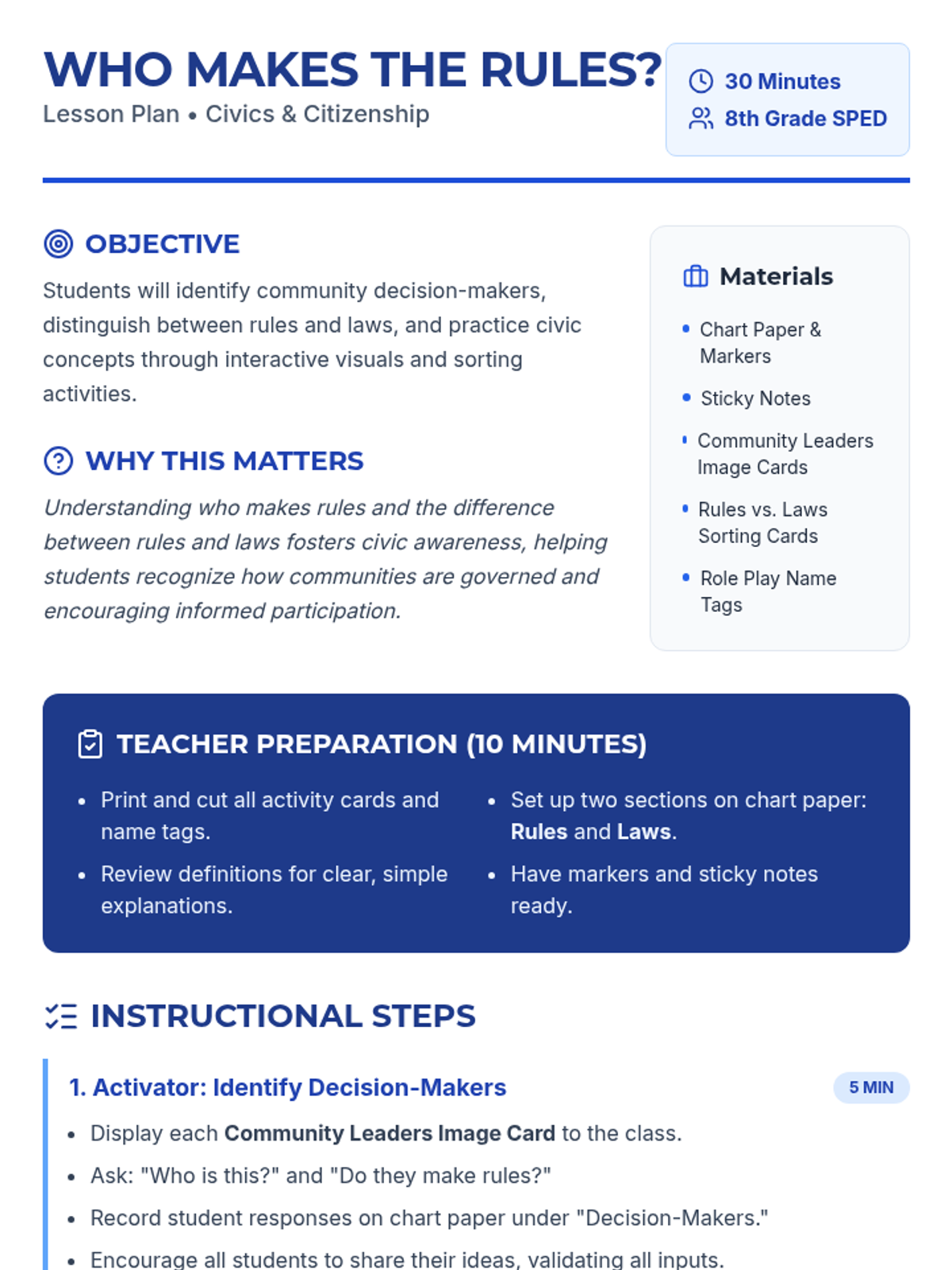 In this 30-minute Tier 1 lesson for 8th grade special needs students, learners will explore the basics of civics by understanding rules, laws, and decision-makers in their community through an interactive activator. This engaging start builds foundational civic awareness essential for informed citizenship.
