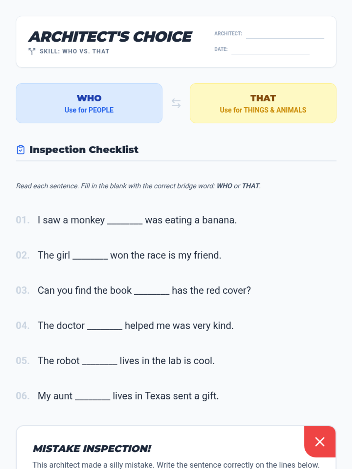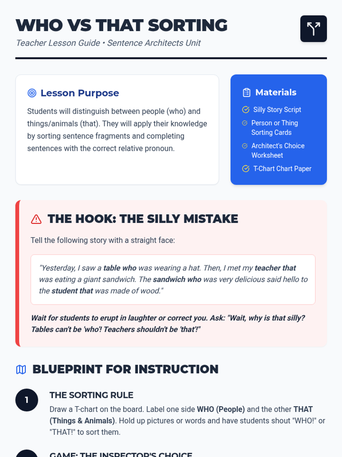 A comparative lesson where students sort and decide whether to use 'who' for people or 'that' for objects.