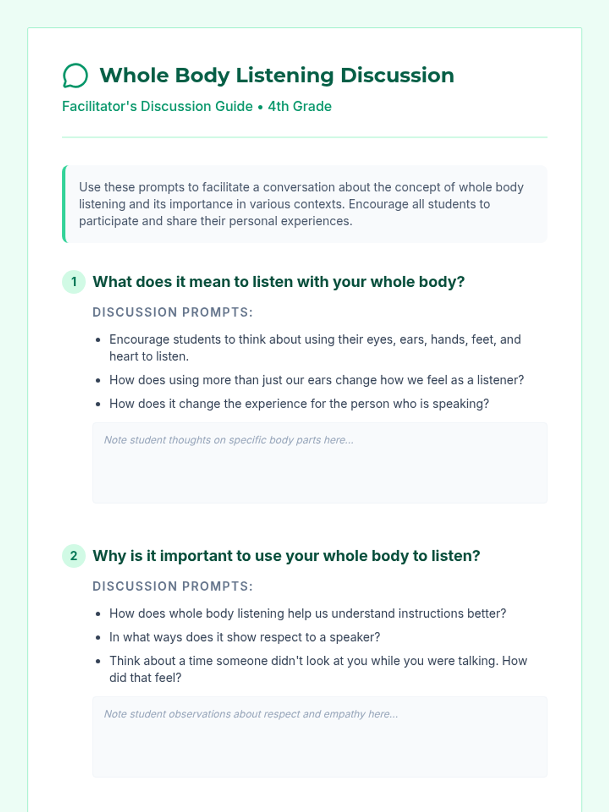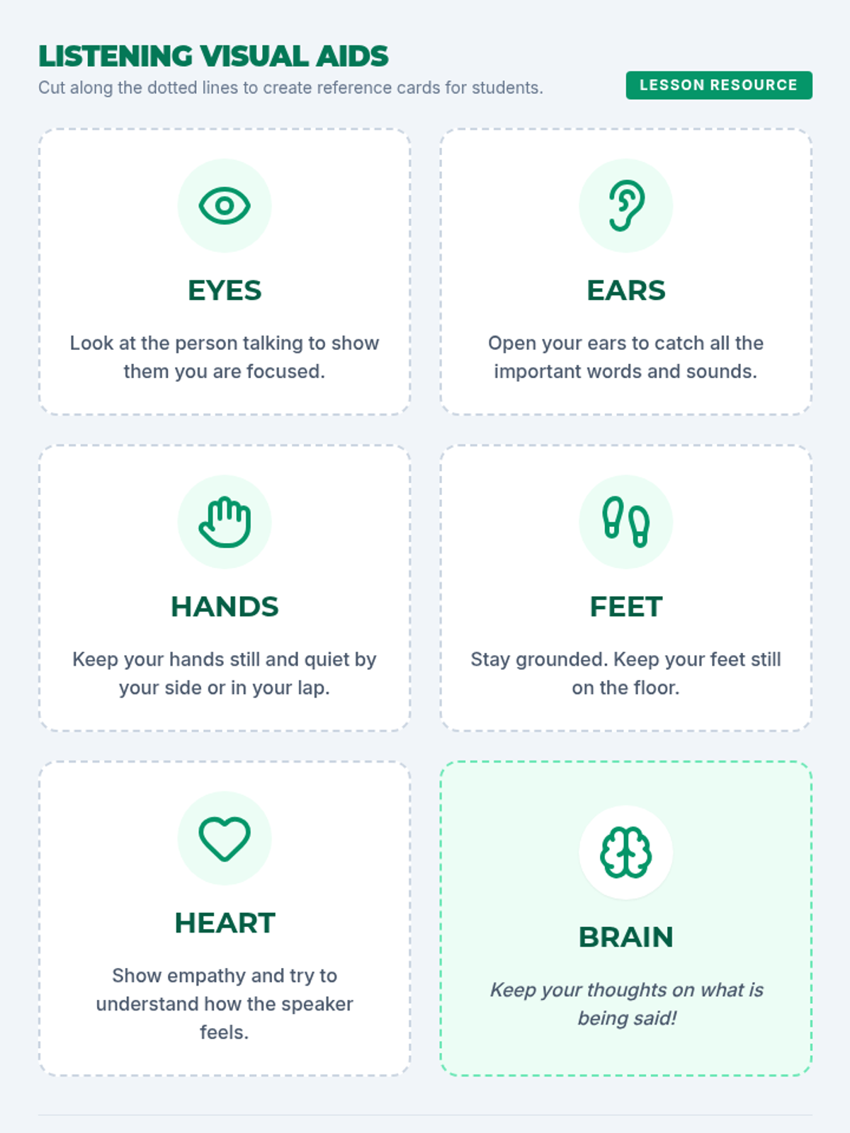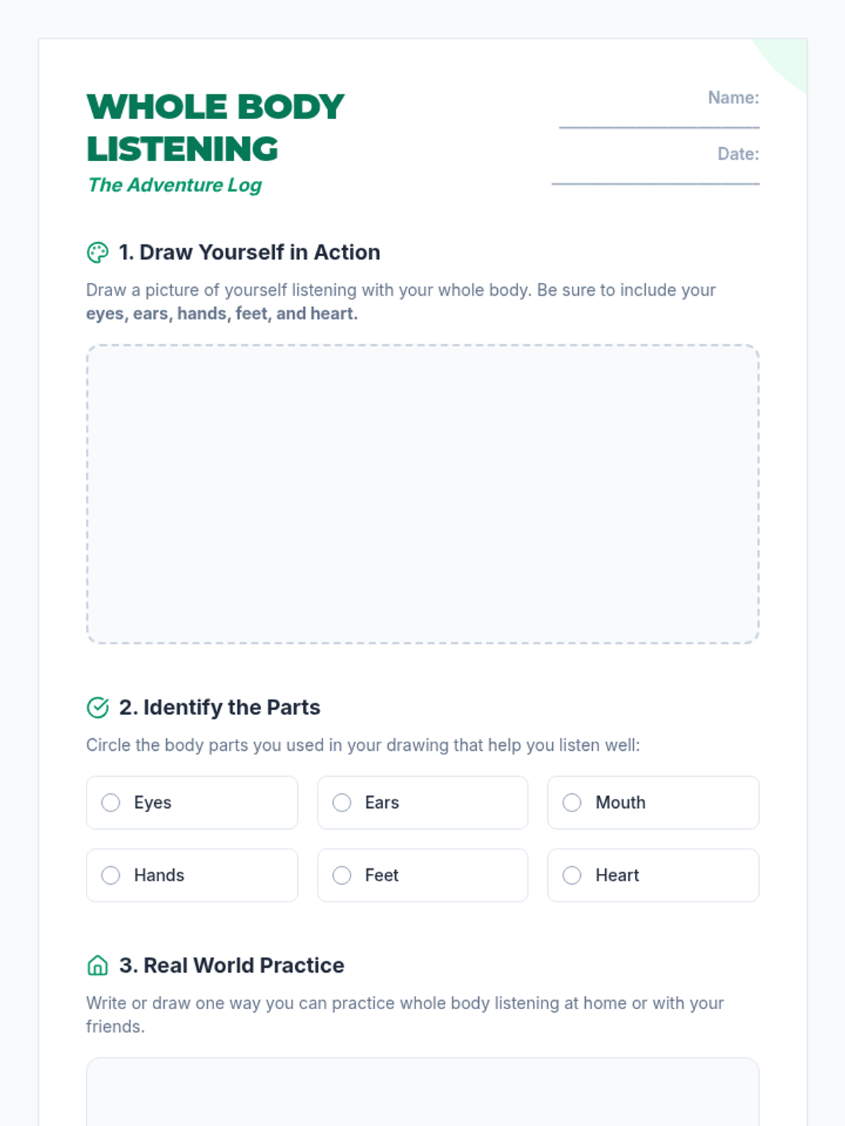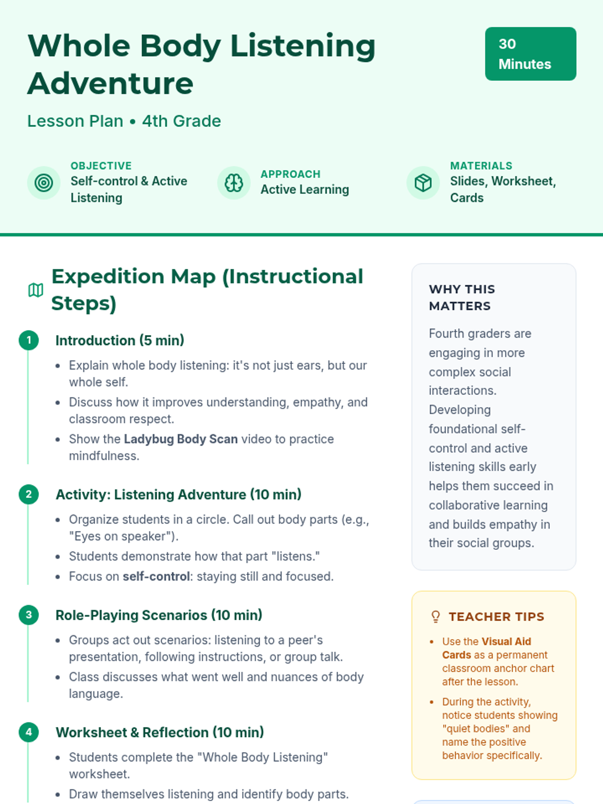 This lesson introduces 4th-grade students to whole body listening, focusing on self-control and active engagement. Students explore how different parts of their body contribute to effective communication through a video, game-based activity, and reflective worksheet.