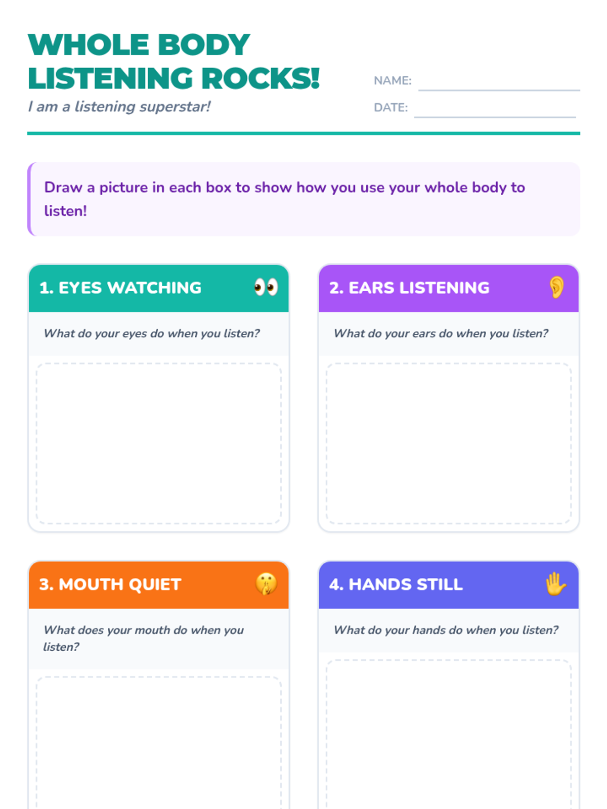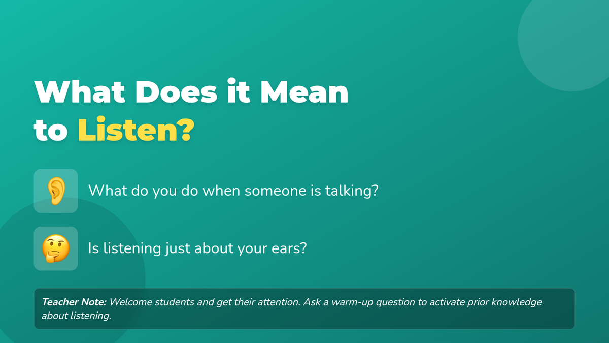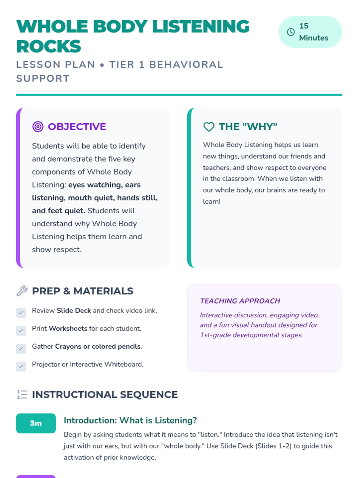 A 15-minute Tier 1 lesson for 1st-grade students to learn the five components of whole body listening: eyes, ears, mouth, hands, and feet.