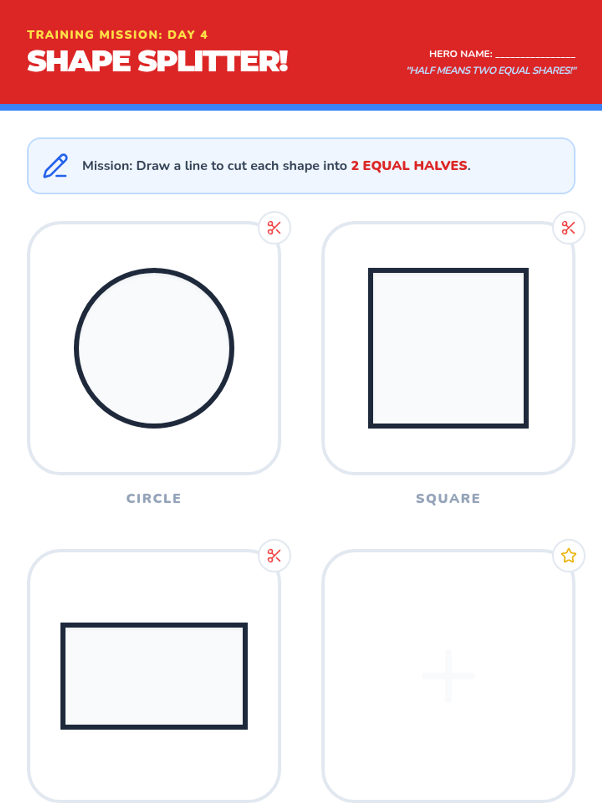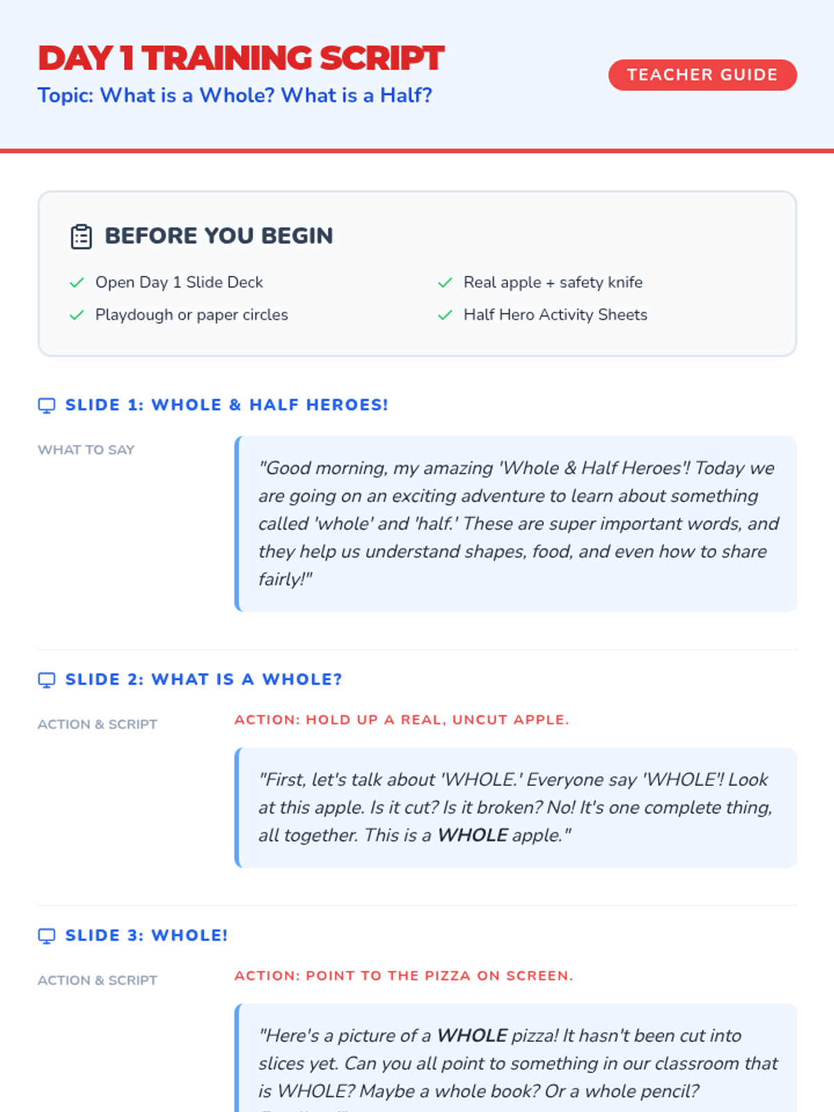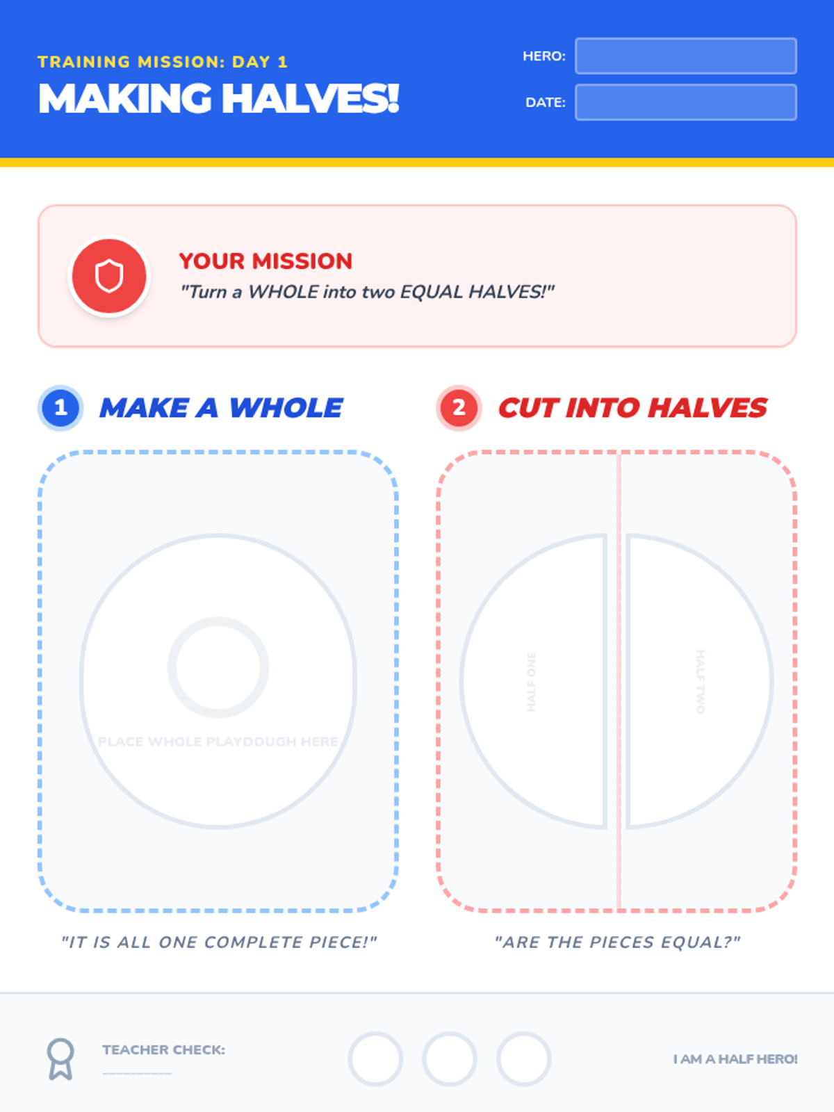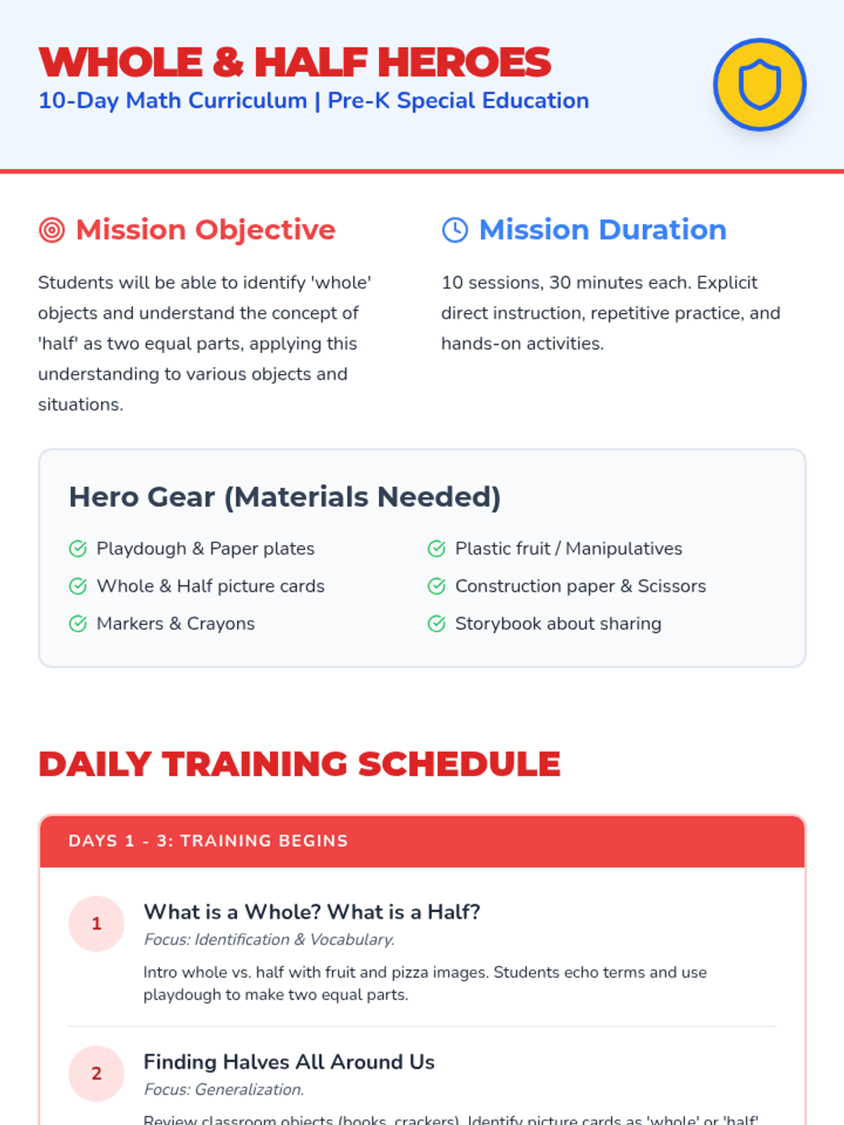 A 10-day curriculum for Pre-K special education students to learn the concepts of 'whole' and 'half' through repetitive, hands-on, superhero-themed activities.