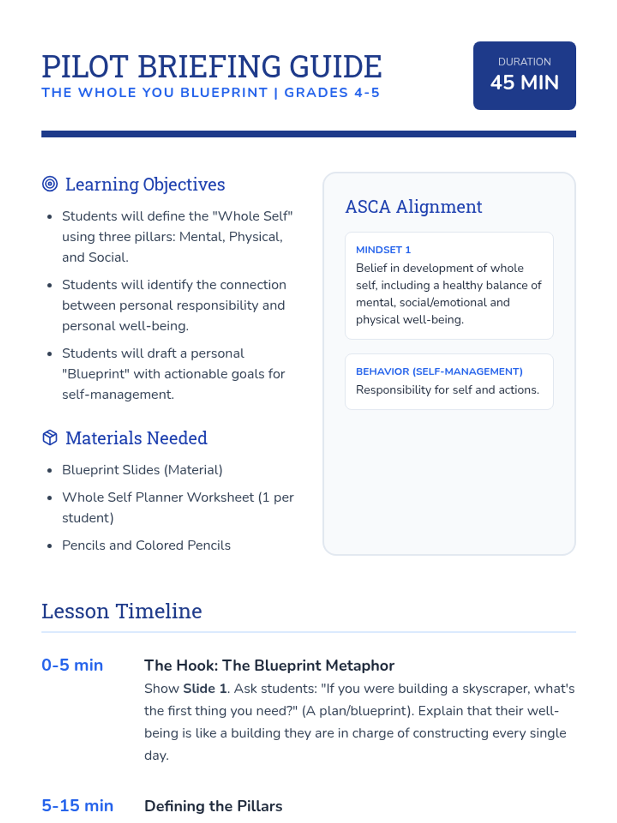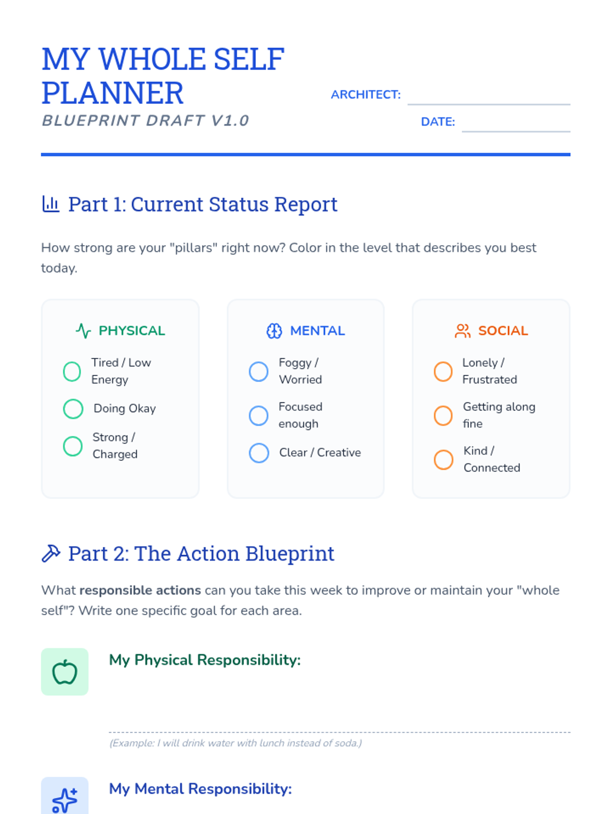 A lesson for 4th and 5th graders focused on holistic well-being and personal responsibility, teaching students to manage their physical, mental, and social health through intentional actions.