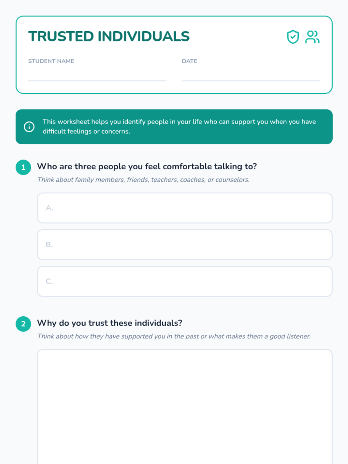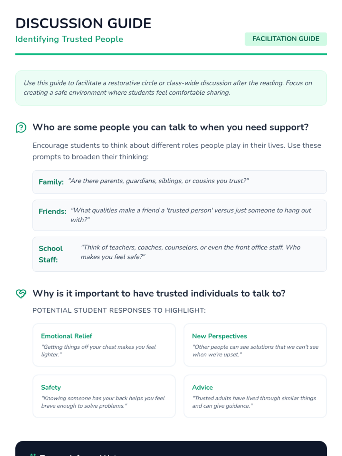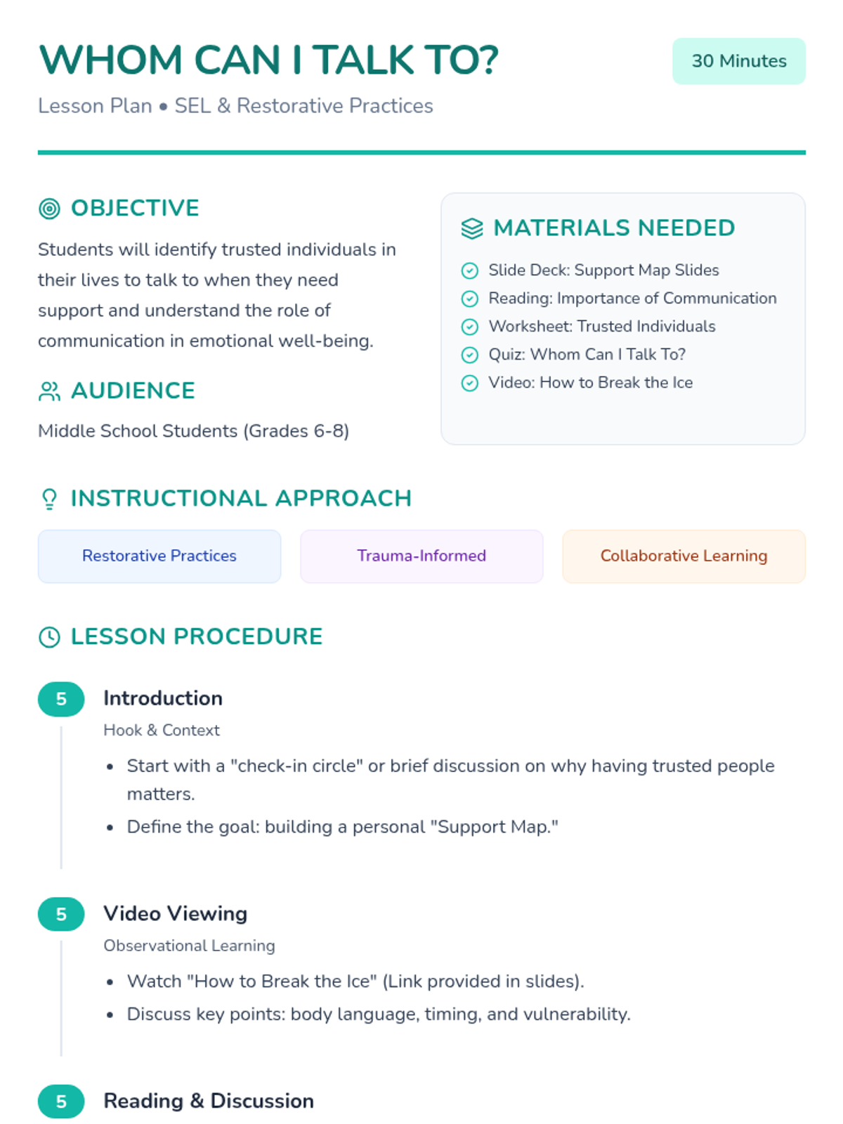 A middle school lesson focused on identifying support networks and trusted individuals to foster emotional well-being and help-seeking behaviors through restorative practices.