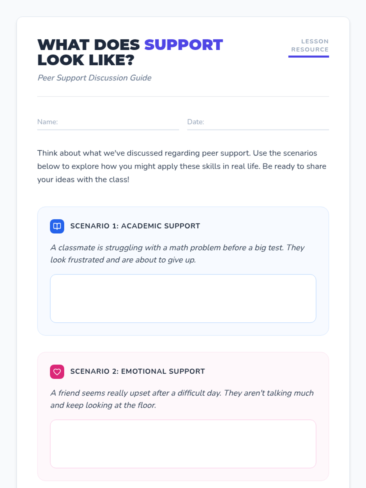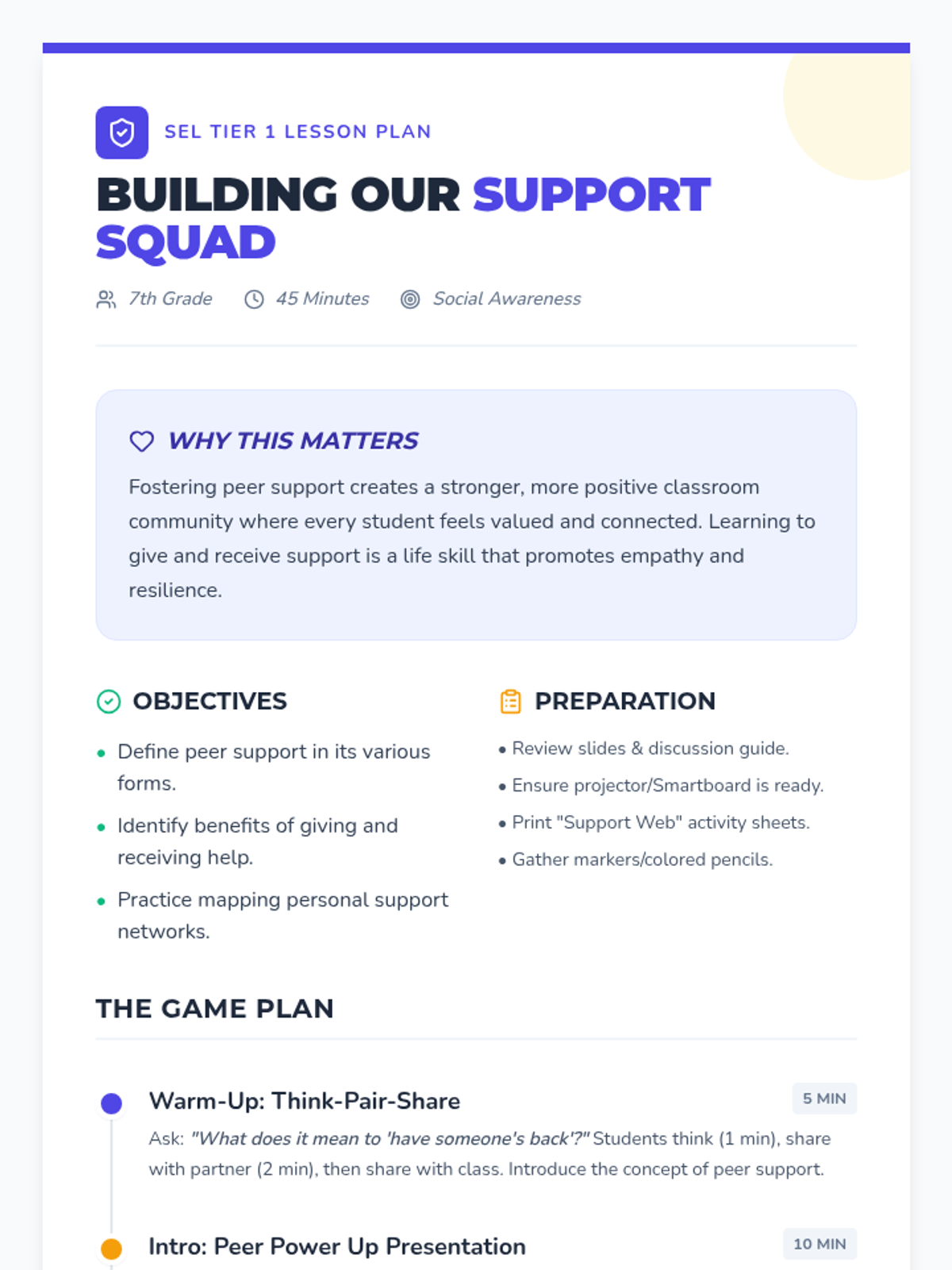 A 45-minute Tier 1 SEL lesson for 7th graders focused on the definition, benefits, and practical application of peer support to foster a positive classroom community.