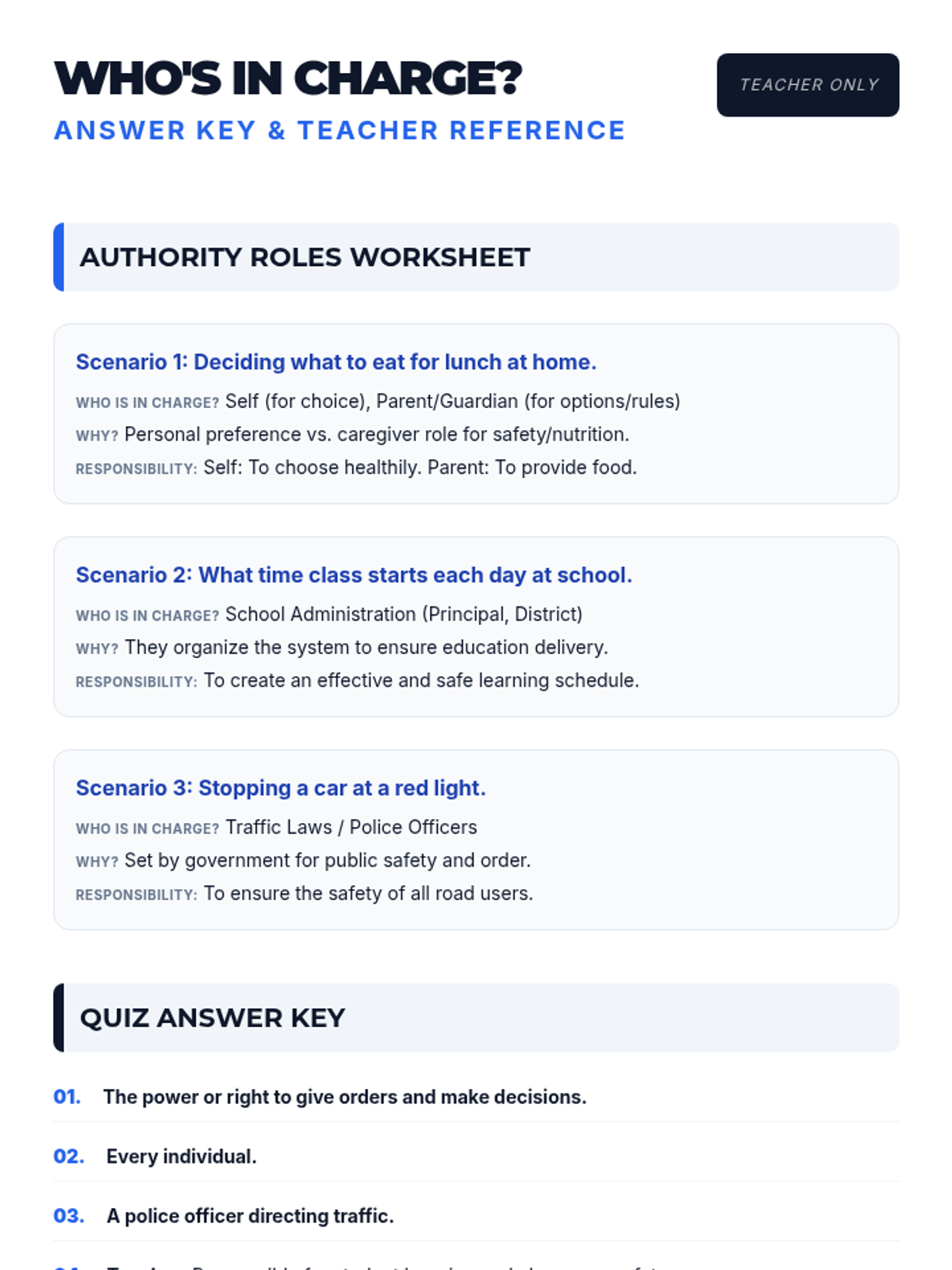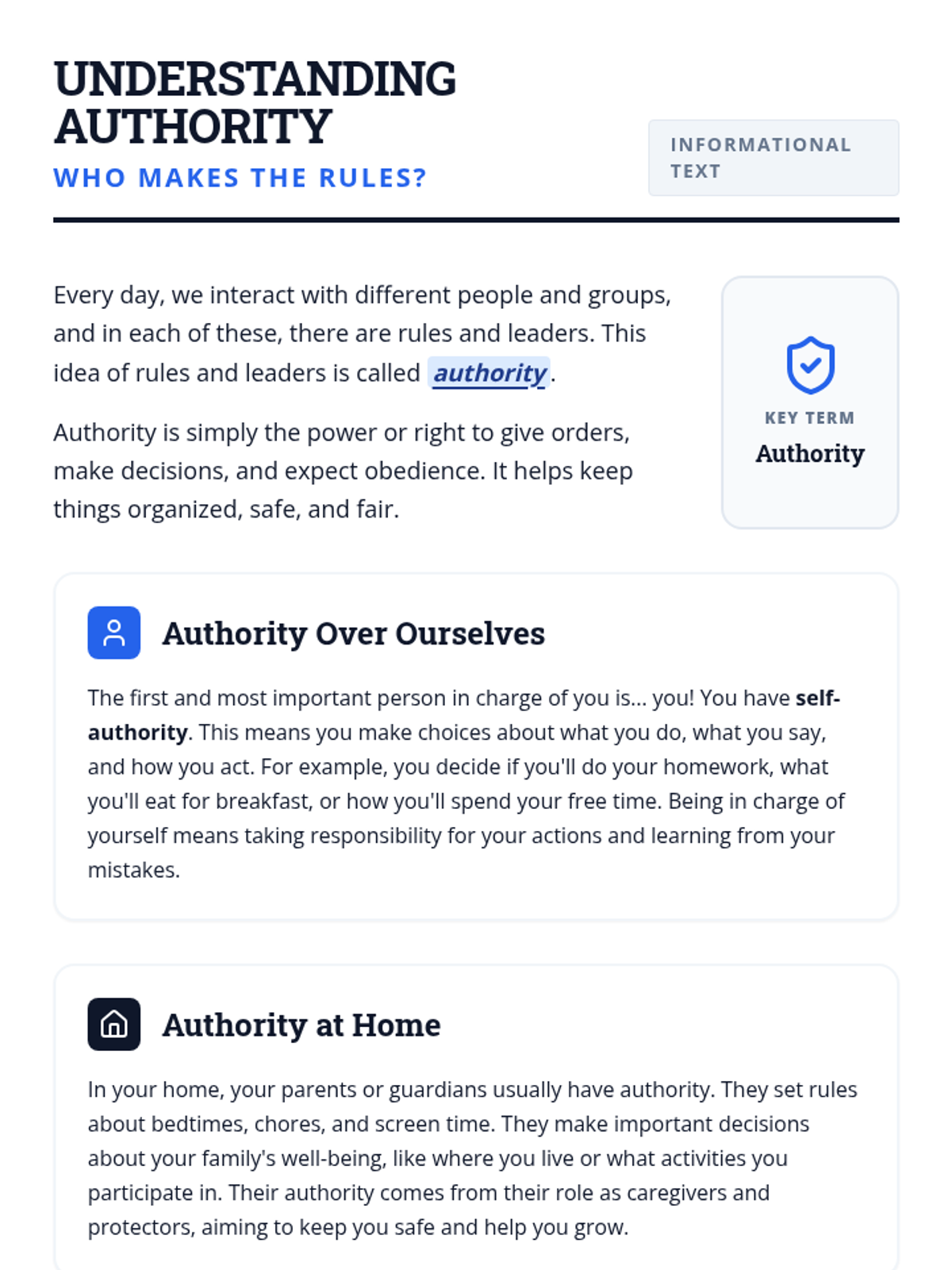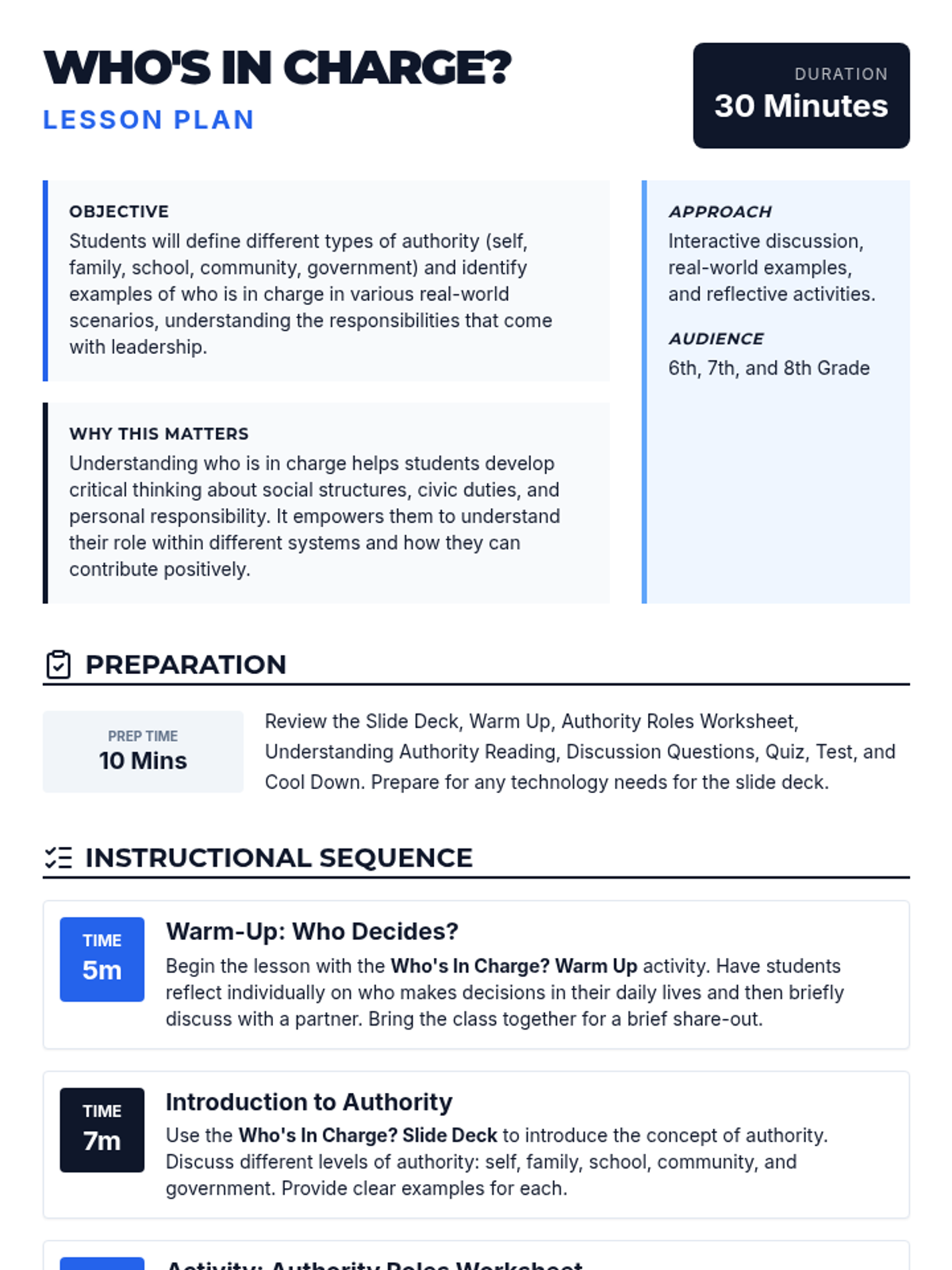 This lesson explores the concept of authority across different levels, from personal responsibility to governmental roles, helping middle school students understand the balance of power and responsibility.