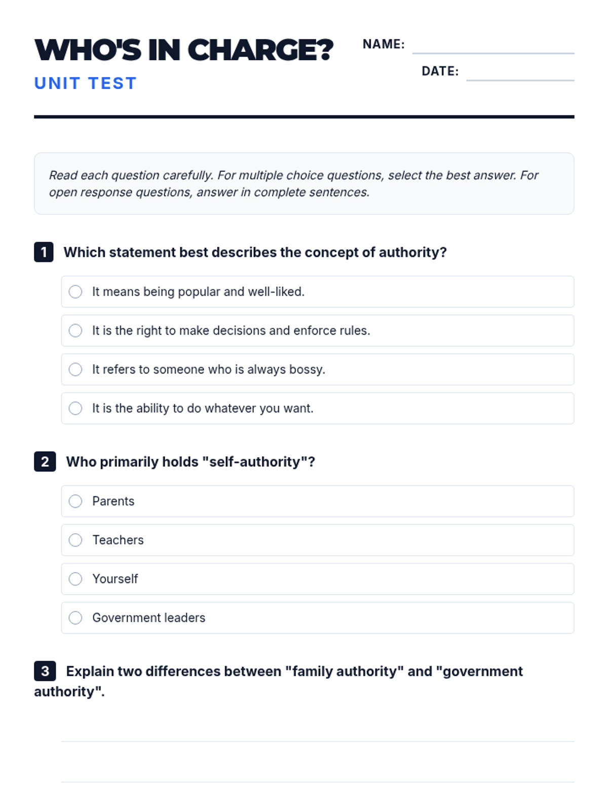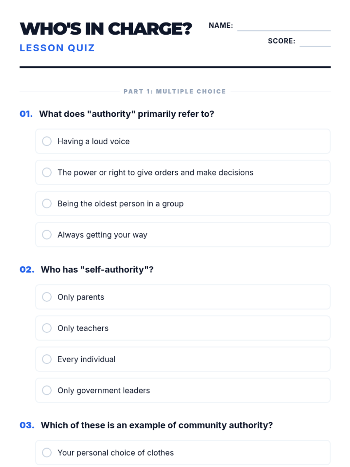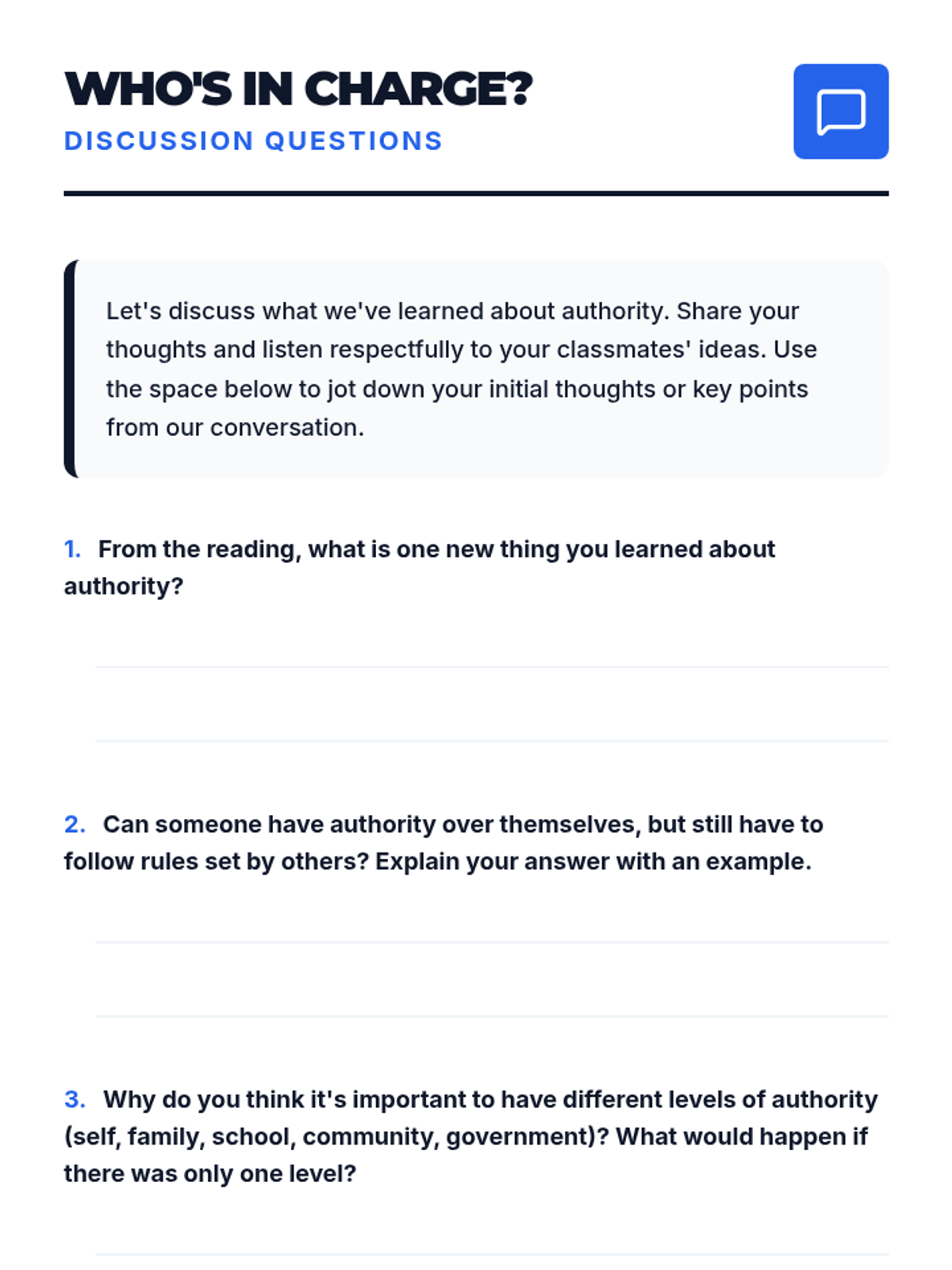 This lesson explores the concept of authority across different levels, from personal responsibility to governmental roles, helping middle school students understand the balance of power and responsibility.