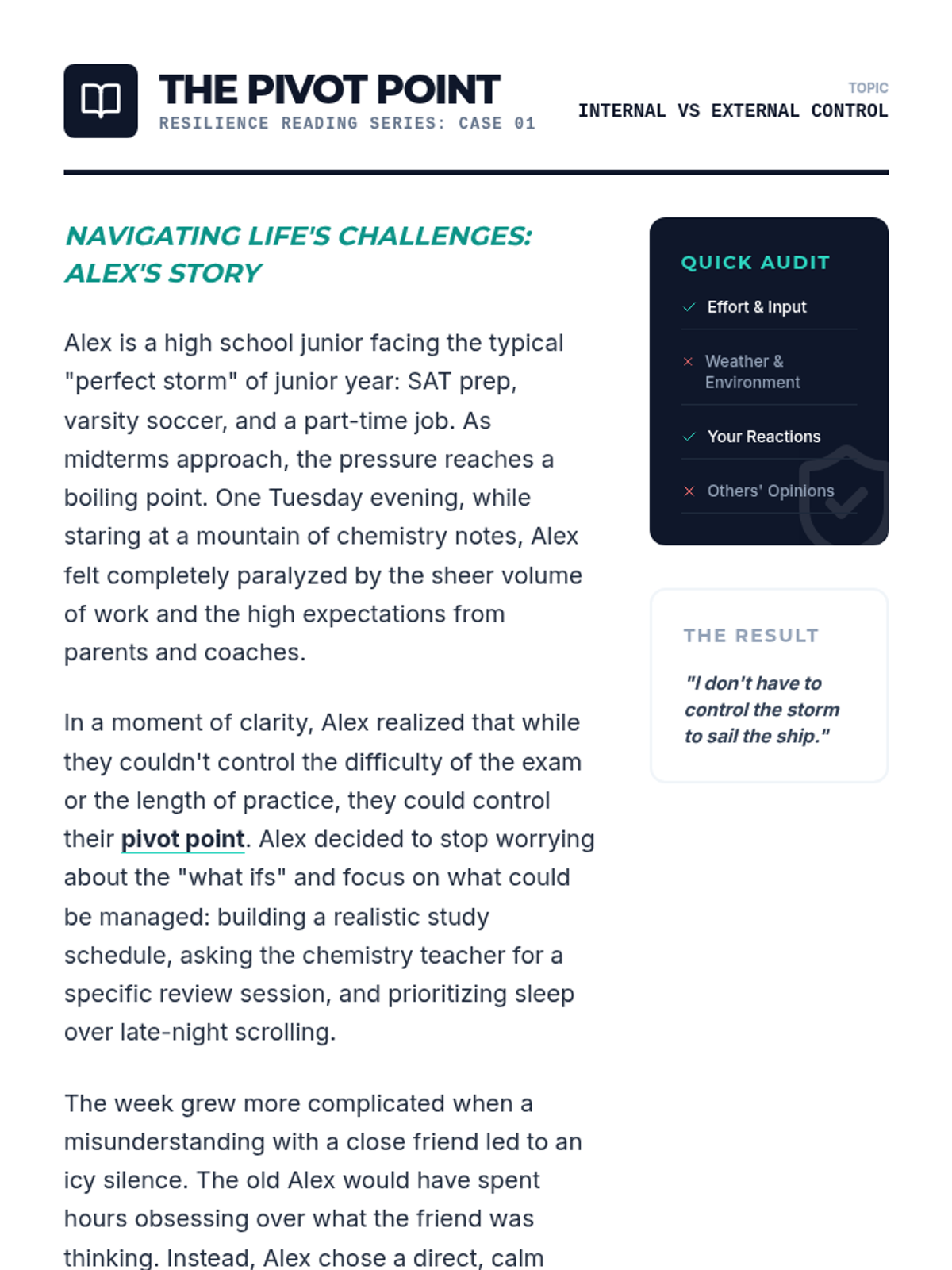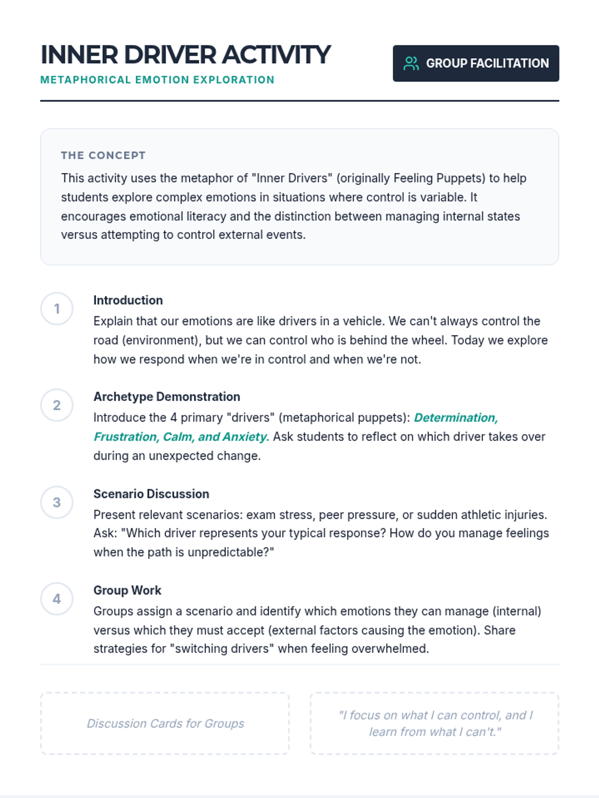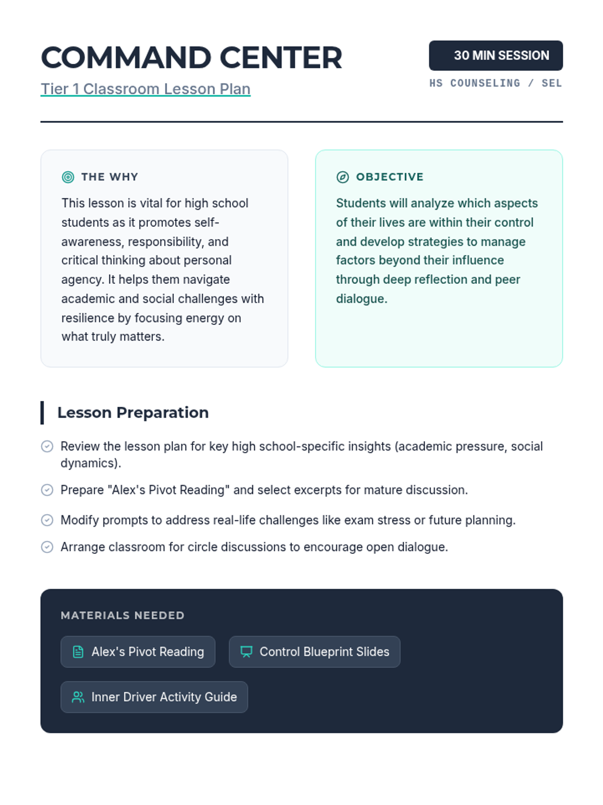 A 30-minute Tier 1 lesson for high schoolers exploring the circle of control to build resilience and emotional intelligence. Students learn to differentiate between what they can change and what they must accept through a case study and reflective discussion.