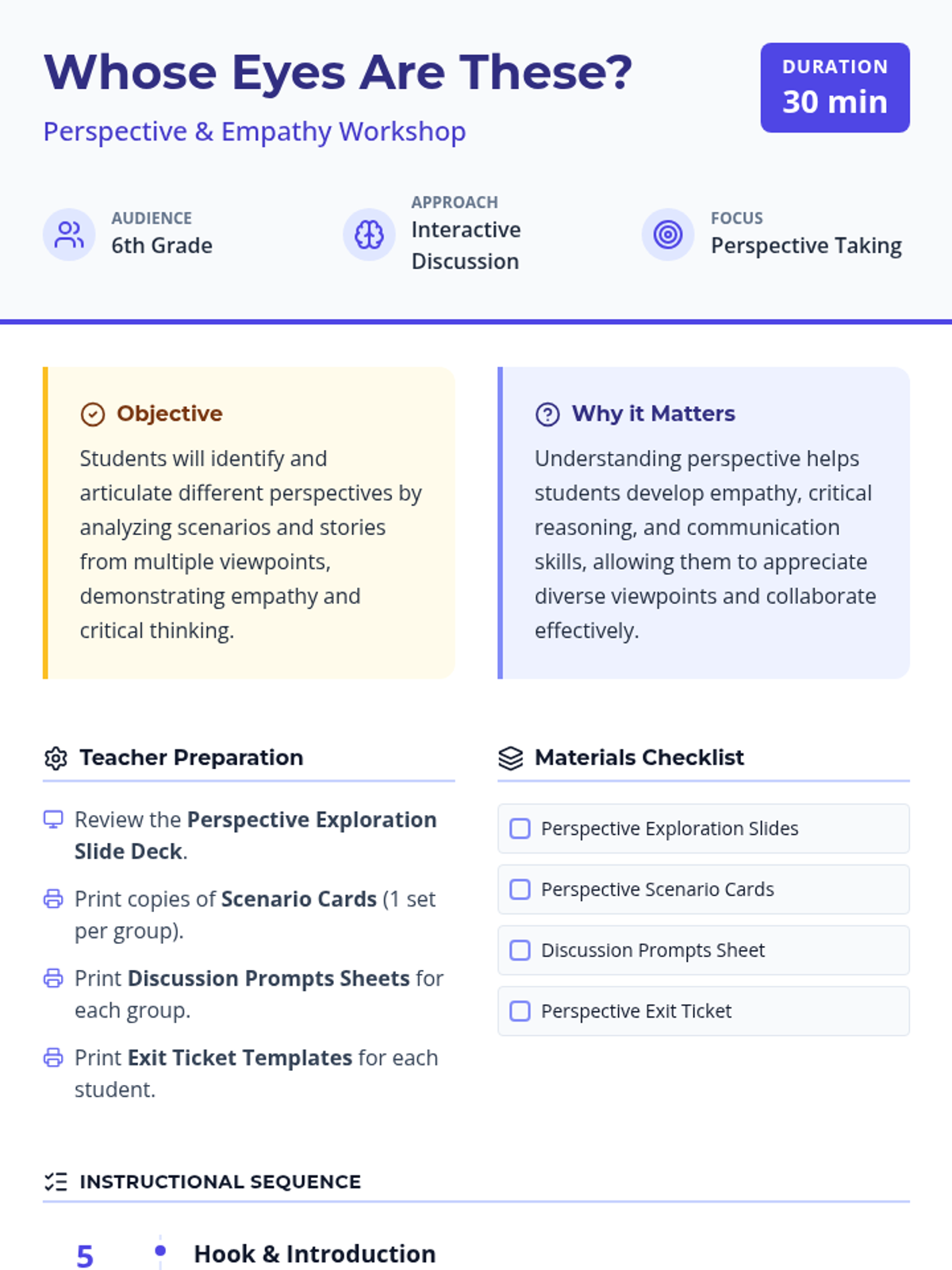 In this 30-minute lesson, 6th graders explore perspective-taking by analyzing stories and real-life scenarios through different viewpoints. Students develop empathy and critical thinking skills by identifying how backgrounds and emotions shape individual interpretations of the same event.