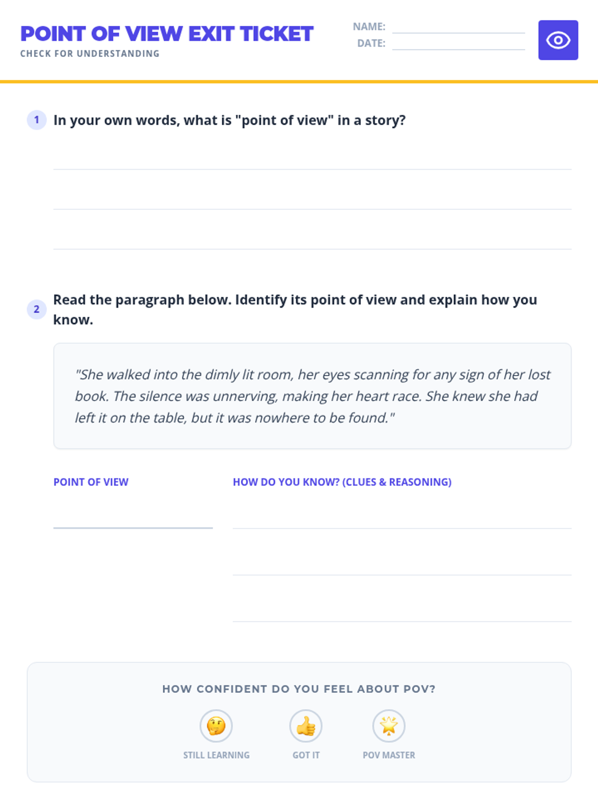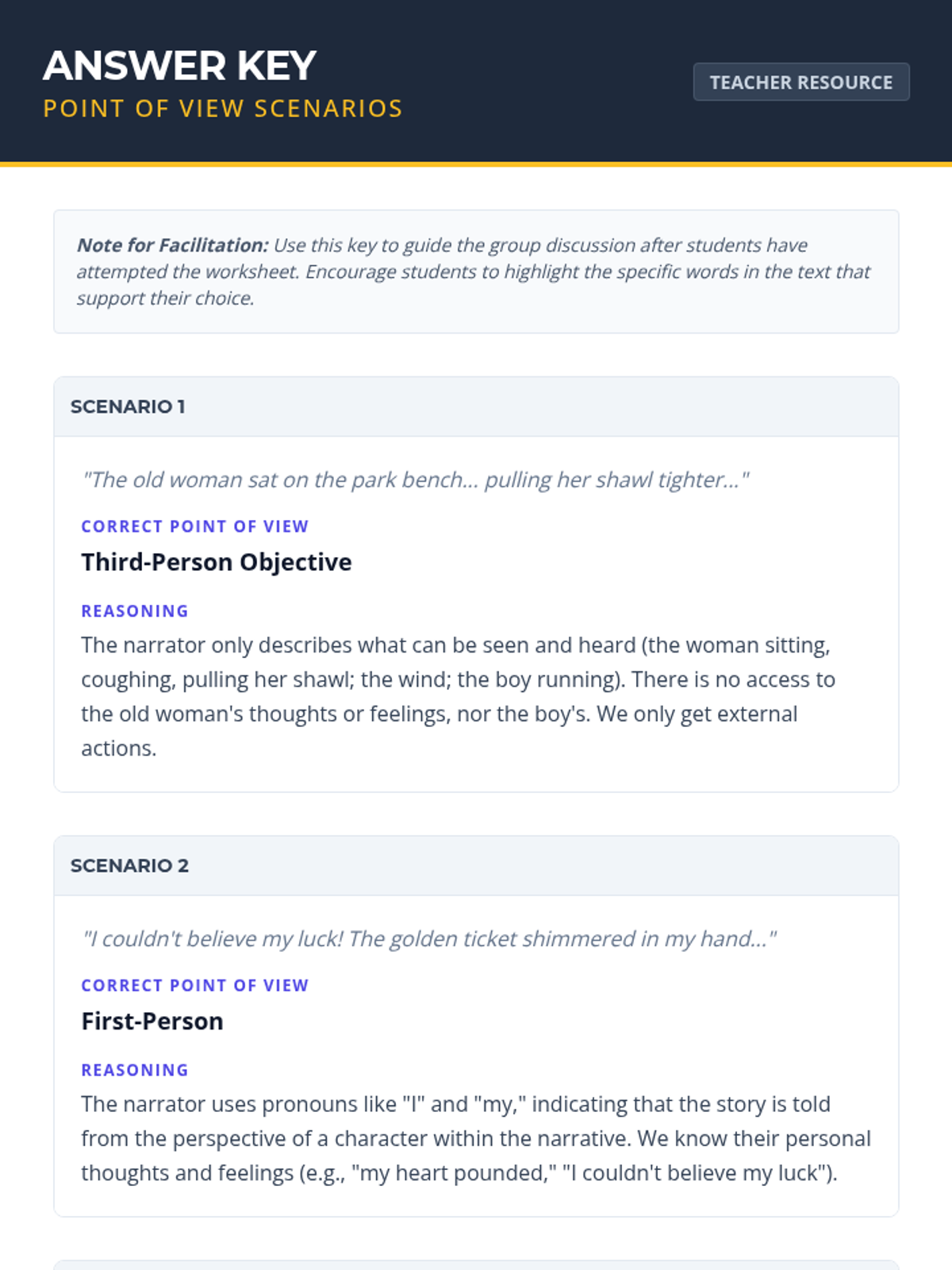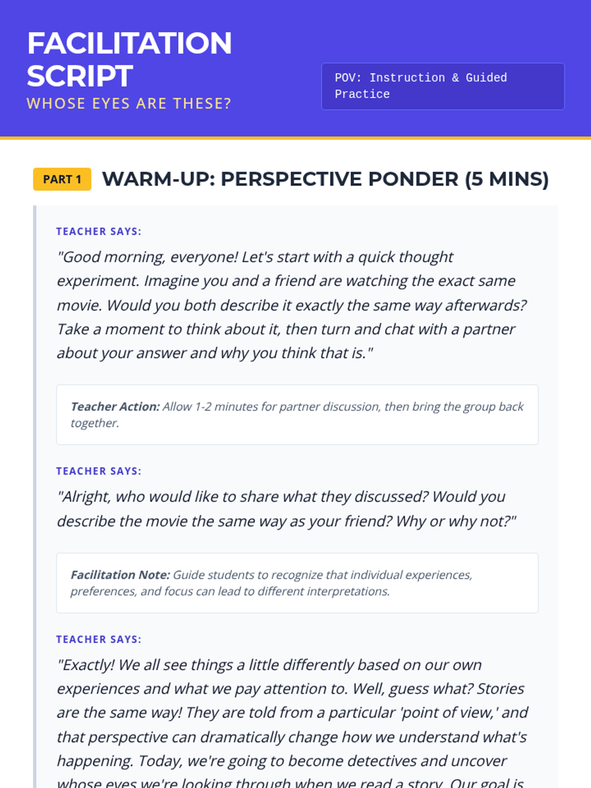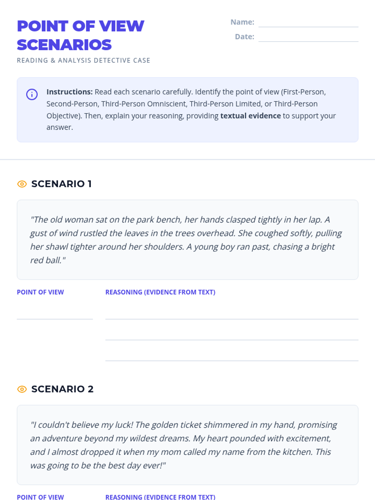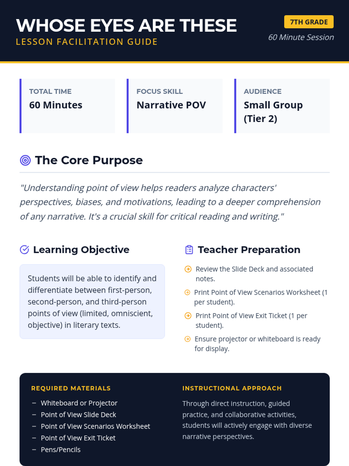 A comprehensive 60-minute lesson for 7th-grade students on identifying and differentiating between narrative points of view. Includes interactive instruction, scenario analysis, and a creative rewriting activity.