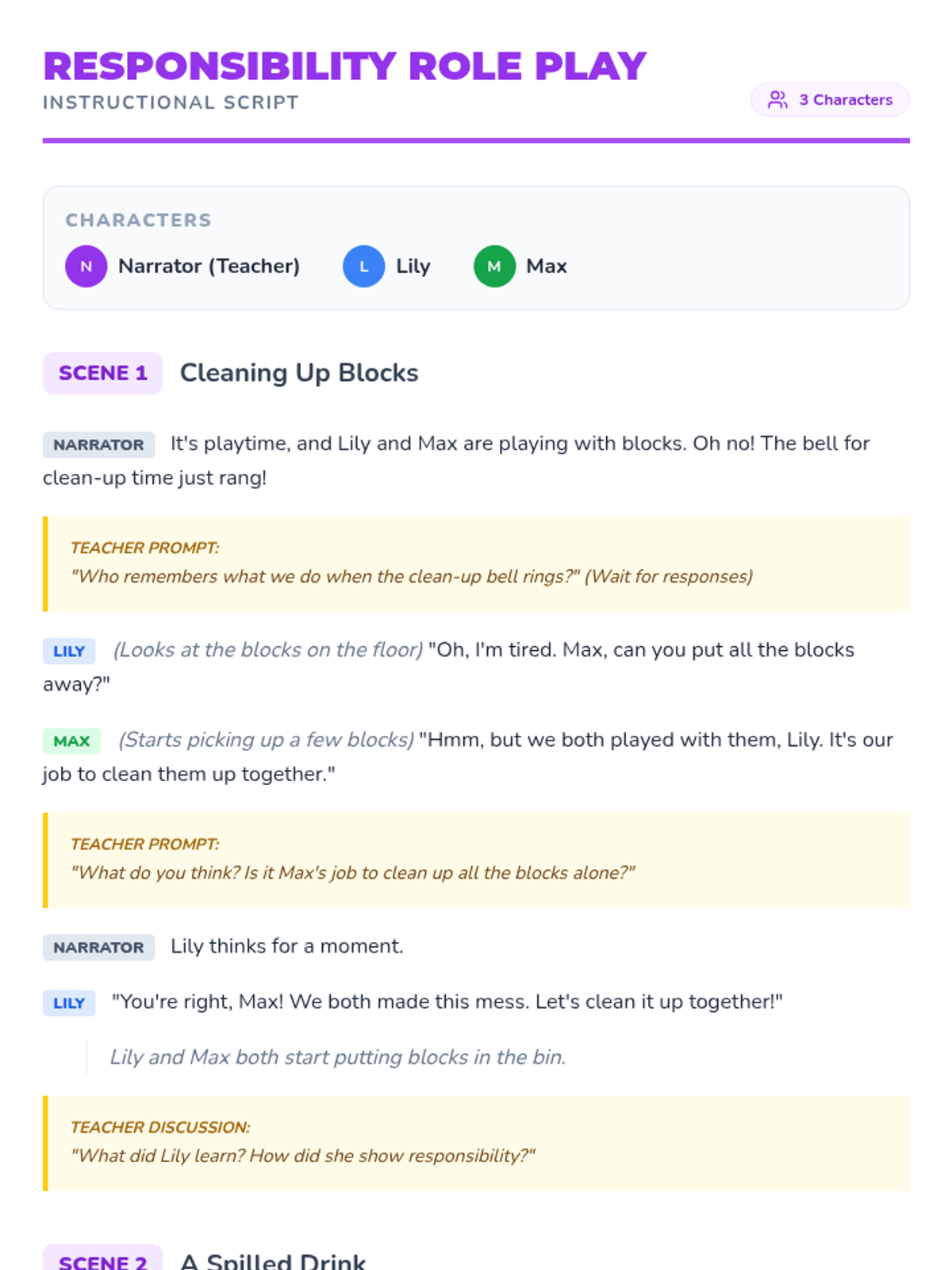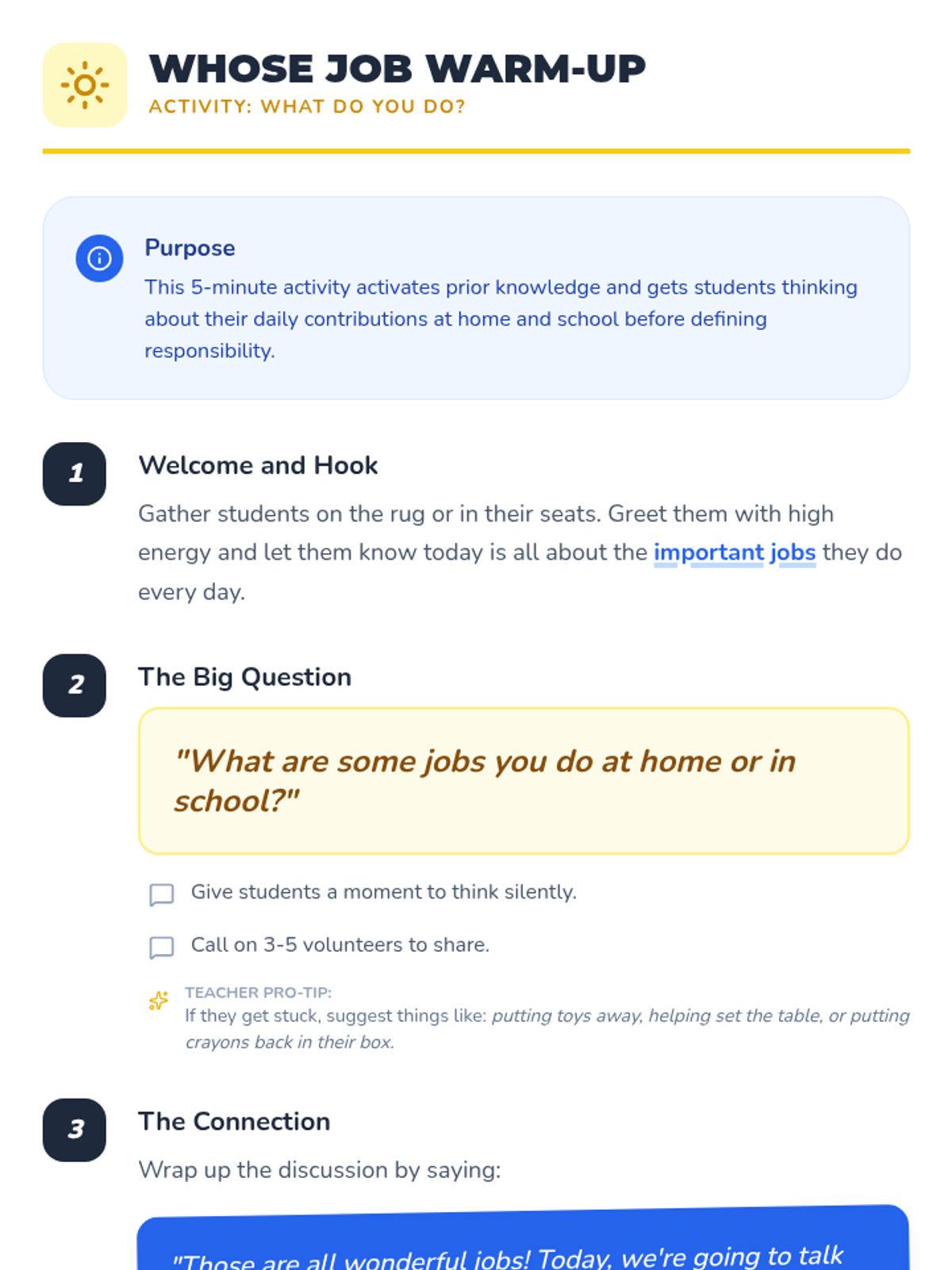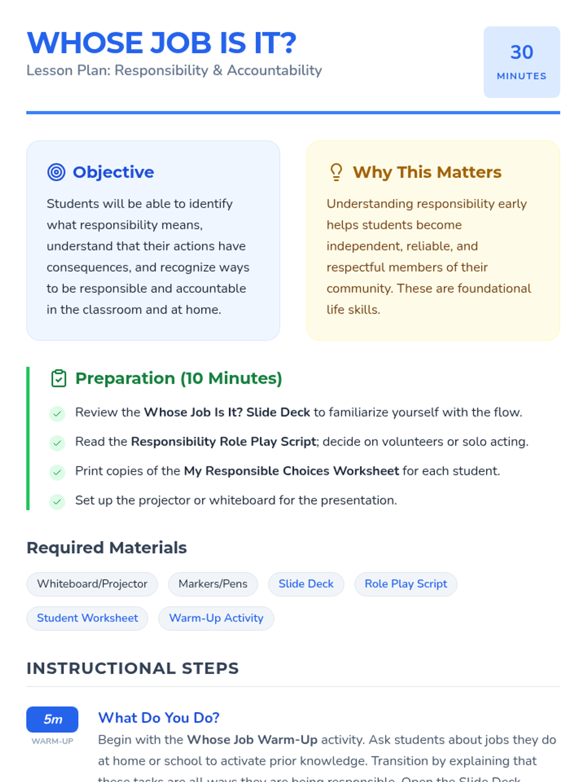 A 30-minute kindergarten lesson on responsibility and accountability, exploring daily tasks and the importance of doing one's part through discussion, role-play, and creative reflection.
