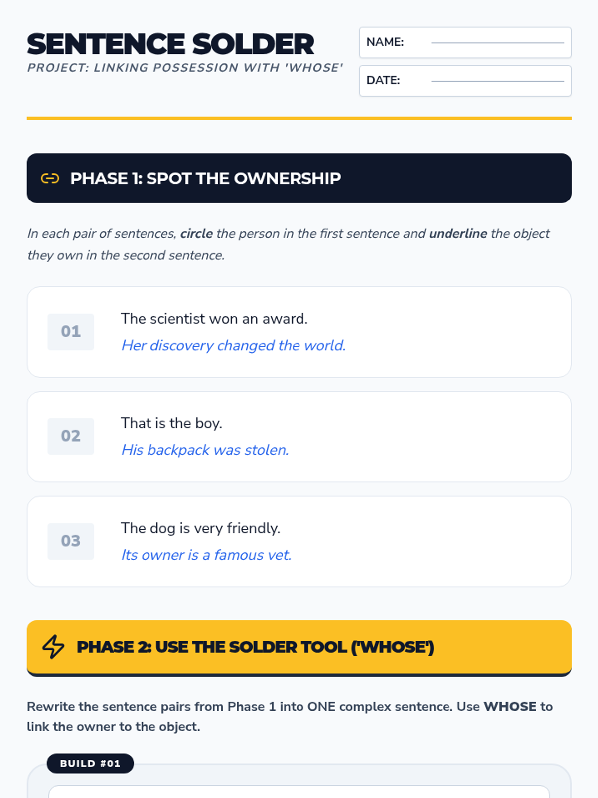 Students focus on 'whose' to show possession within a relative clause. They practice combining two sentences where ownership is the link (e.g., 'The boy is happy. His bike is new.' becomes 'The boy whose bike is new is happy.').