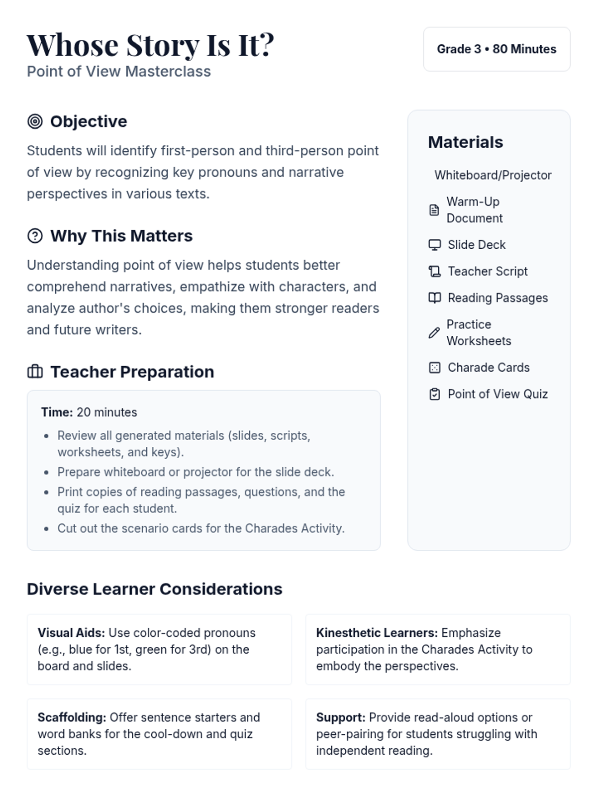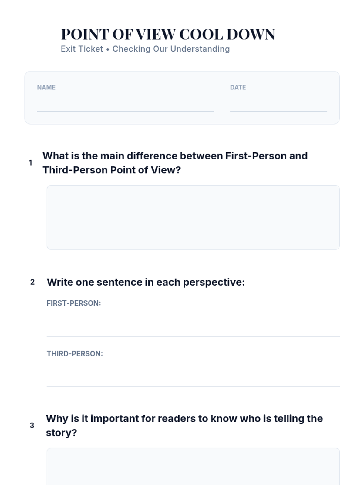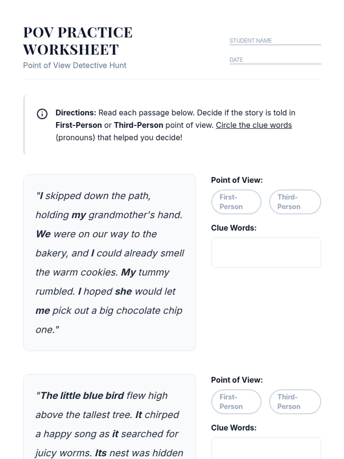 This lesson helps 3rd-grade students identify the use of first- and third-person point of view in stories. Students will learn to recognize key pronouns and analyze narrative perspectives to deepen their comprehension and character analysis skills.