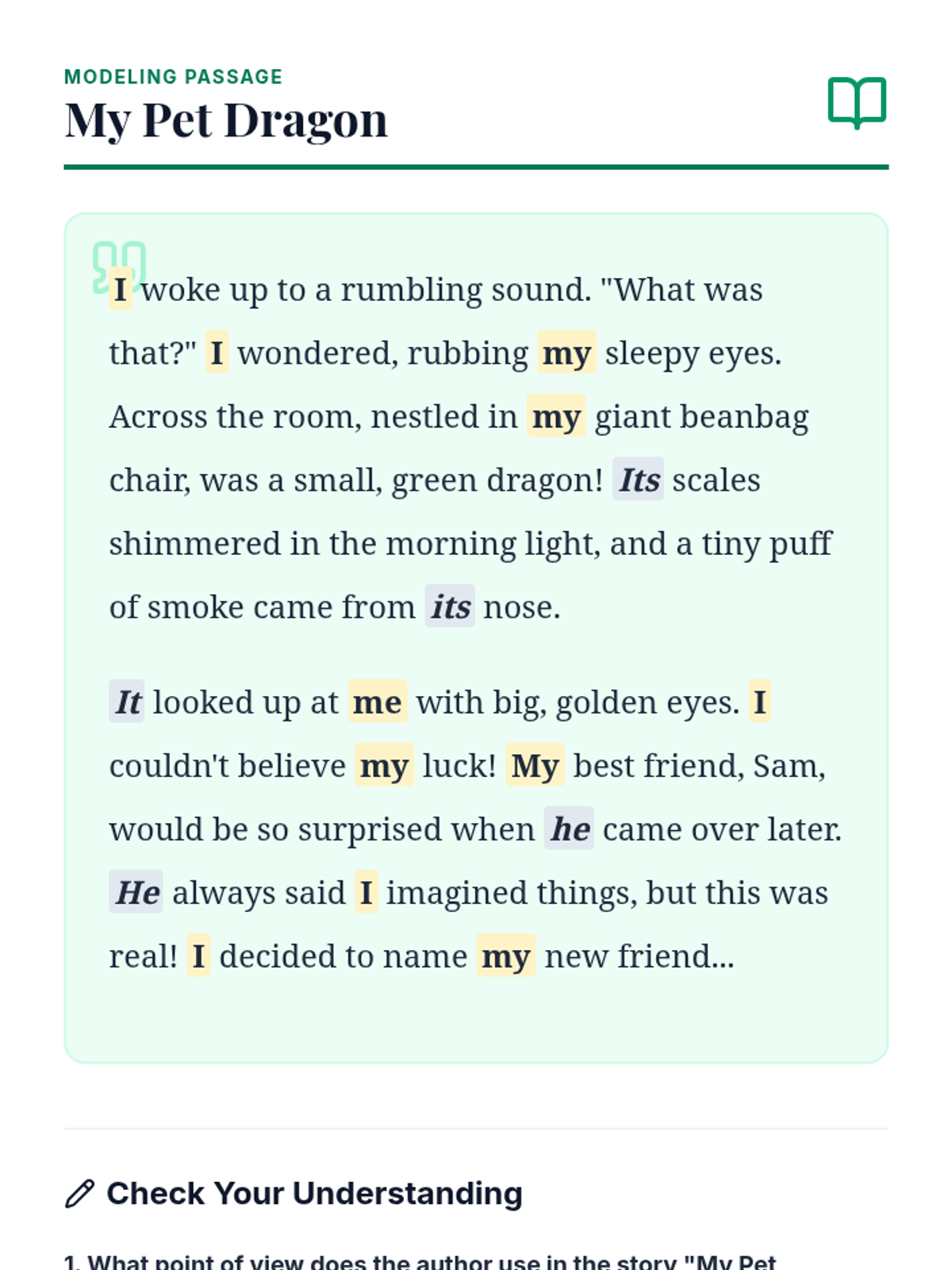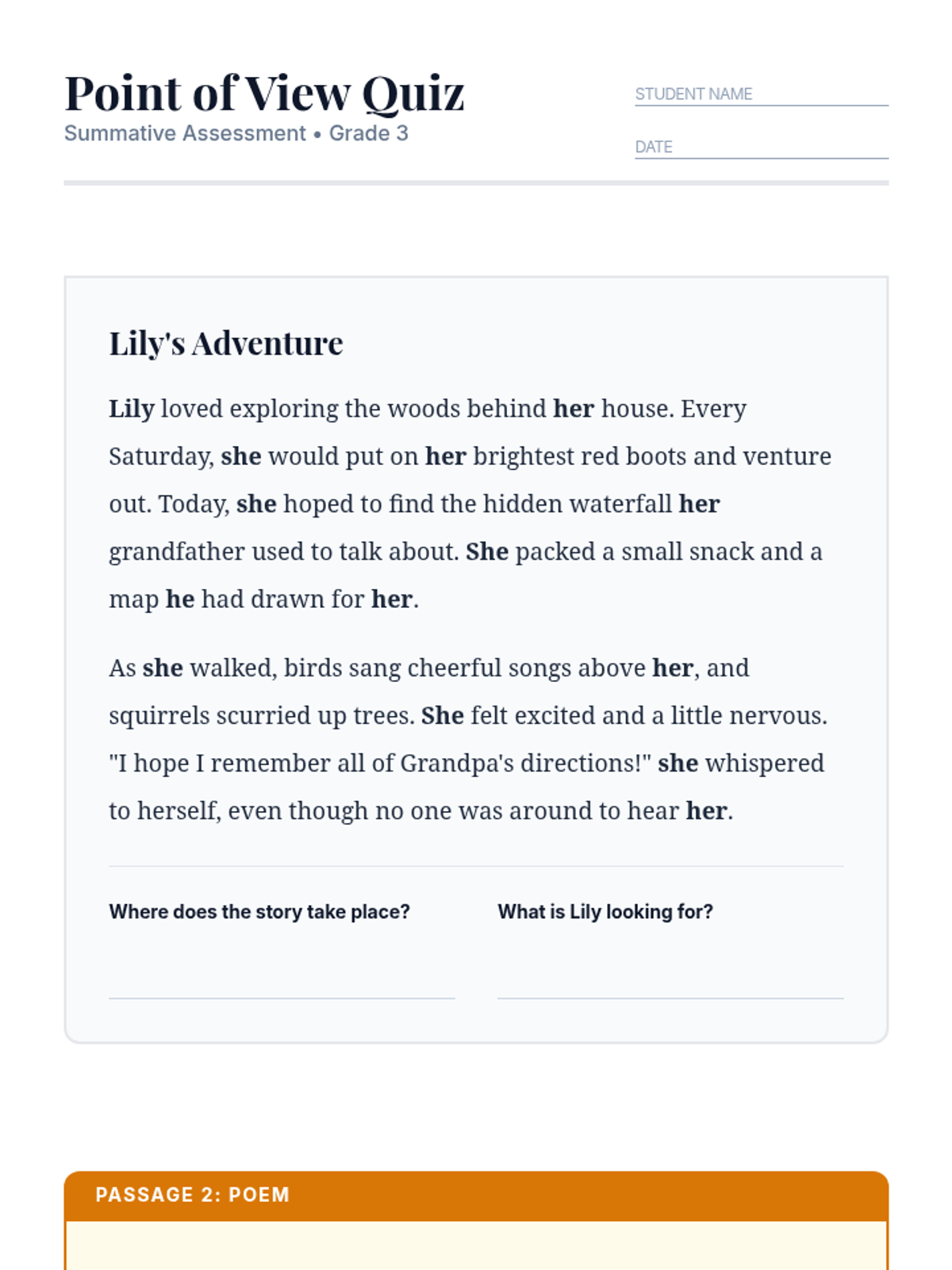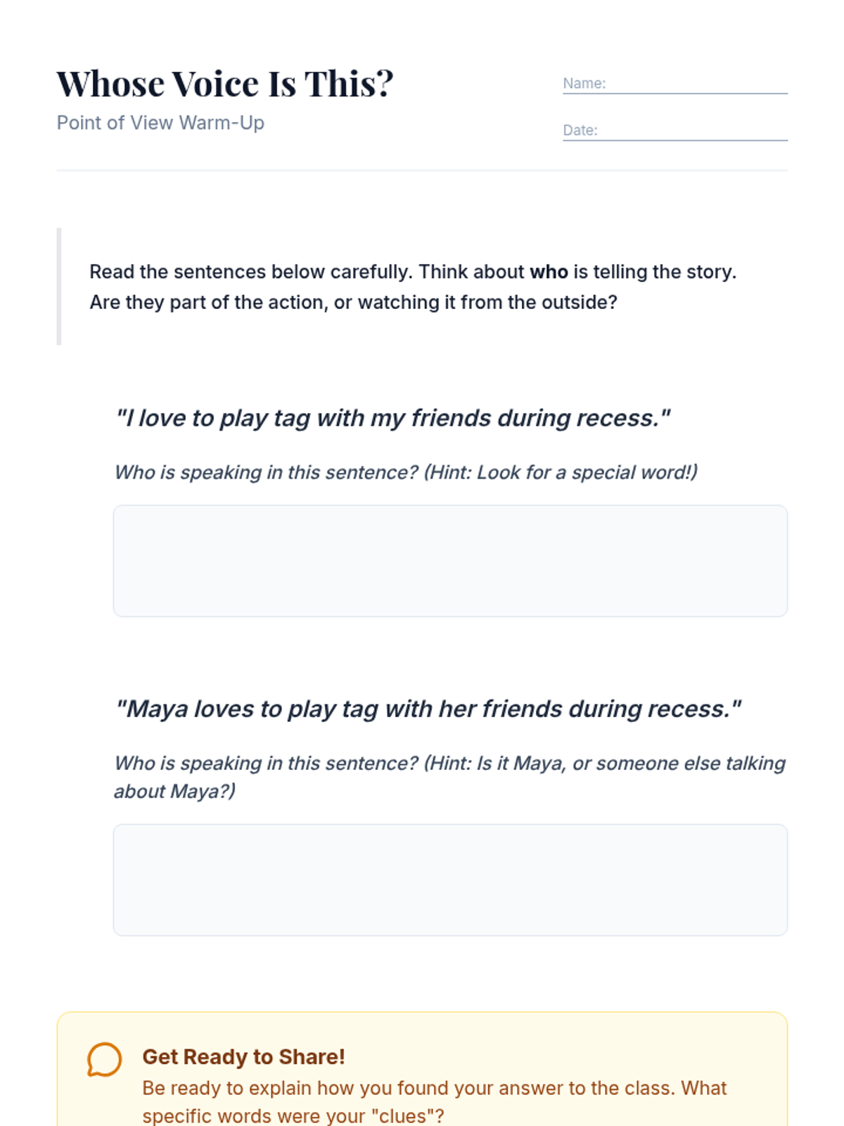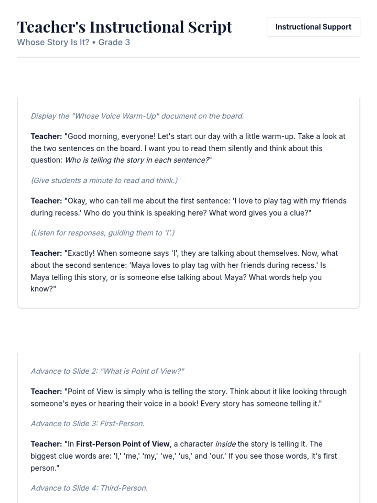 This lesson helps 3rd-grade students identify the use of first- and third-person point of view in stories. Students will learn to recognize key pronouns and analyze narrative perspectives to deepen their comprehension and character analysis skills.