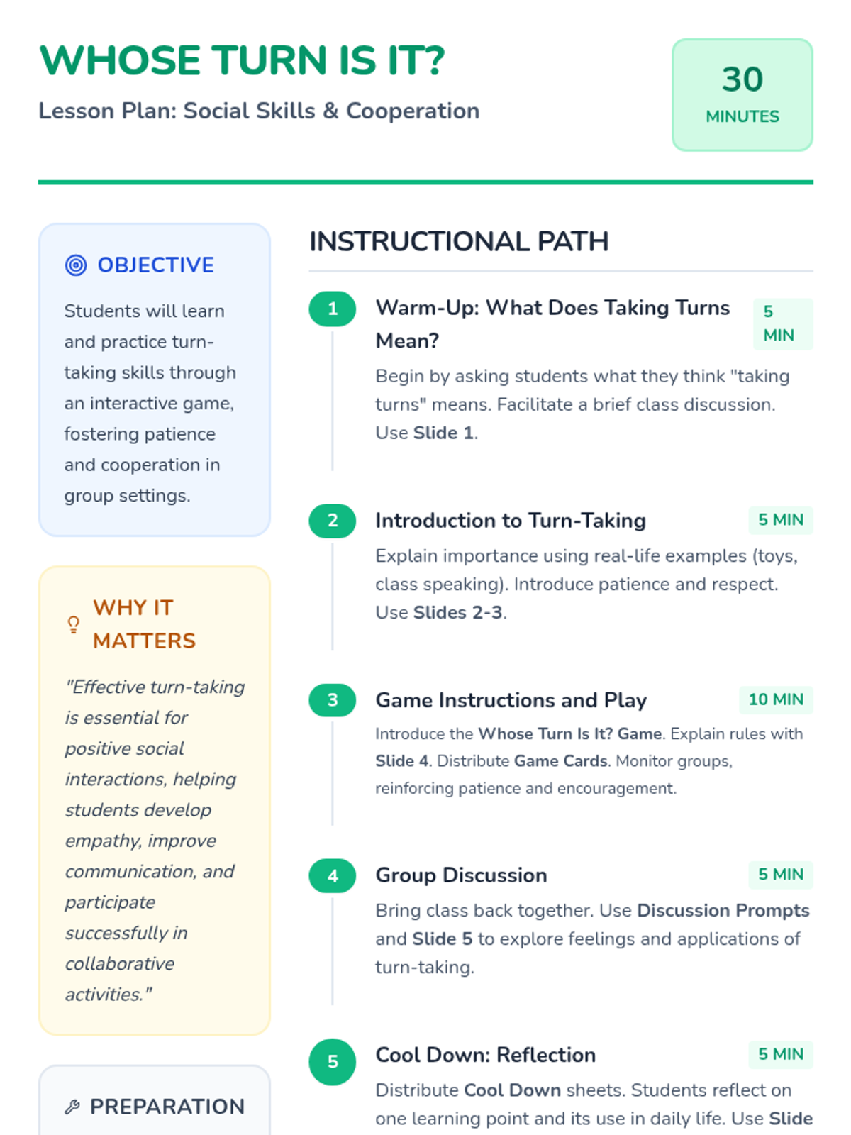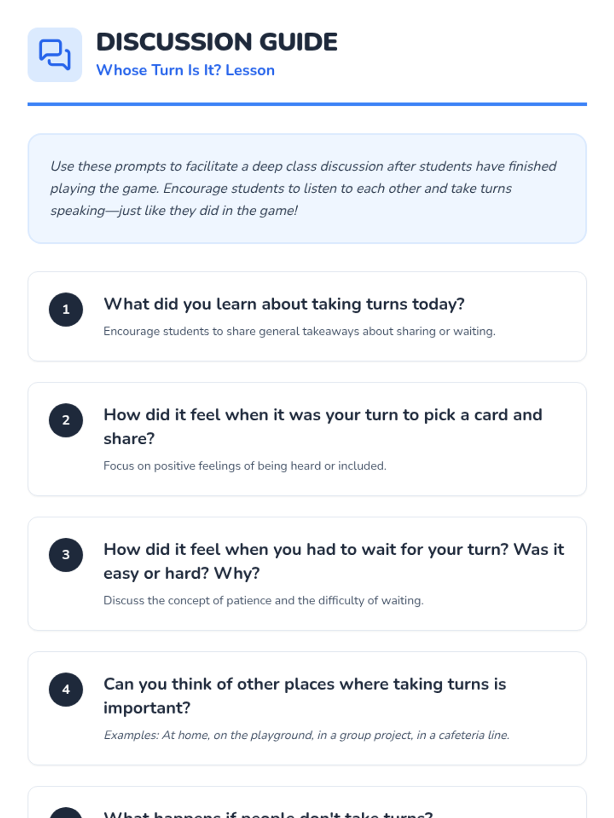 This lesson introduces elementary students to turn-taking through instruction and a collaborative card game, focusing on patience and respect.