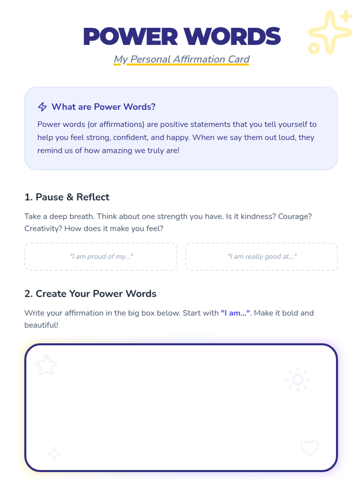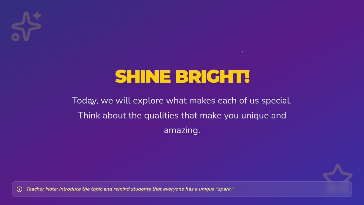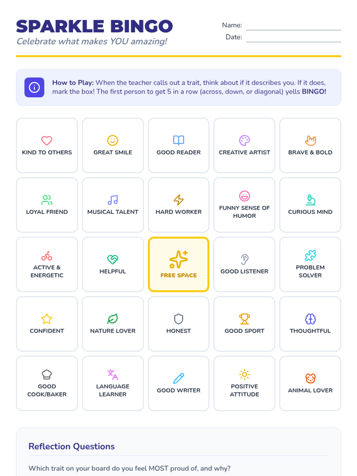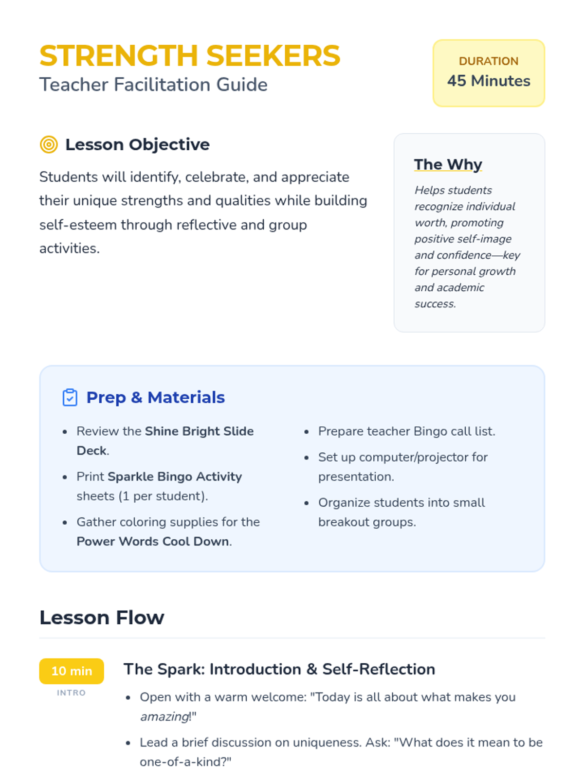 A 45-minute 4th-grade lesson focused on self-esteem and recognizing personal strengths. Students engage in guided reflection, a slide-based discussion, an interactive bingo game, and a final affirmation exercise.