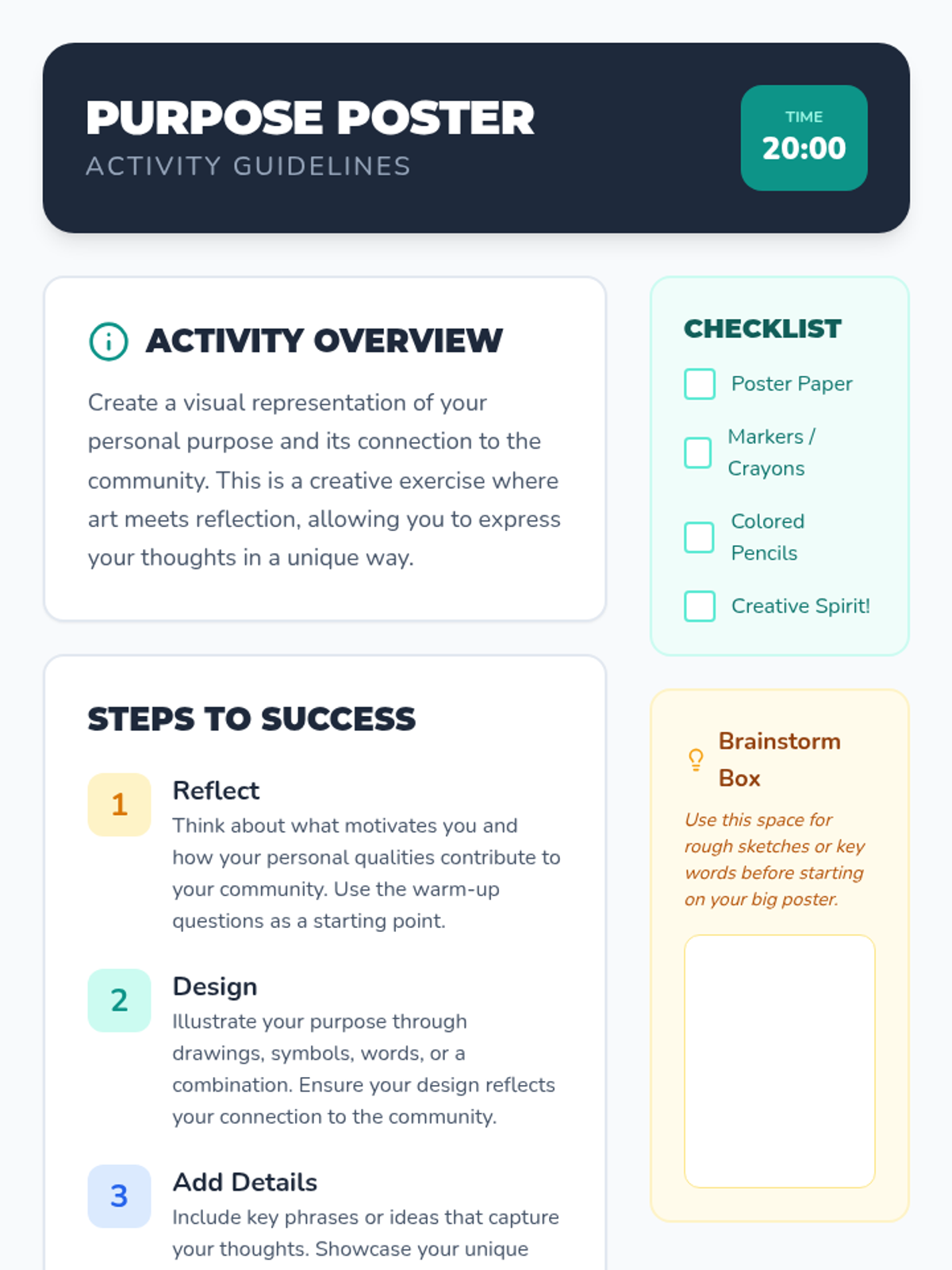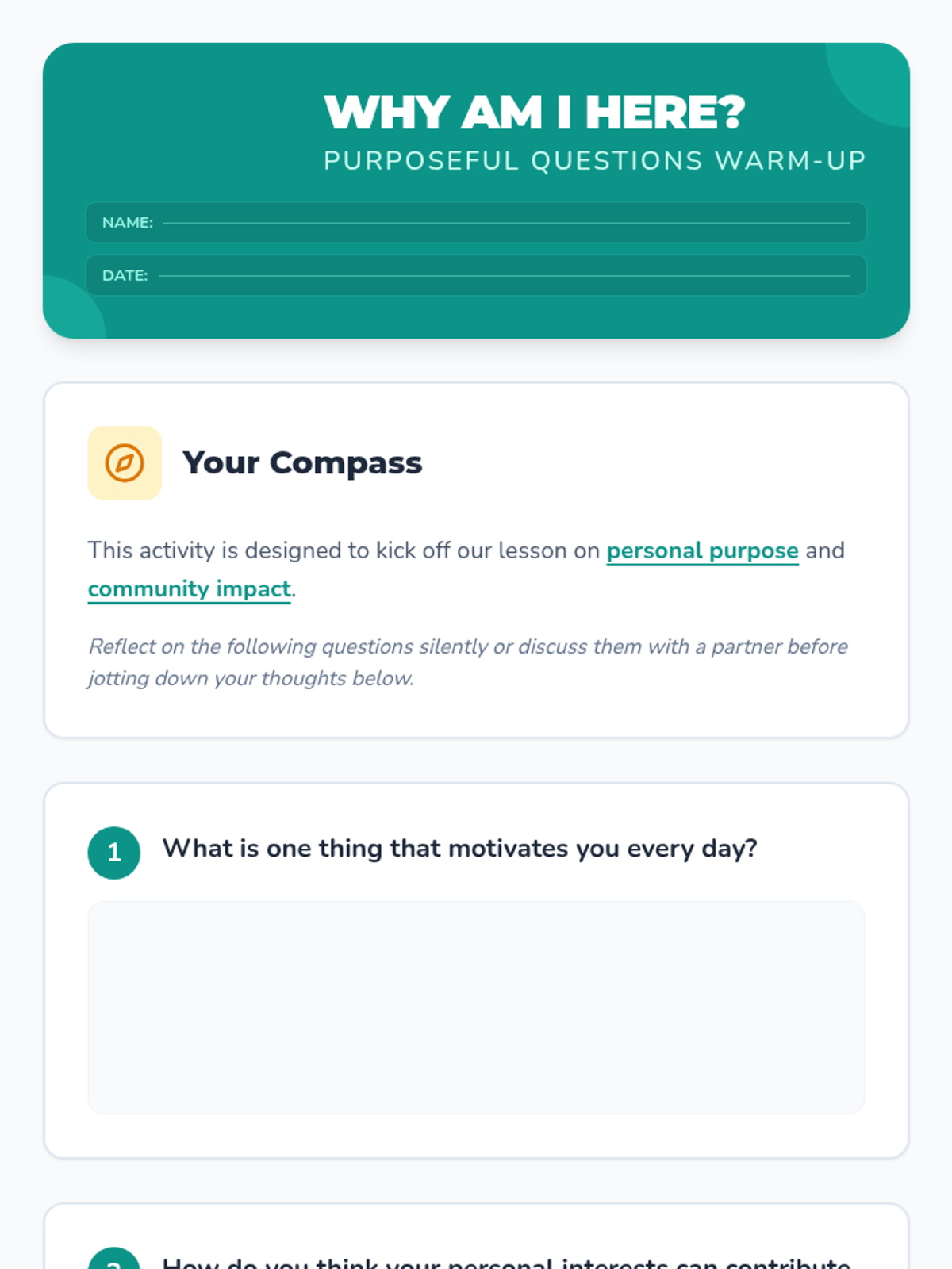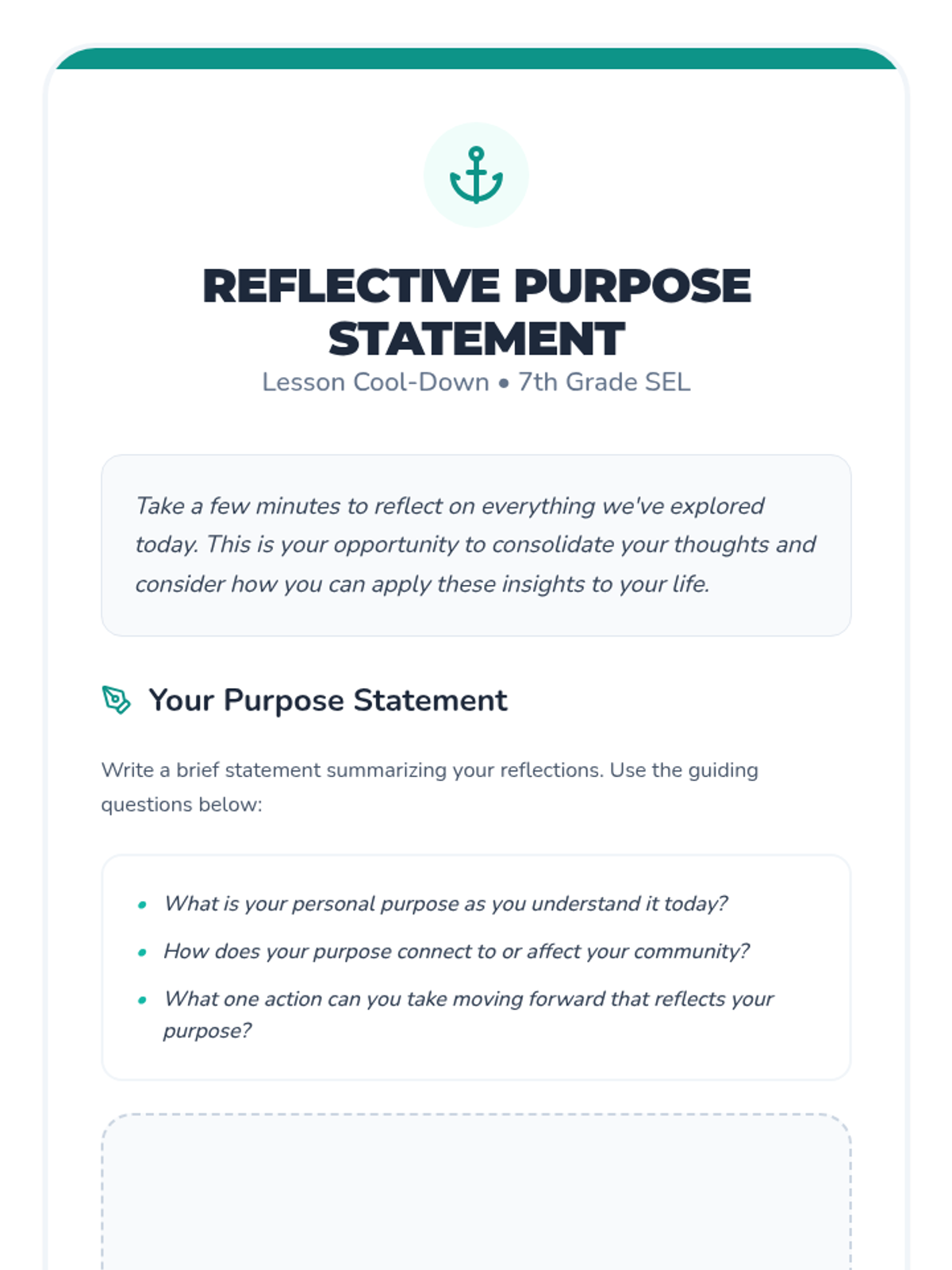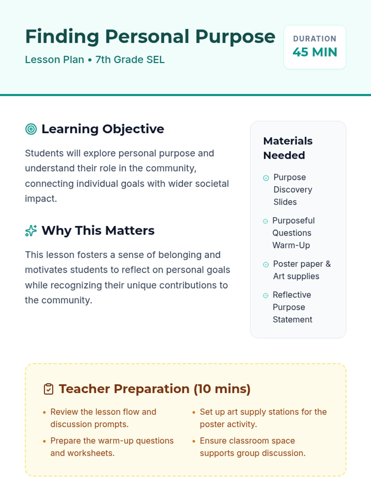 A 45-minute SEL lesson for 7th graders to explore their personal purpose, unique qualities, and how they can positively impact their community.