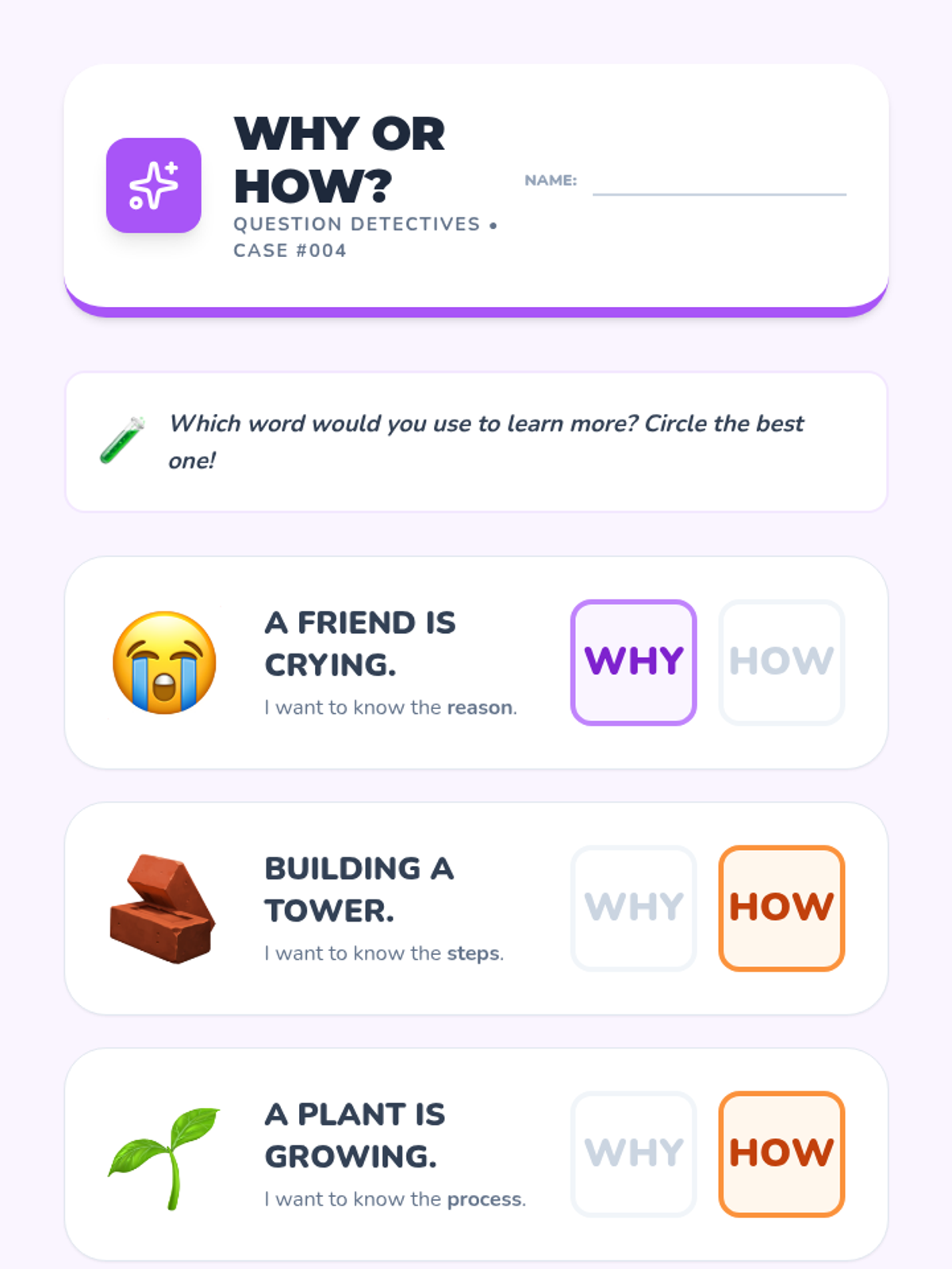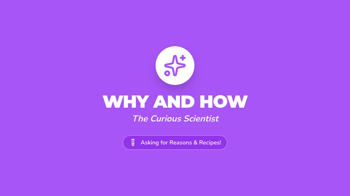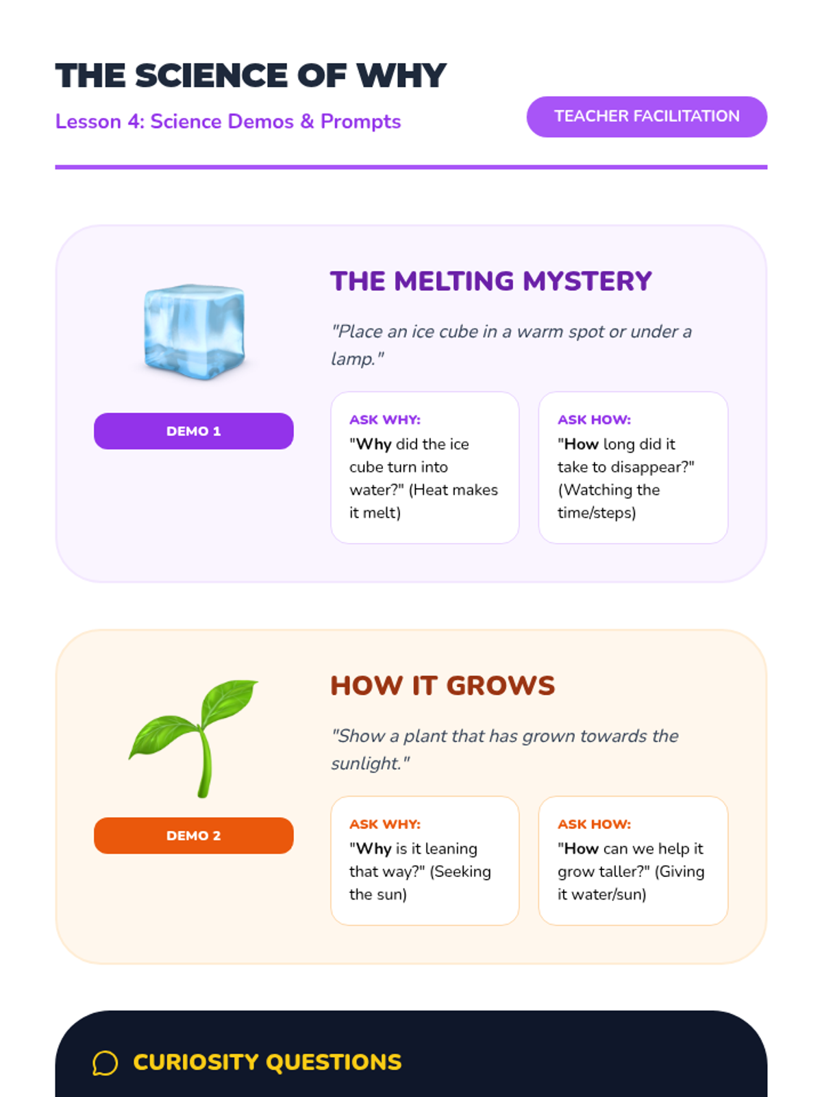 Teaches 'Why' for reasons and 'How' for processes using simple cause-and-effect scenarios and science demonstrations.