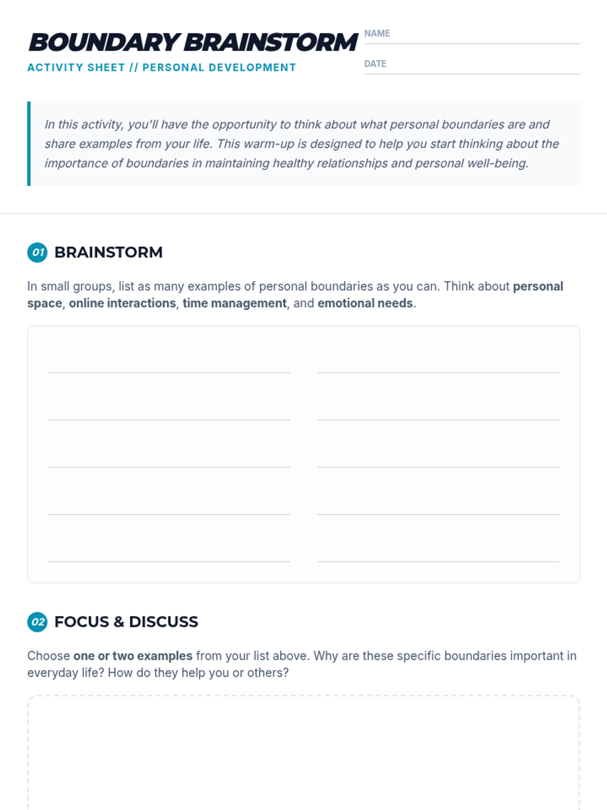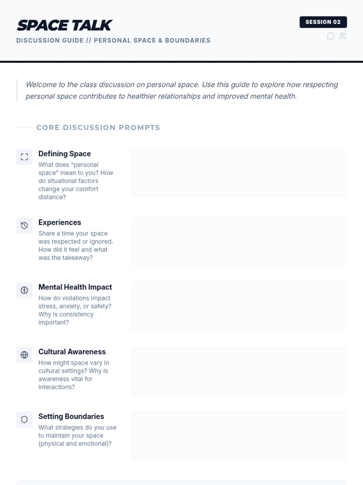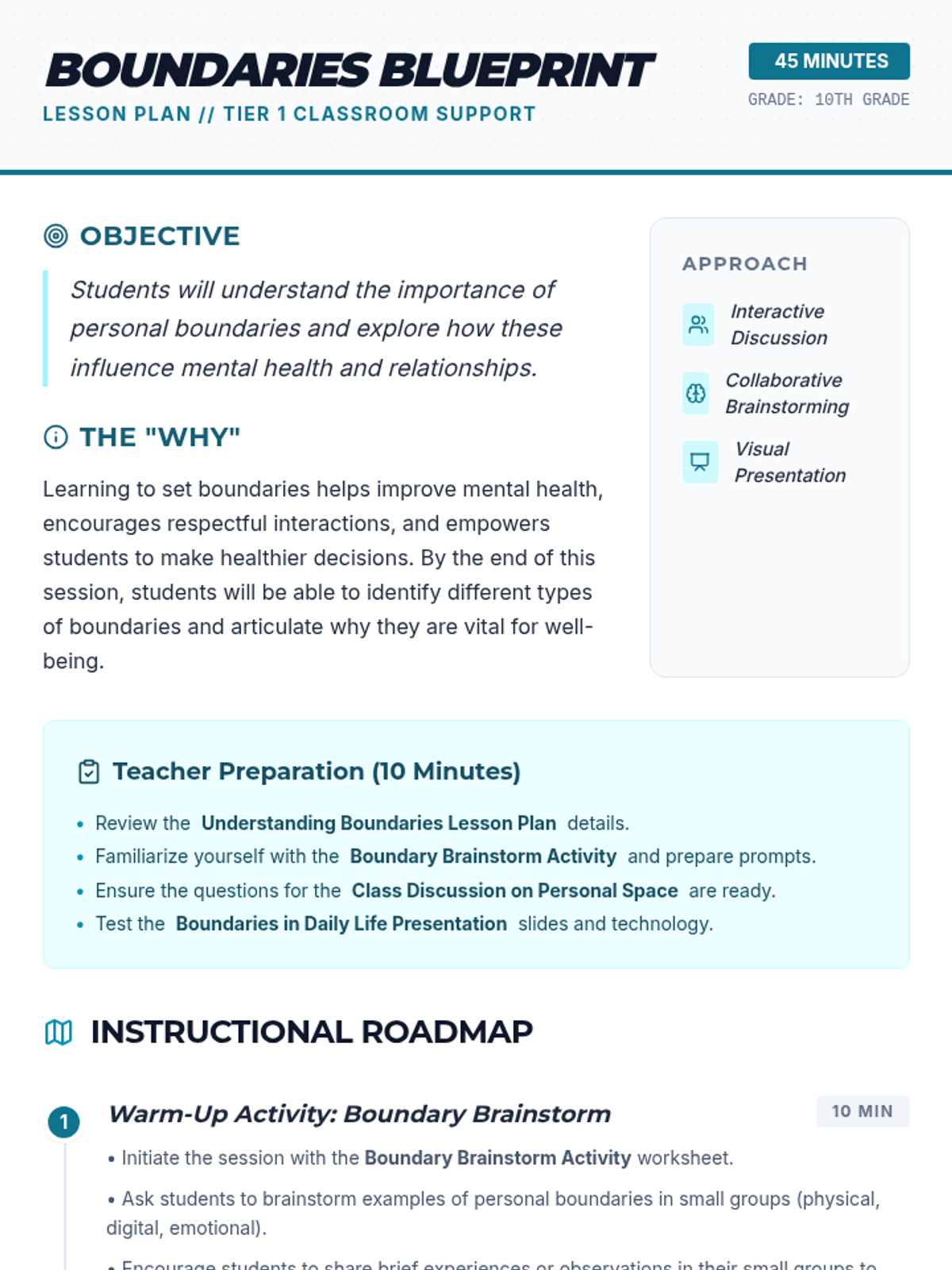 Explore the significance of setting personal boundaries and how they impact mental health and relationships. This 45-minute lesson for 10th graders uses interactive discussions and a presentation to help students recognize and apply boundaries in daily life.