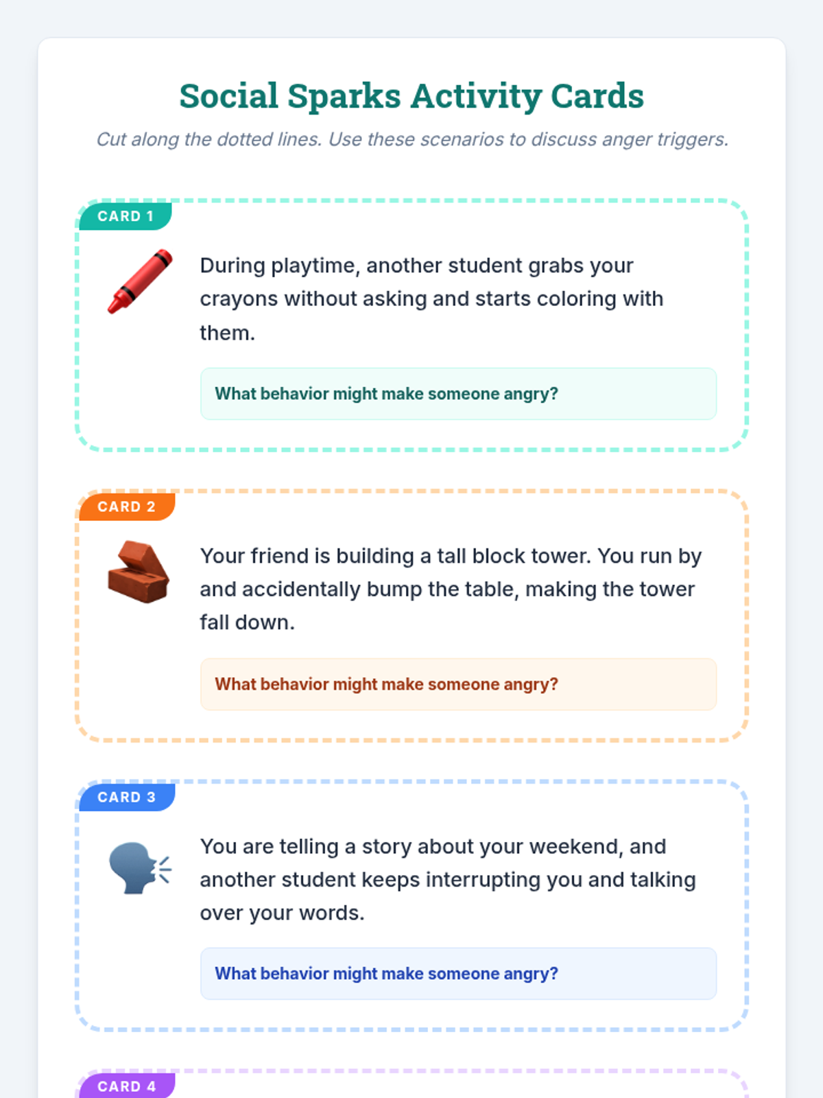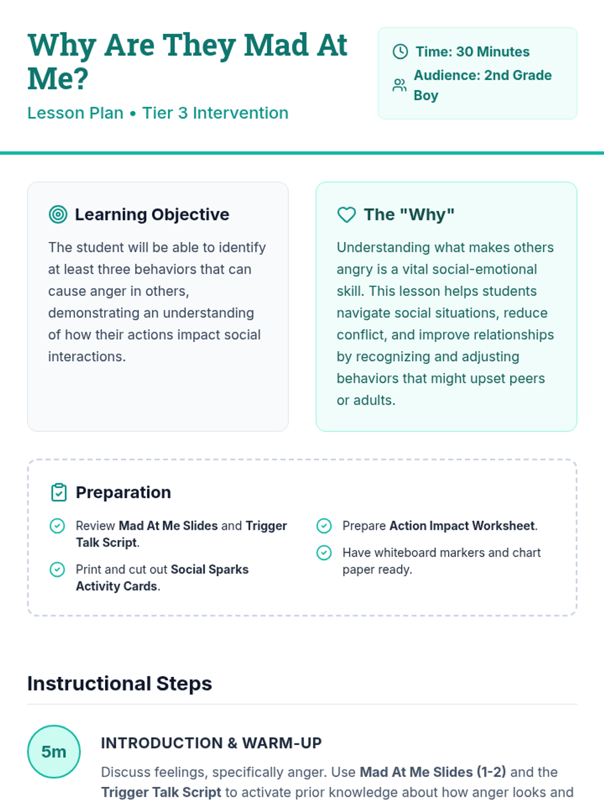 A 30-minute, Tier 3 social-emotional lesson for 2nd grade students to identify behaviors that cause anger in others and understand their social impact.