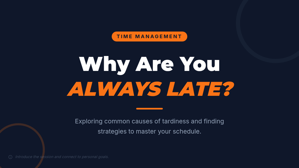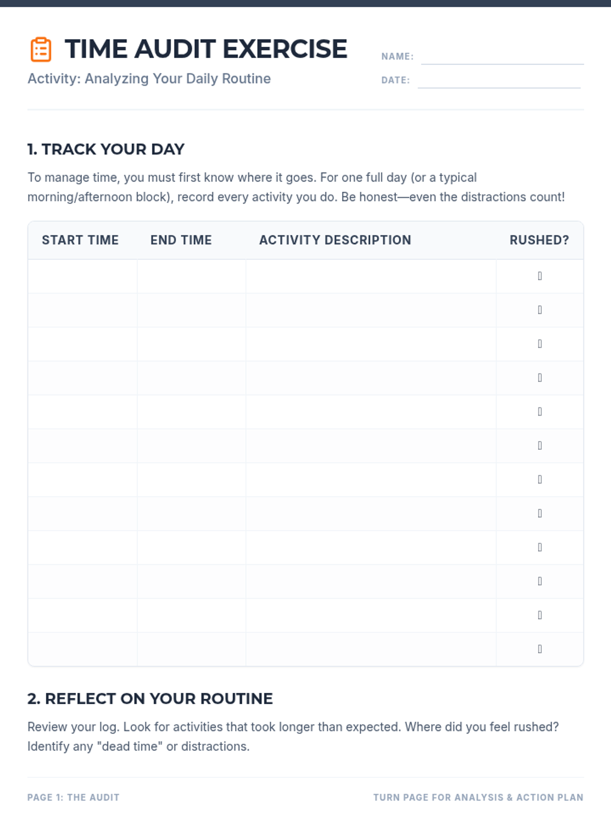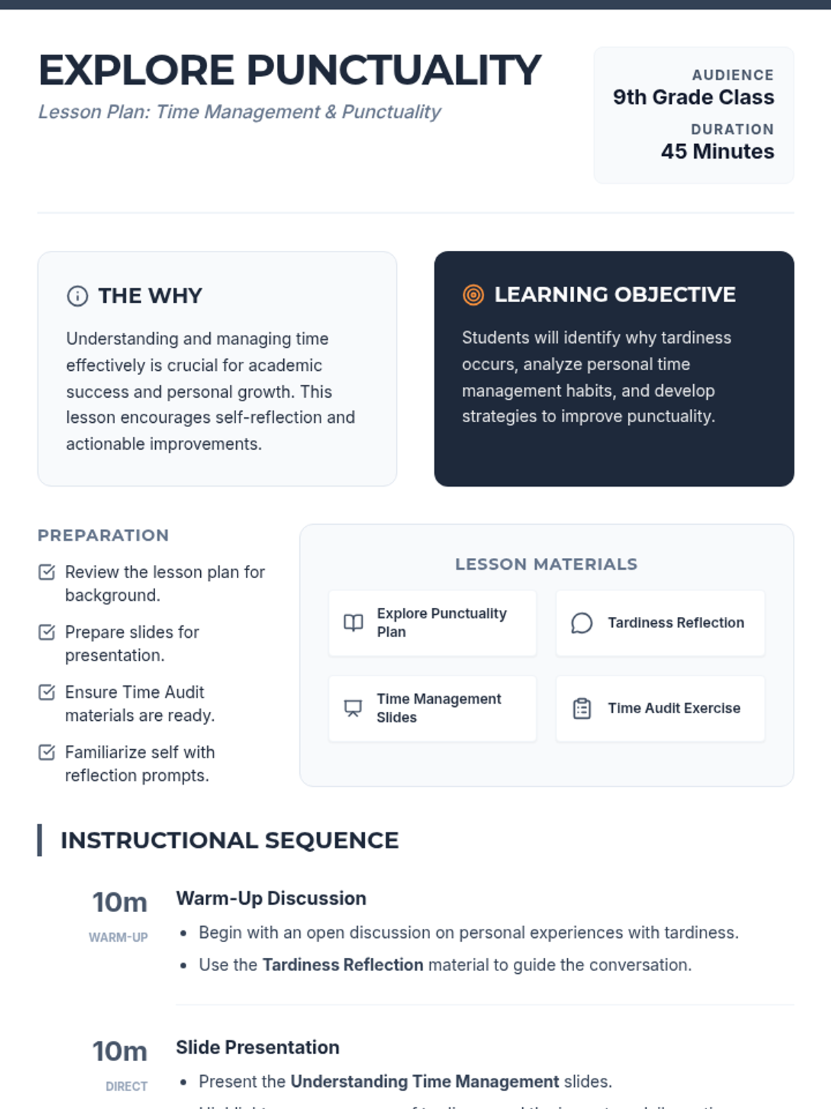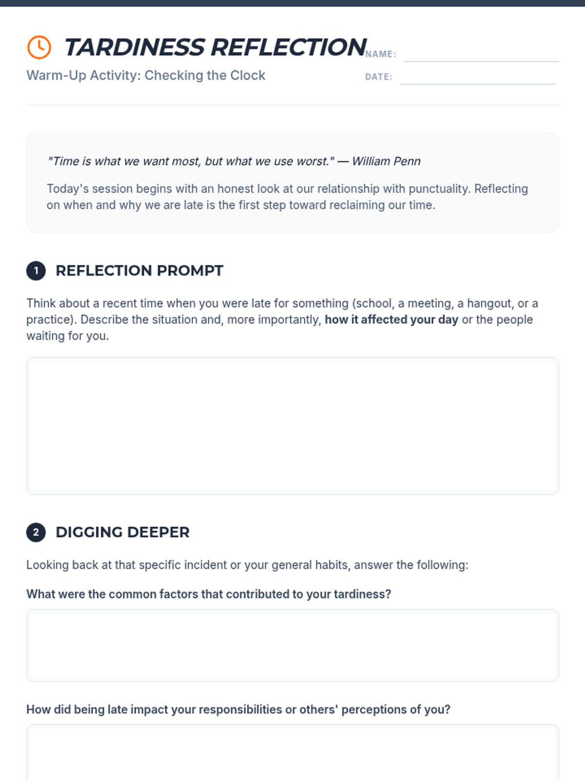 Students will explore common causes of tardiness, analyze the impact of being late, and develop personalized time management strategies through a time audit exercise and reflection.