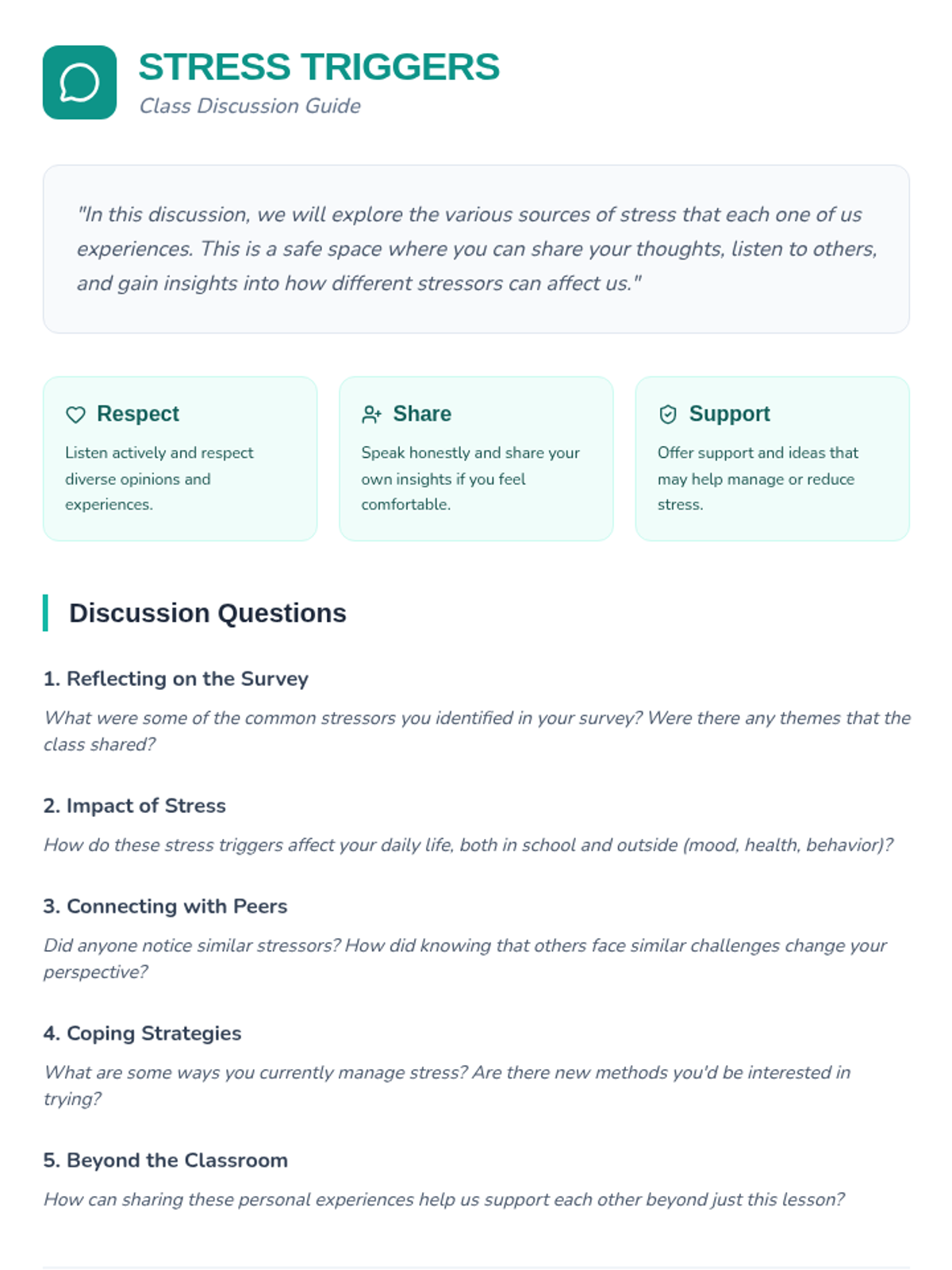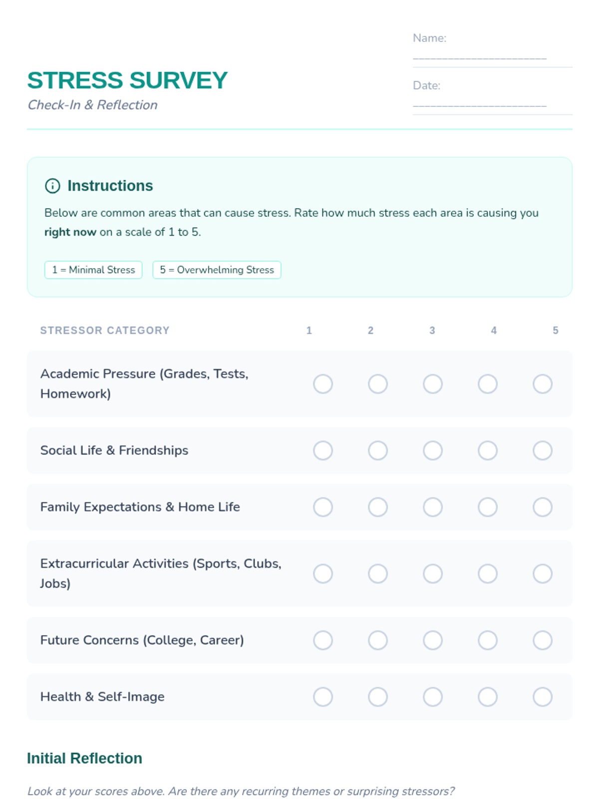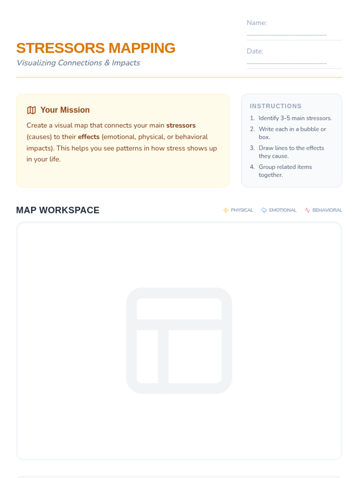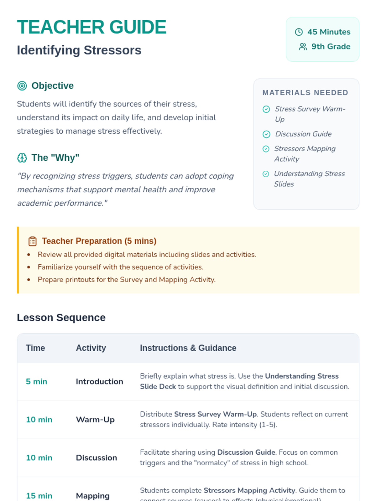 A 45-minute lesson for 9th graders to identify personal stressors and understand their physical and emotional impacts through reflection and mapping.