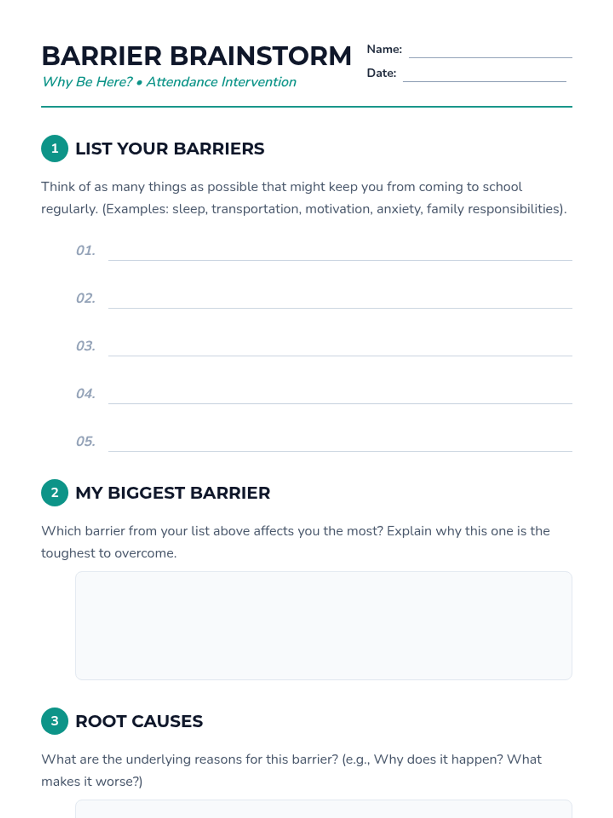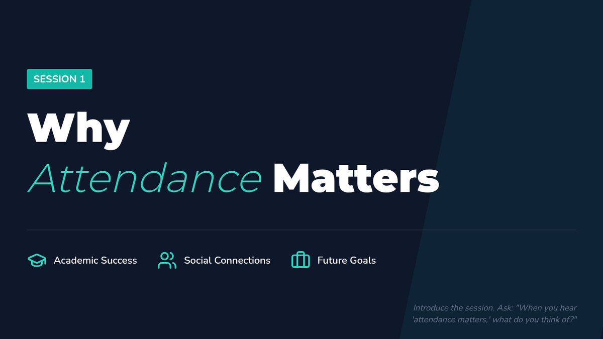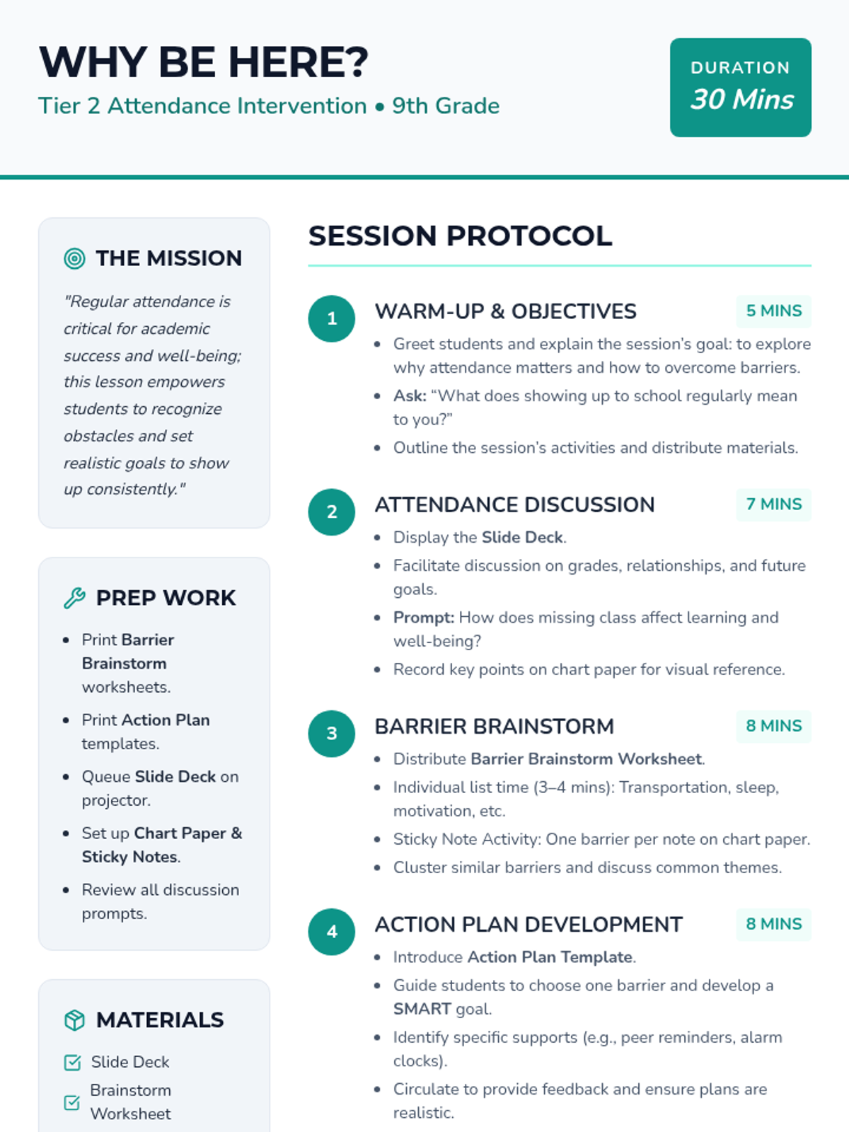 A 30-minute Tier 2 session for 9th graders to explore the importance of attendance, identify personal barriers, and create an actionable improvement plan.