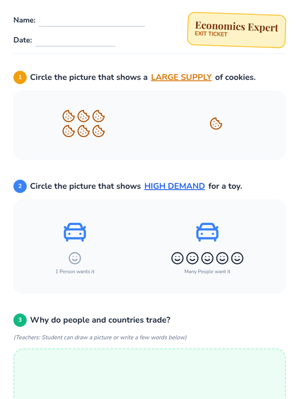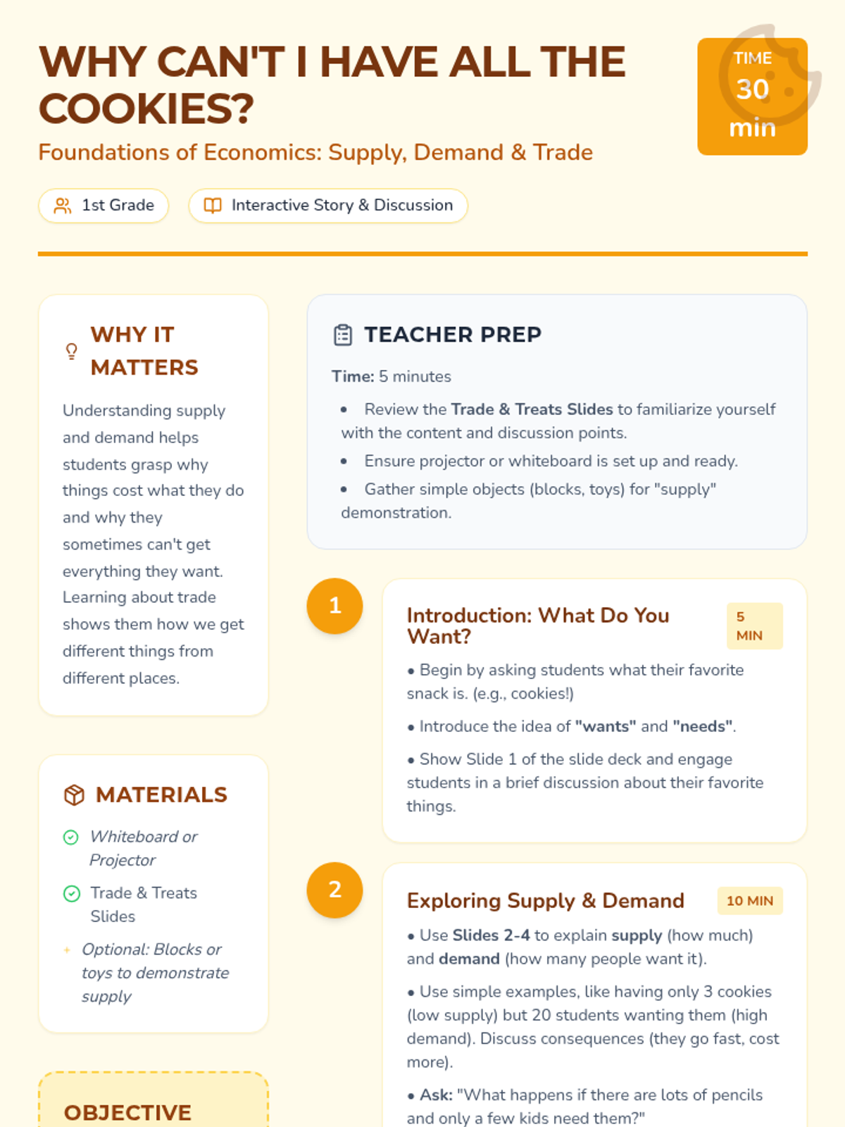 A 30-minute introductory lesson for 1st-grade students on the basic principles of supply, demand, and international trade using cookies and toys as relatable examples.