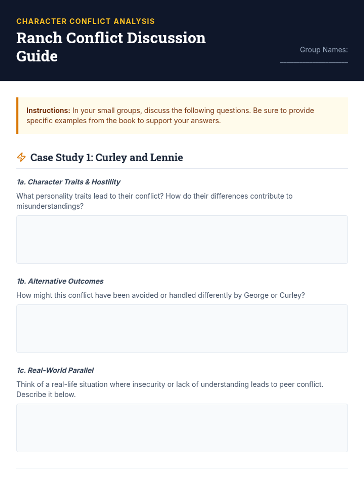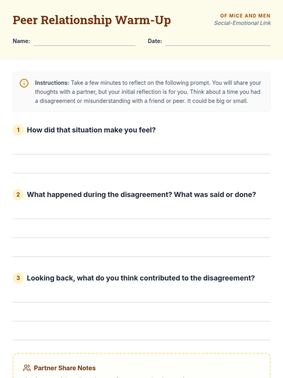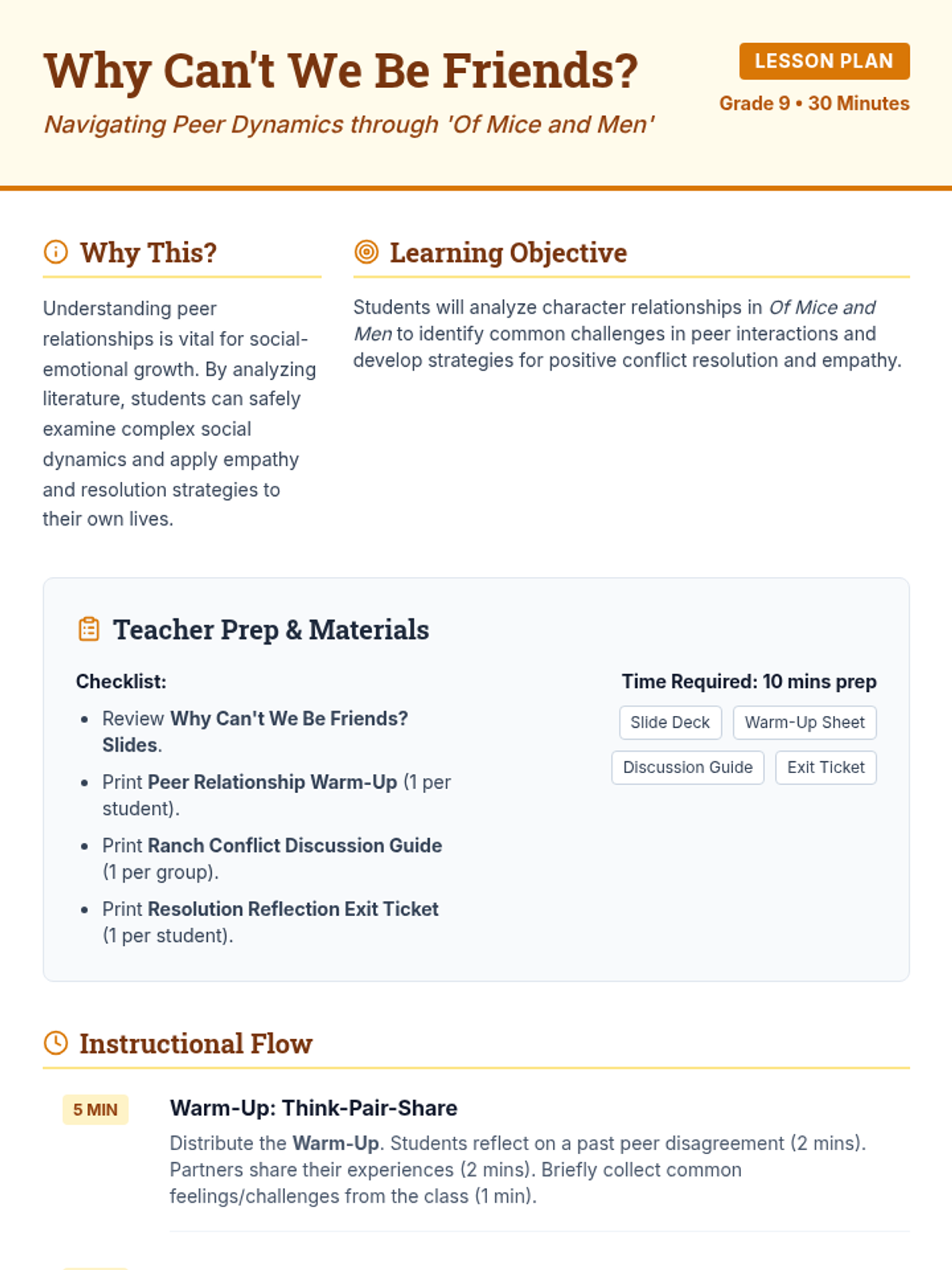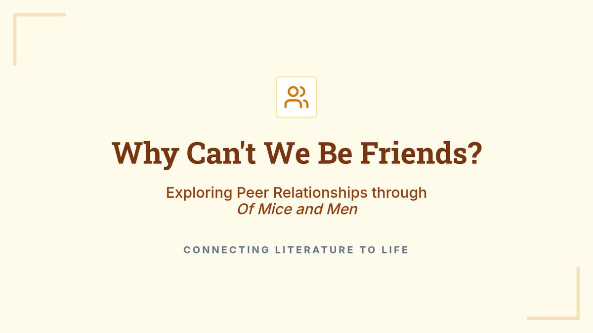 A 30-minute lesson for 9th-grade students that uses the character dynamics in John Steinbeck's 'Of Mice and Men' to explore peer relationships, empathy, and conflict resolution. Students analyze the tension between Curley and Lennie and the lack of empathy in the Carlson/Candy dog conflict to develop real-world social-emotional skills.