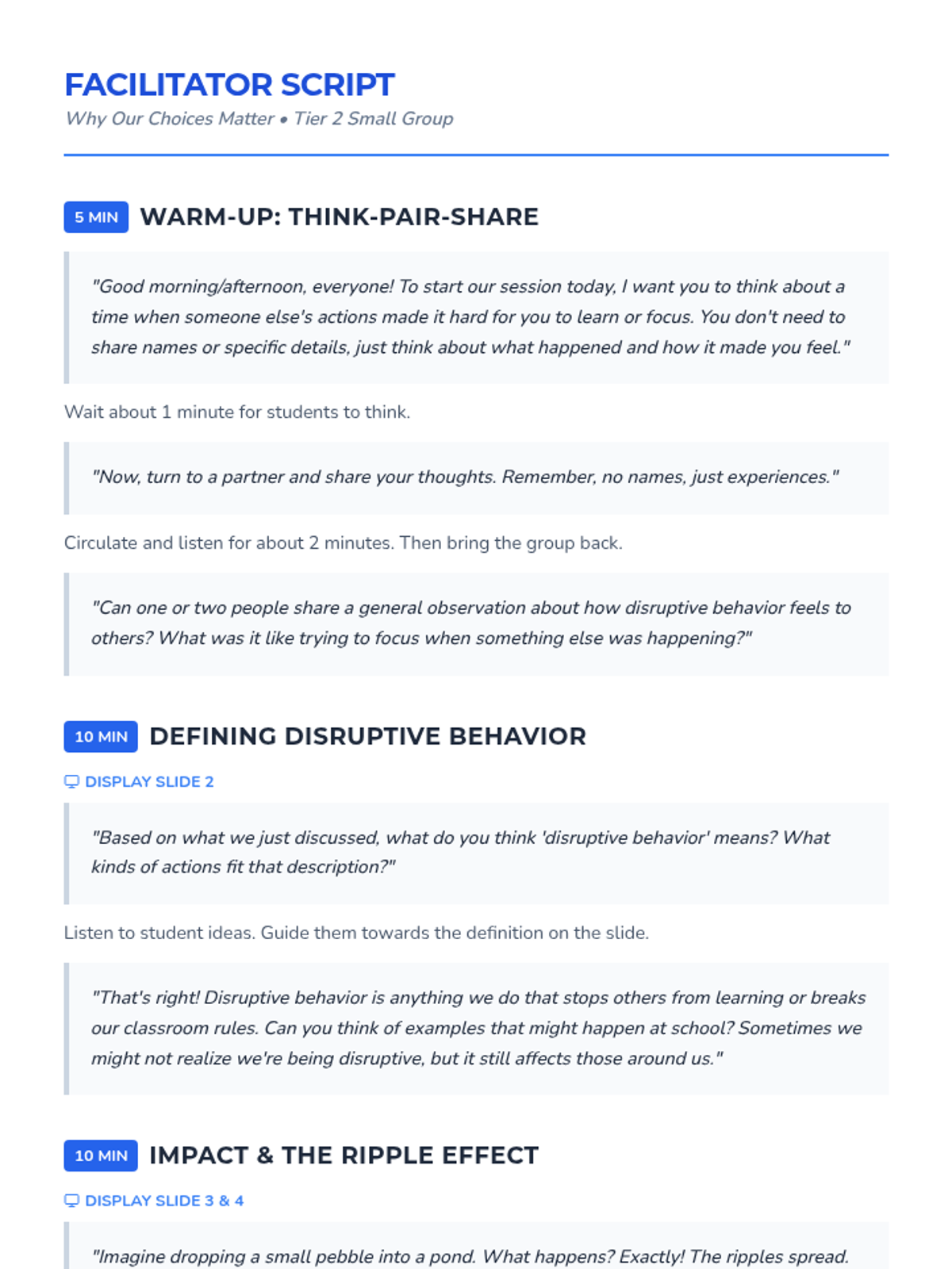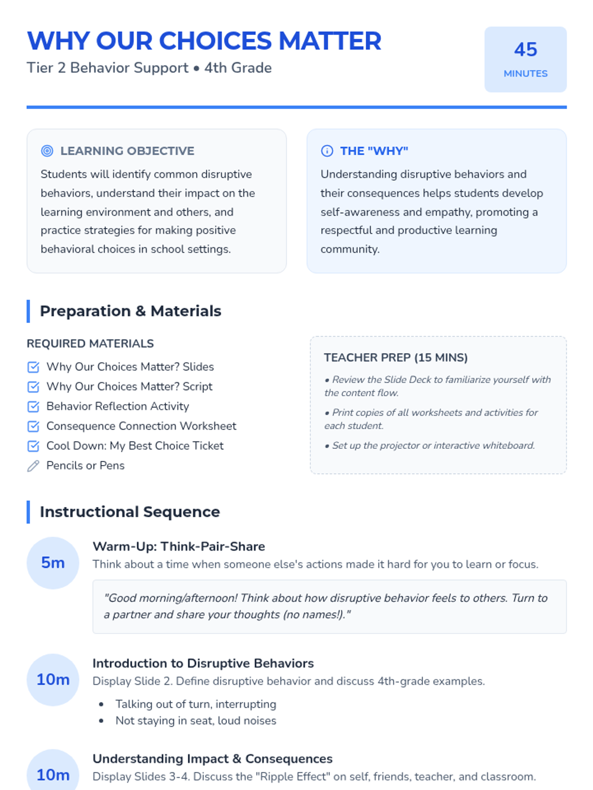 A 45-minute Tier 2 small group lesson for 4th graders focused on identifying disruptive behaviors, understanding their impact through the 'ripple effect', and practicing positive choice-making strategies.