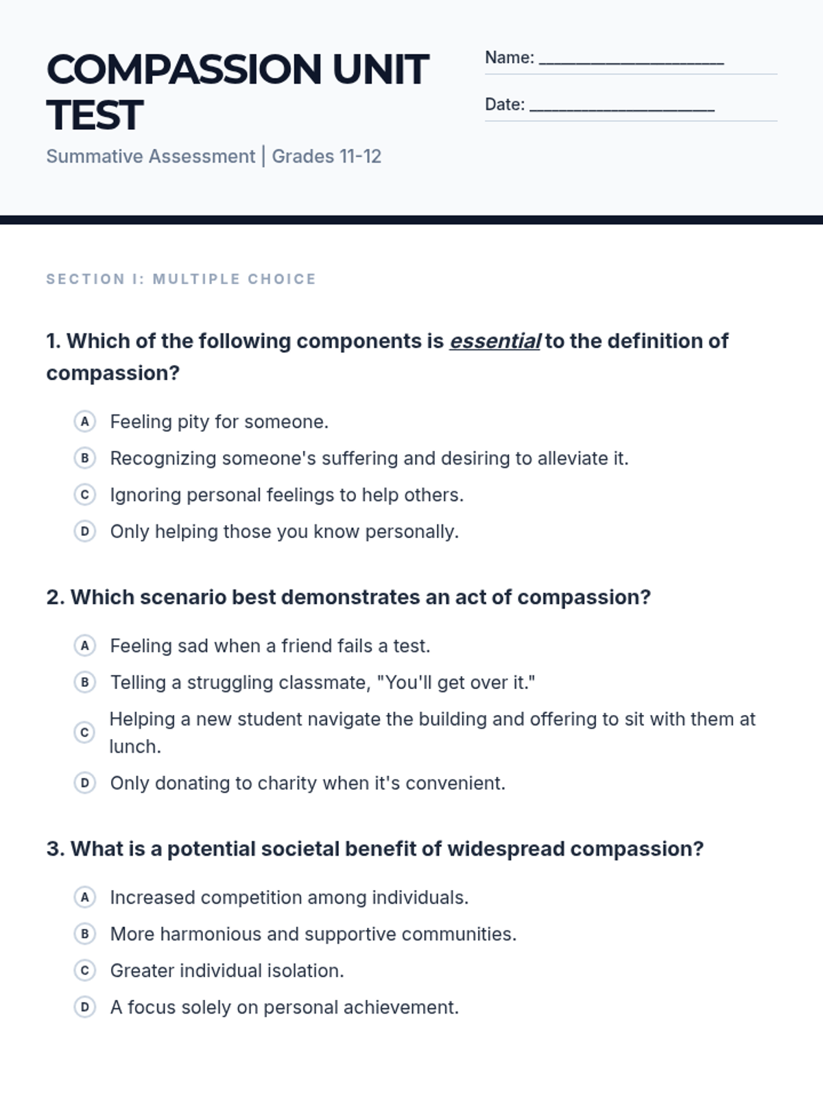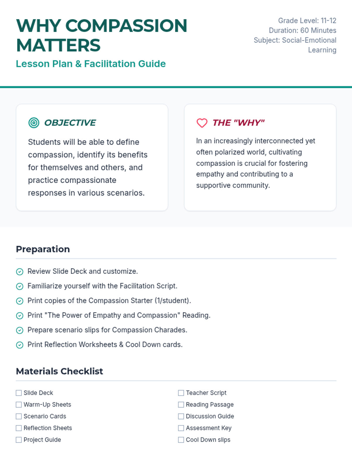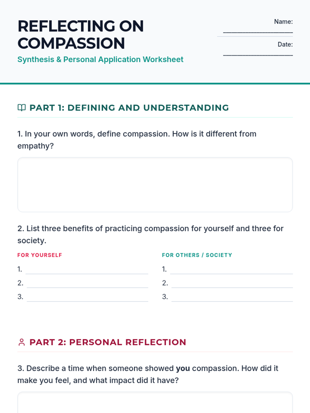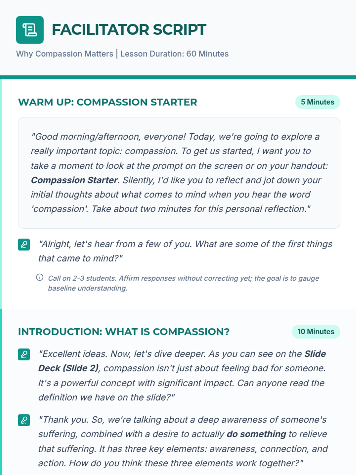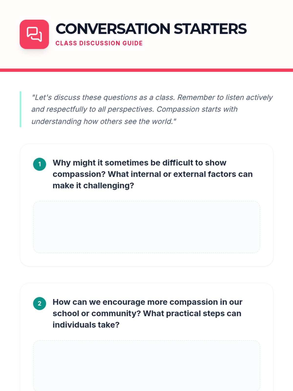 This lesson explores the profound impact of compassion on individuals and society. Students will delve into understanding what compassion truly means, its benefits, and practical ways to cultivate it in their daily lives.