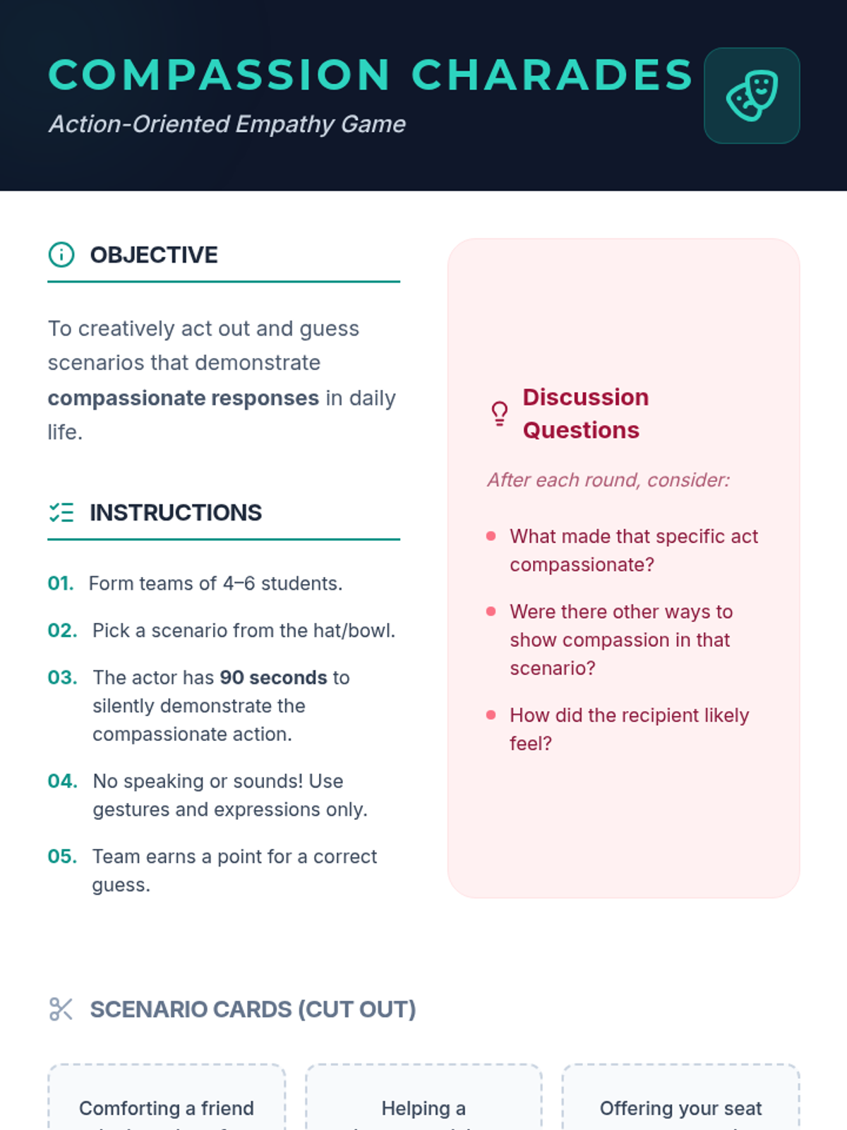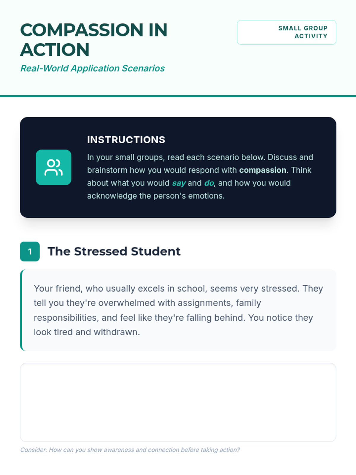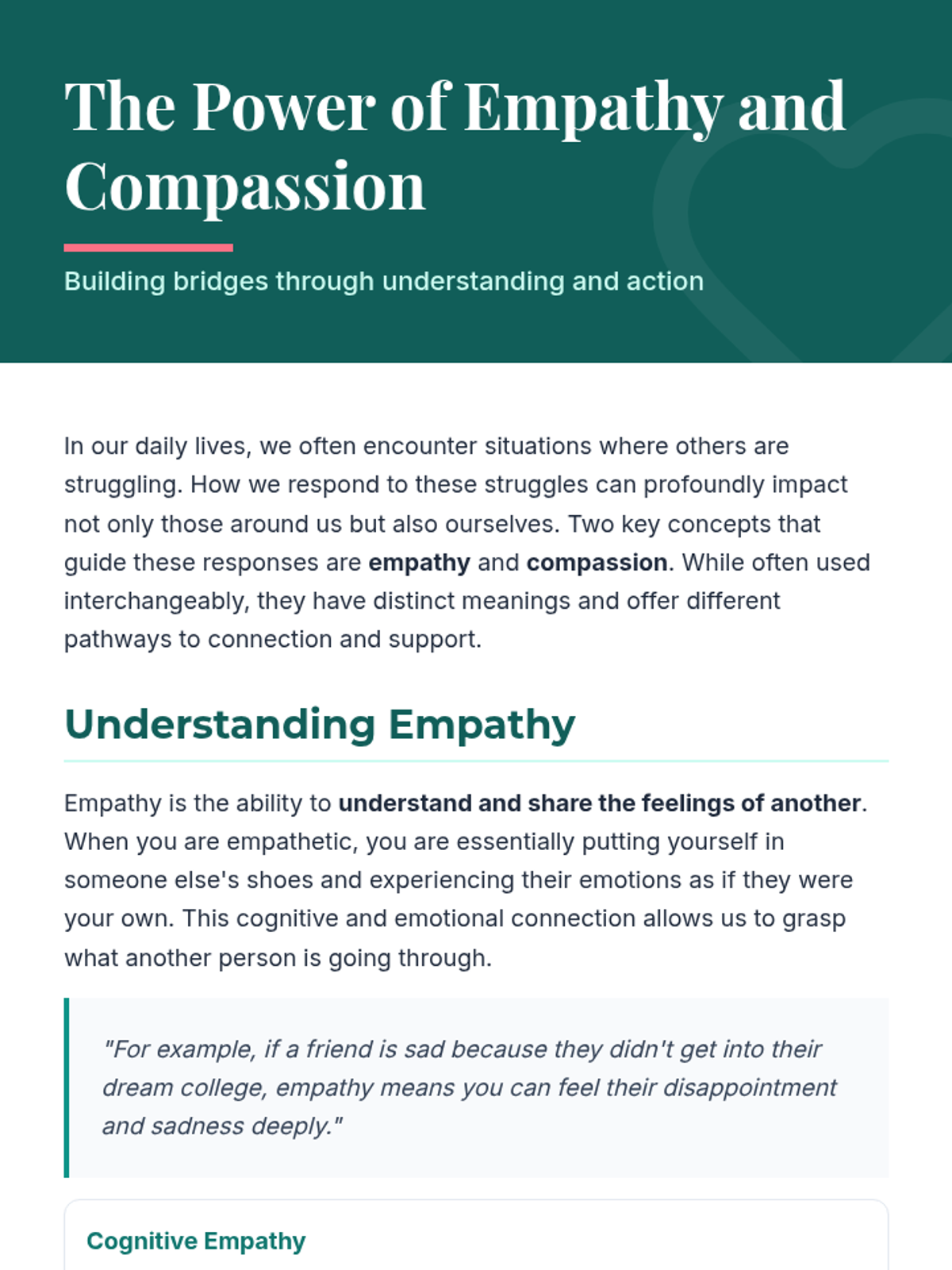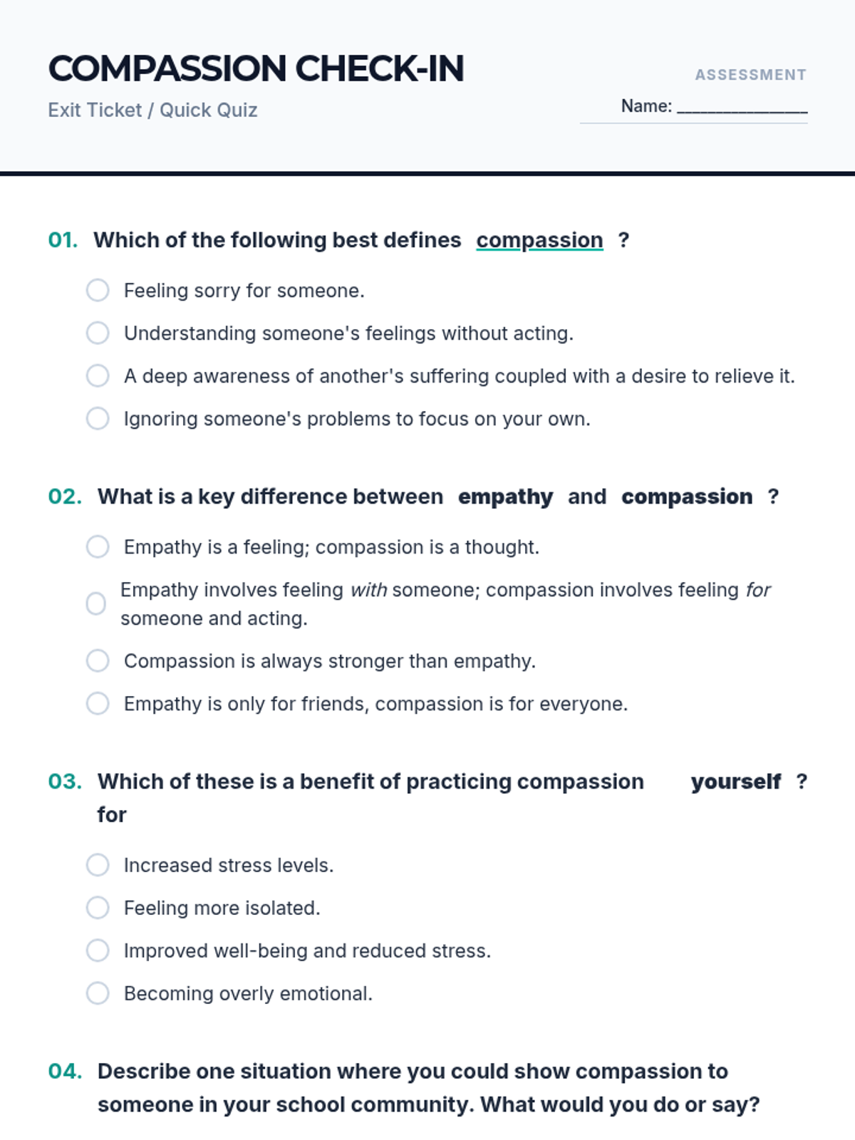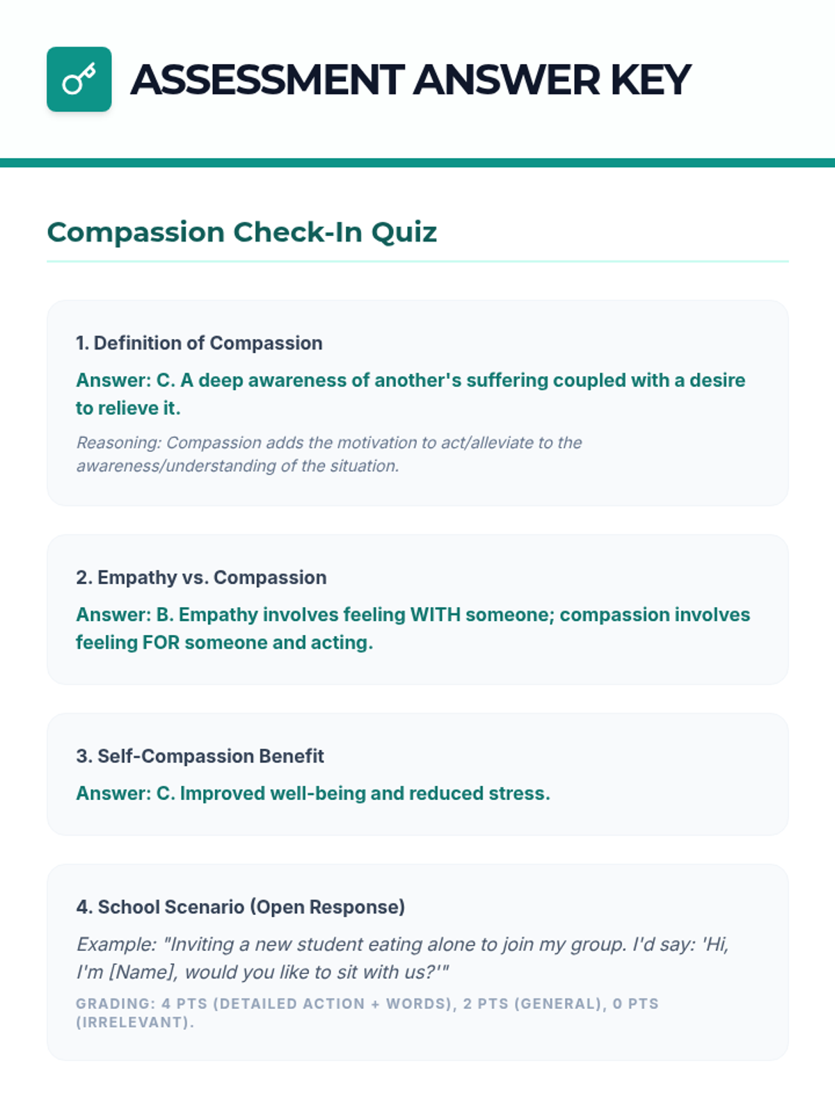 This lesson explores the profound impact of compassion on individuals and society. Students will delve into understanding what compassion truly means, its benefits, and practical ways to cultivate it in their daily lives.