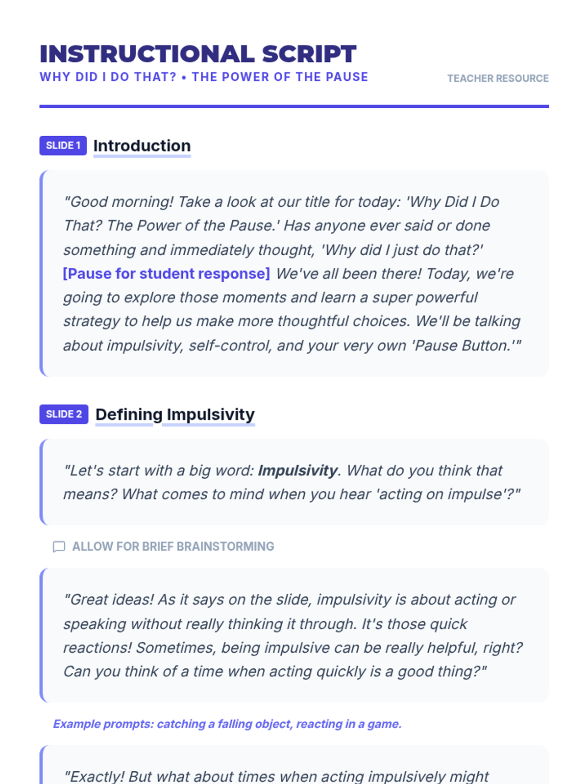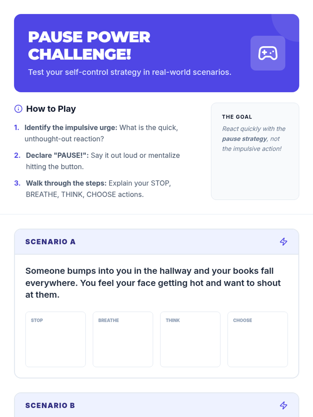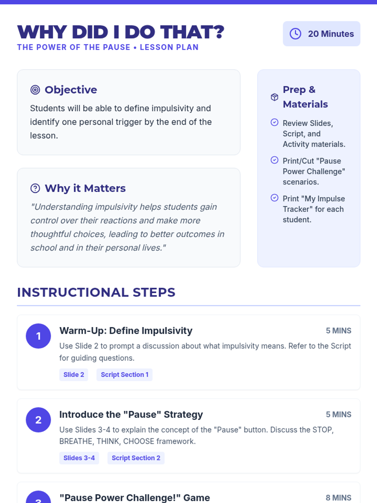 A 20-minute Tier 3 intervention for 7th graders focused on understanding impulsivity and mastering the 'Pause' strategy to improve self-control.