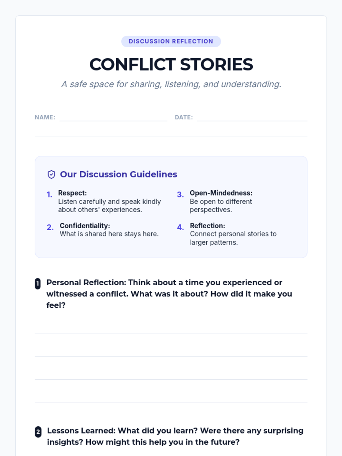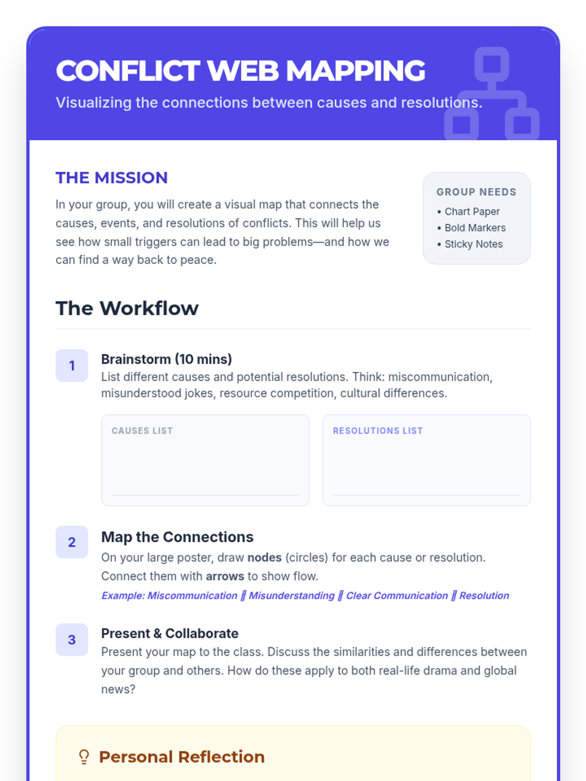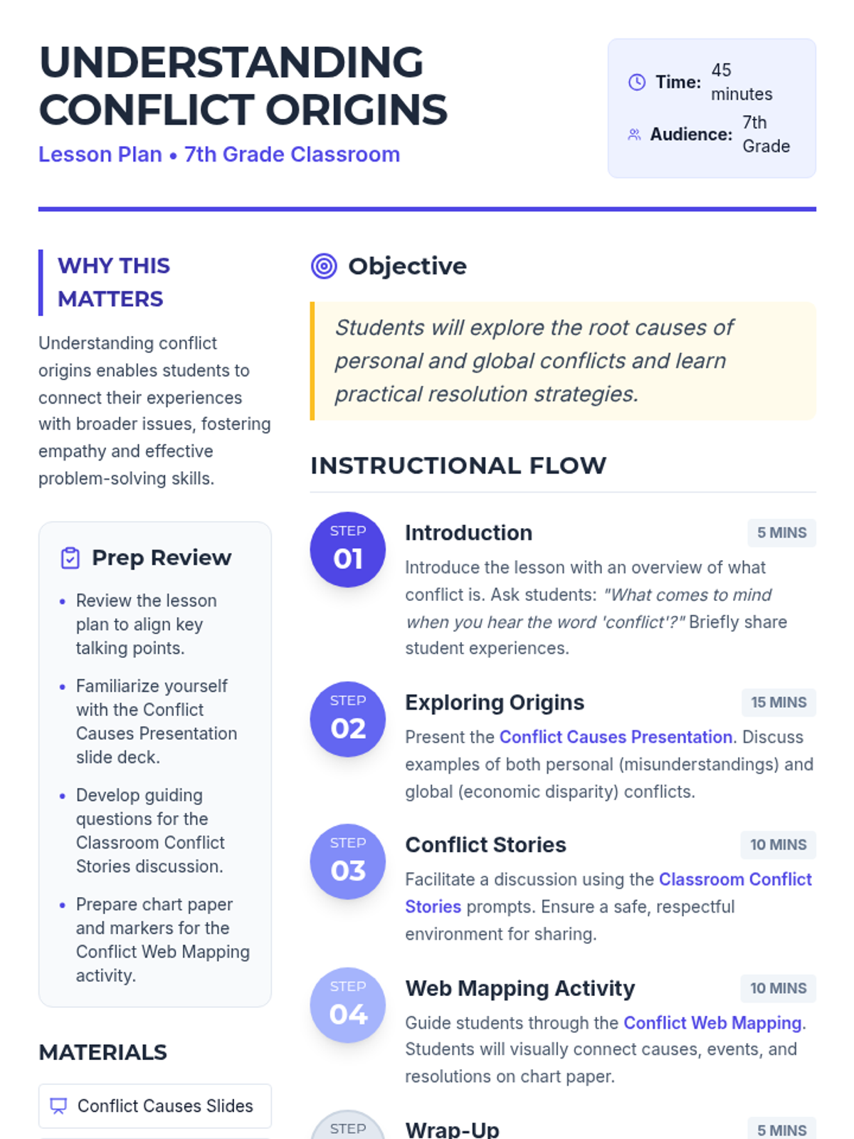 Students will explore the root causes of conflicts, both personal and global, and learn how understanding these causes can help in resolving them. This lesson helps students connect the concept of conflict to their own experiences.