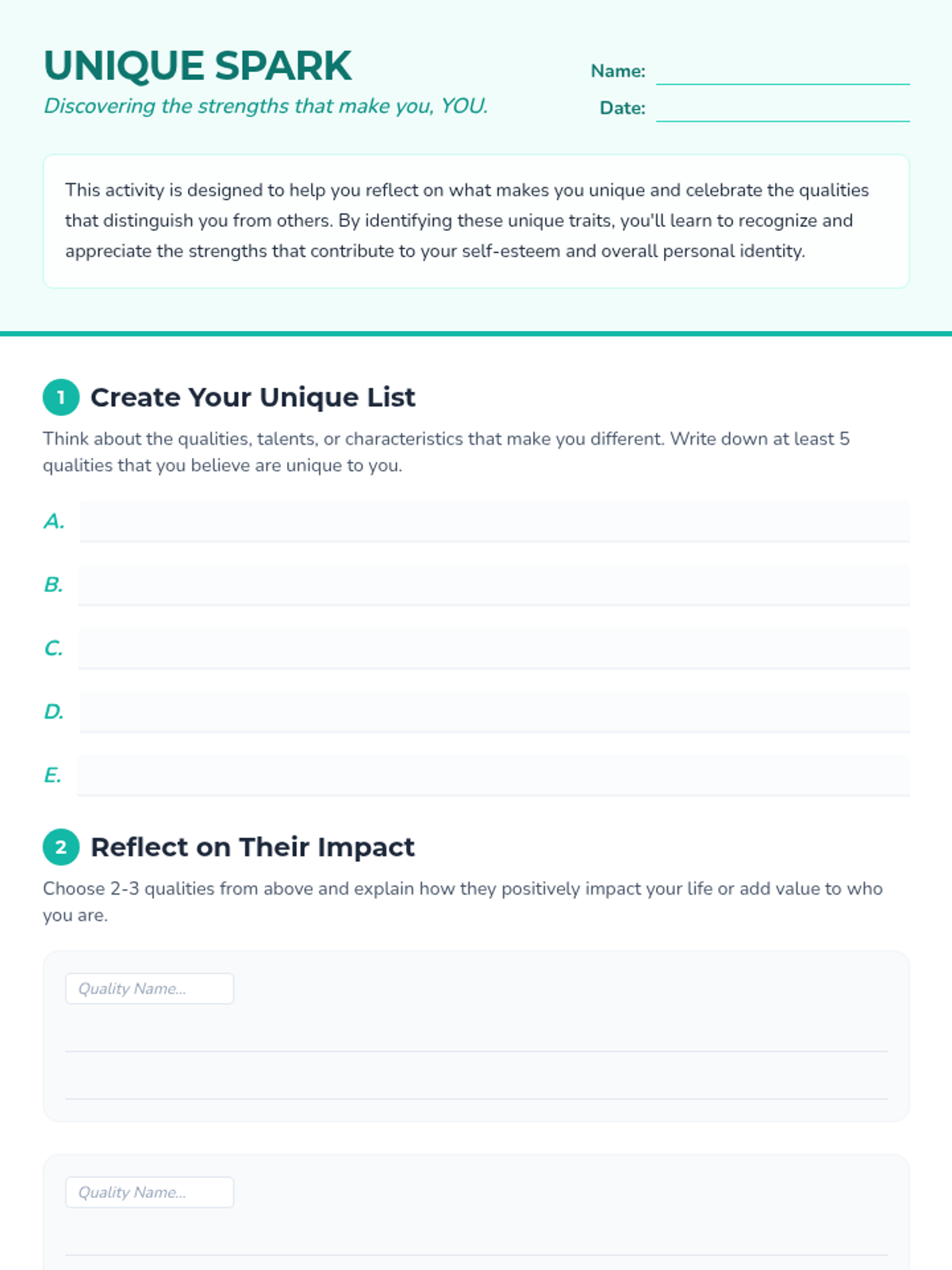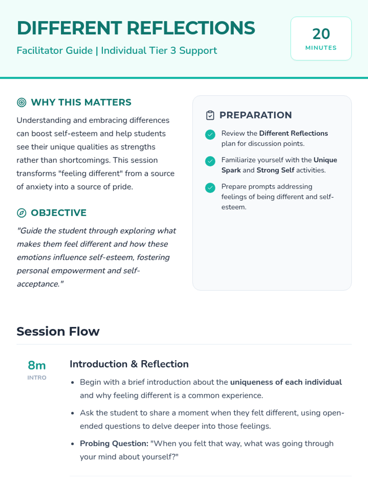 A 20-minute Tier 3 individual session for 7th-grade students to explore feelings of being different, boost self-esteem, and embrace personal uniqueness.