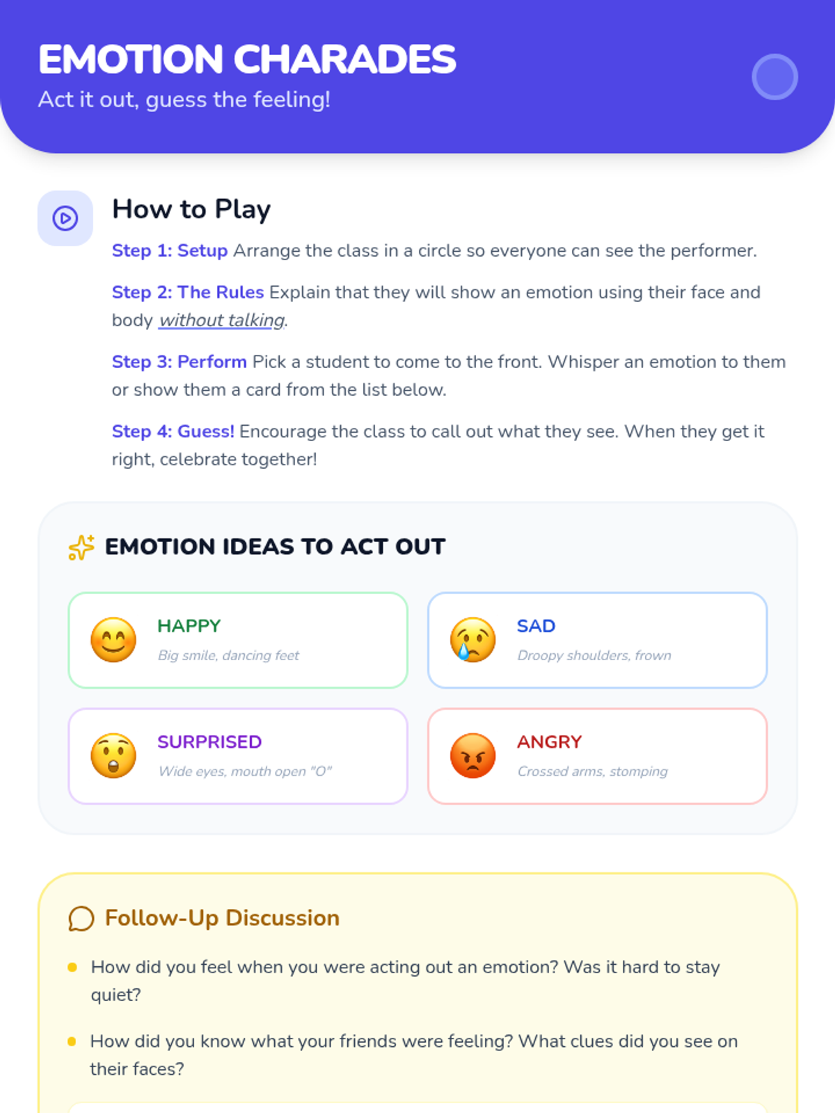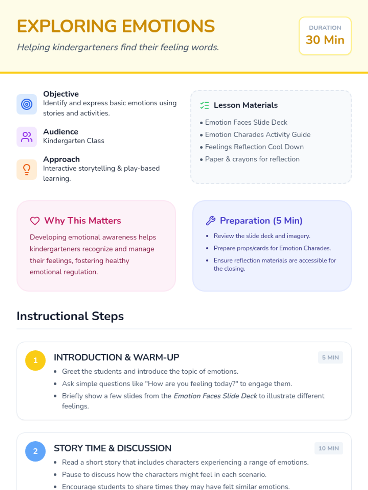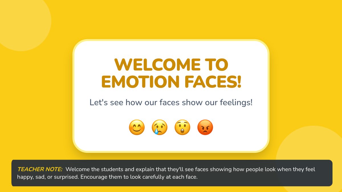 An introductory lesson for kindergarteners to identify and express basic emotions through stories, slides, and interactive play.