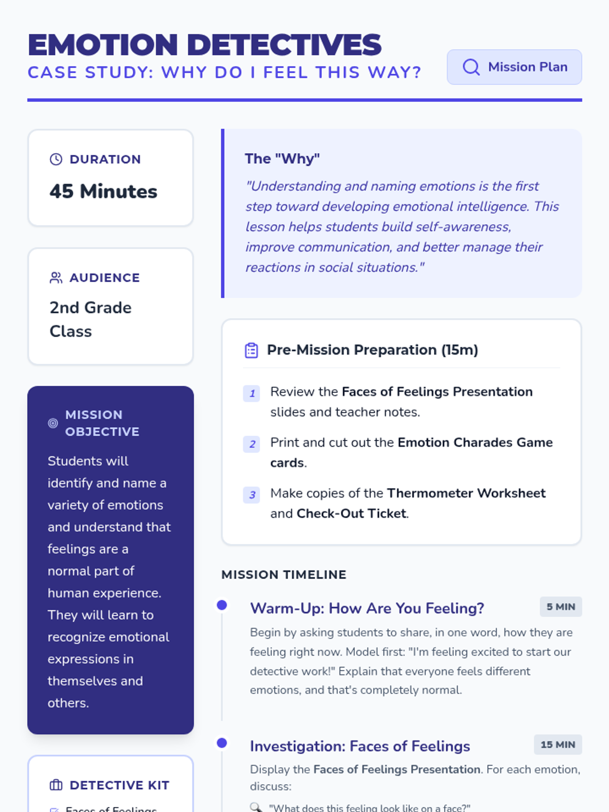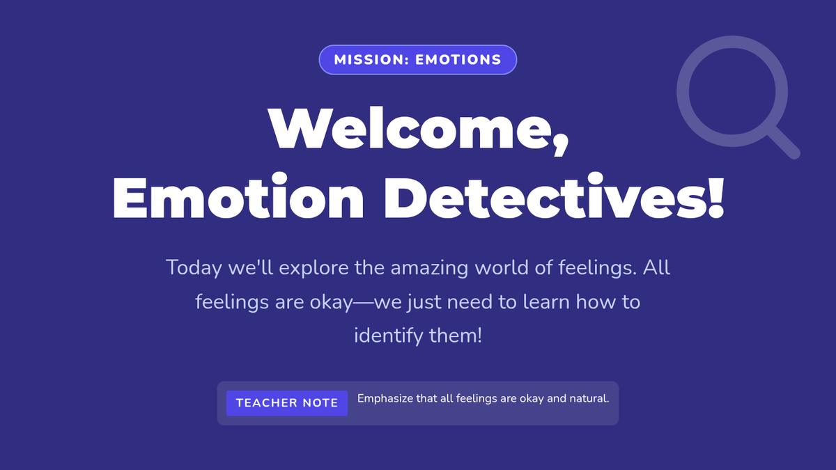 This lesson helps students explore and identify a wide range of emotions, building foundational emotional literacy. Students will learn to name emotions, recognize facial expressions, and understand the concept of emotional intensity using a feeling thermometer.