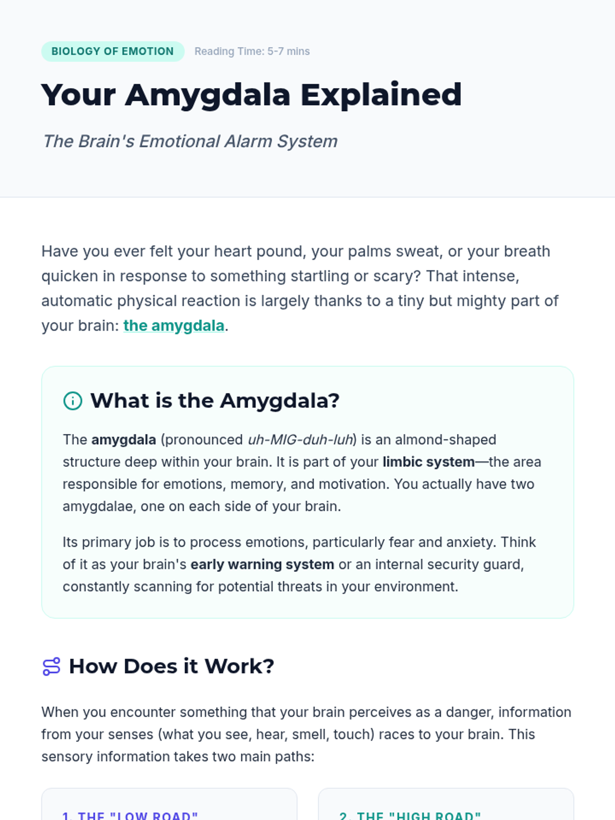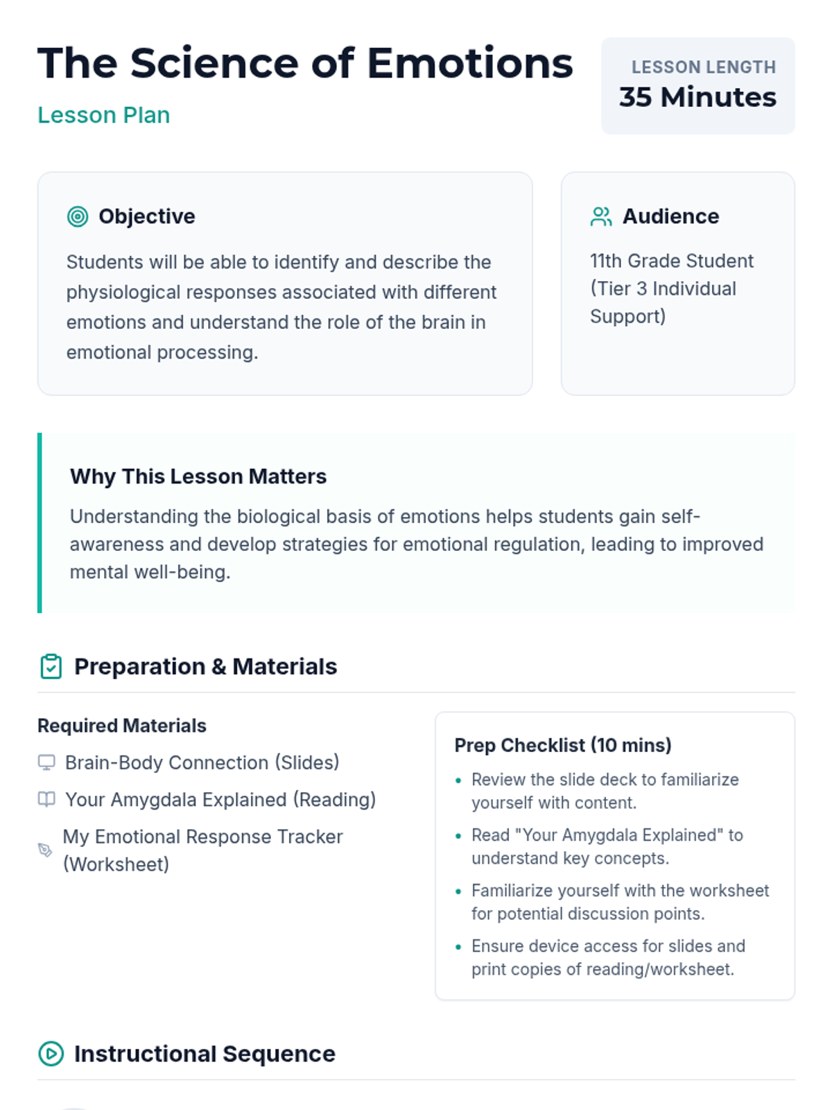 This lesson delves into the physiological responses to emotions, helping an individual student understand the 'why' behind their feelings. It explores the brain-body connection, focusing on the amygdala and the fight-or-flight response to promote self-awareness and emotional regulation.