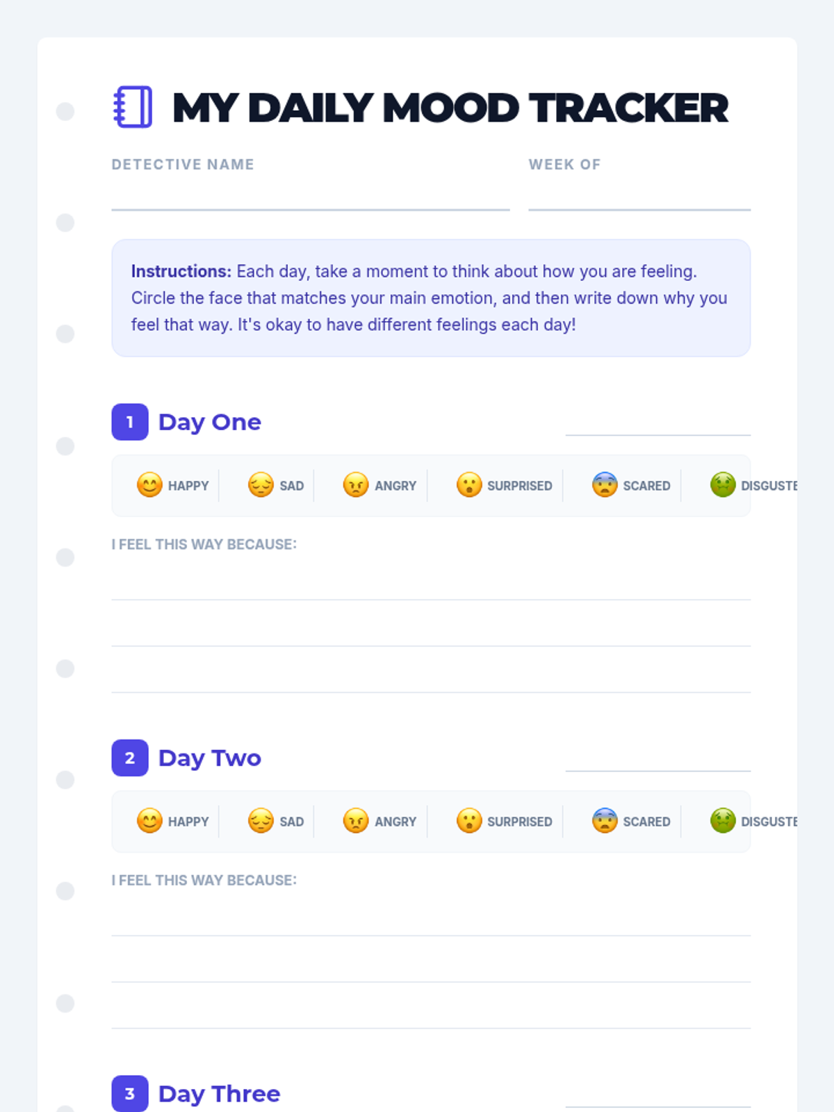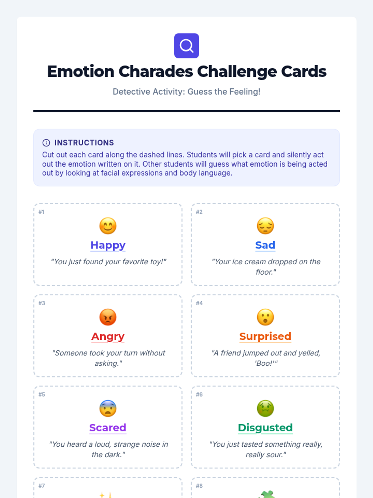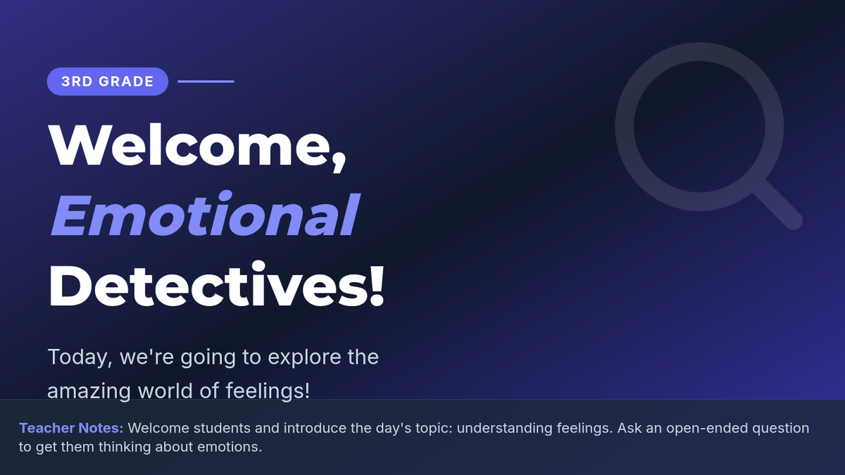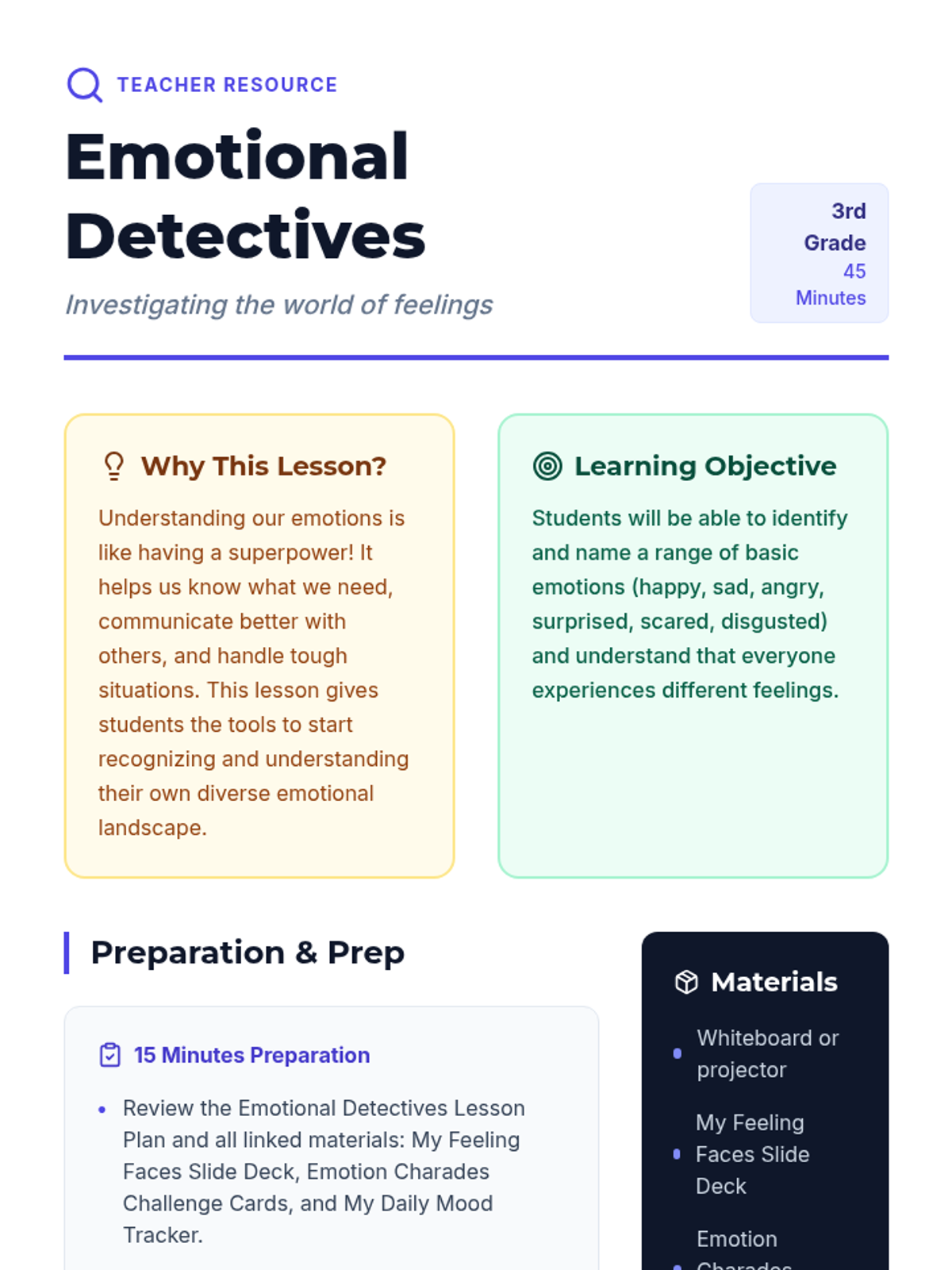 A 45-minute introductory lesson for 3rd graders to identify and understand basic emotions (happy, sad, angry, surprised, scared, disgusted) through discussion, visual aids, and charades.