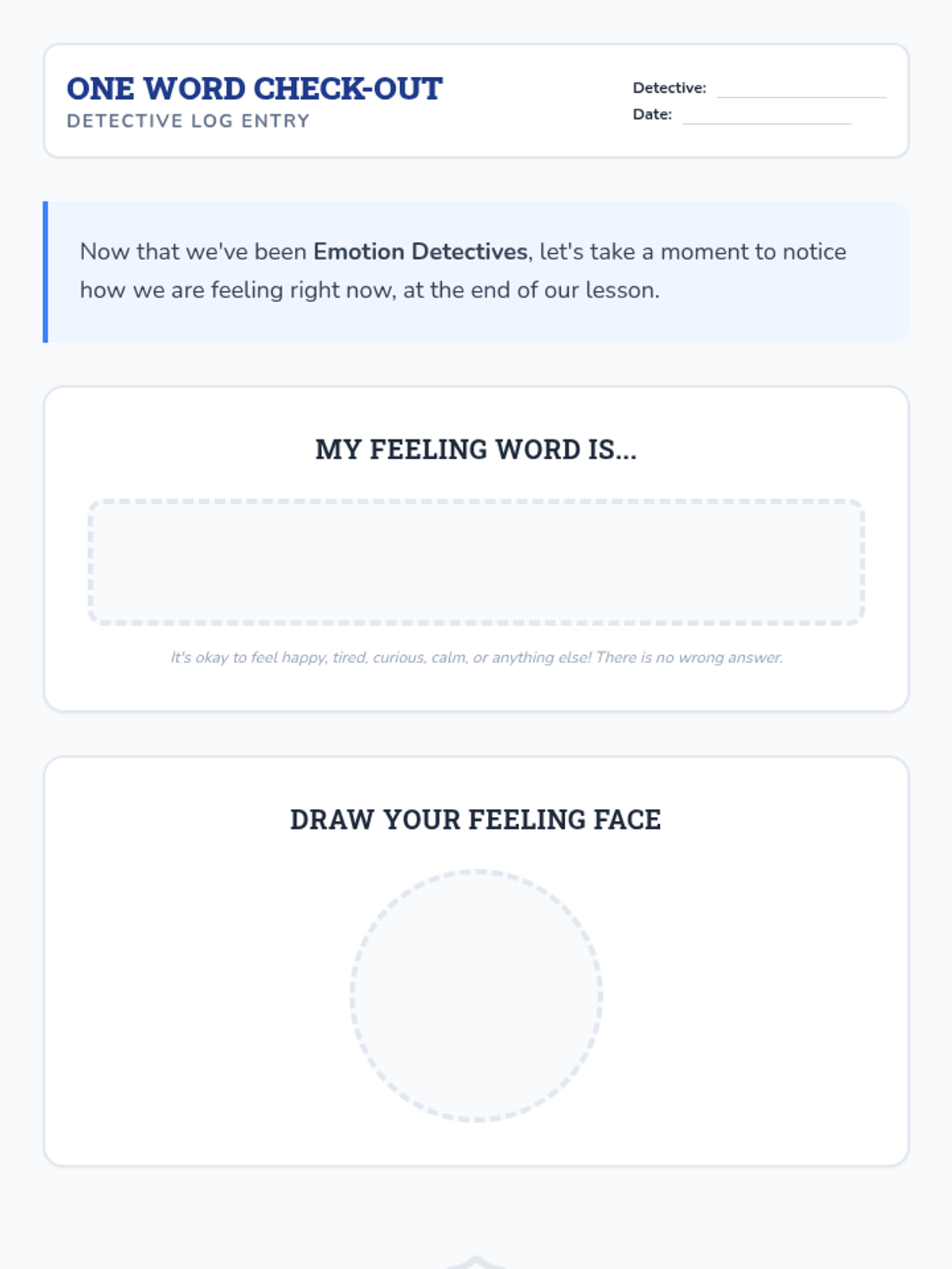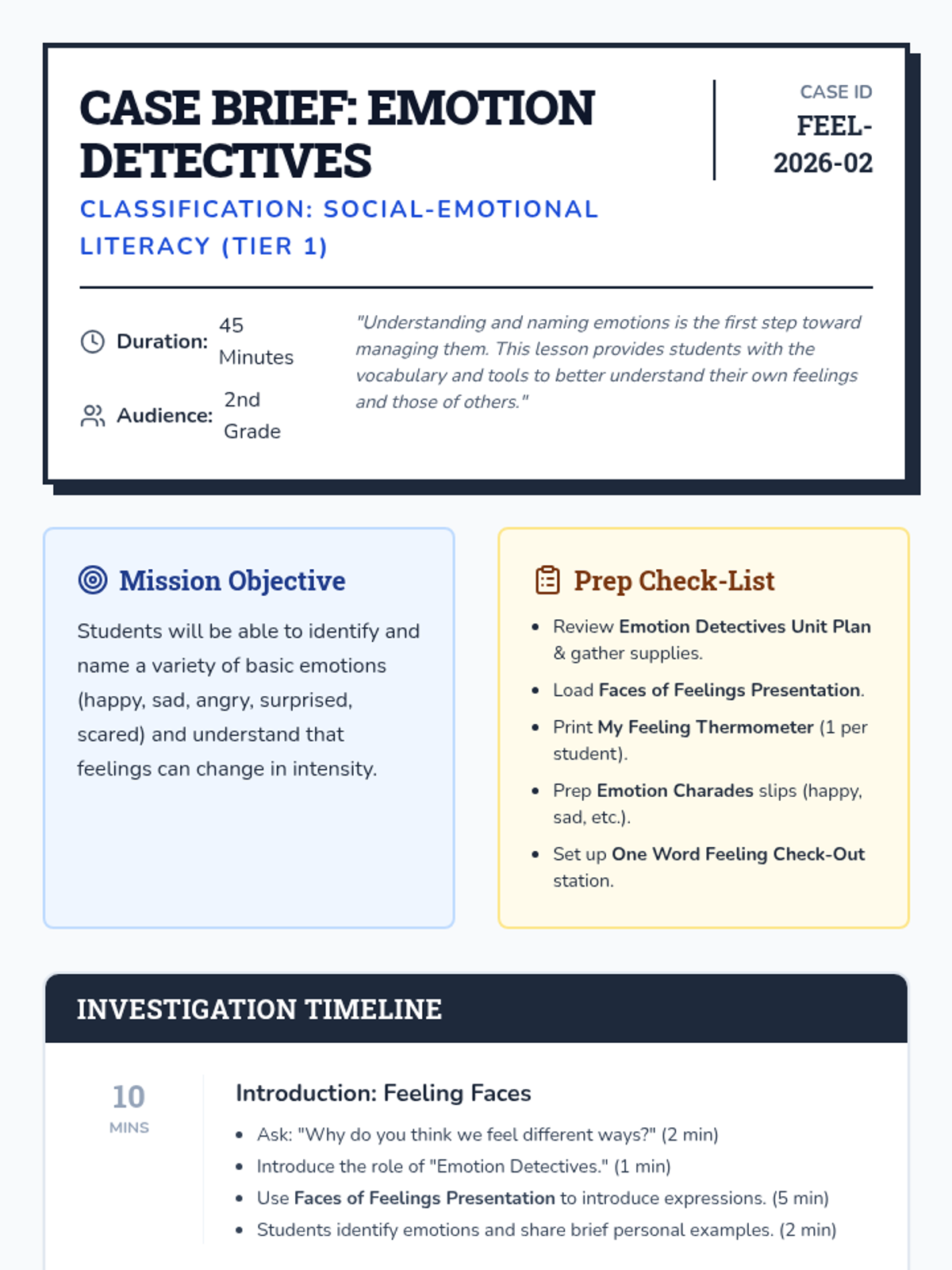 A foundational emotional literacy lesson where 2nd-grade students become 'Emotion Detectives' to identify, name, and measure the intensity of their feelings.