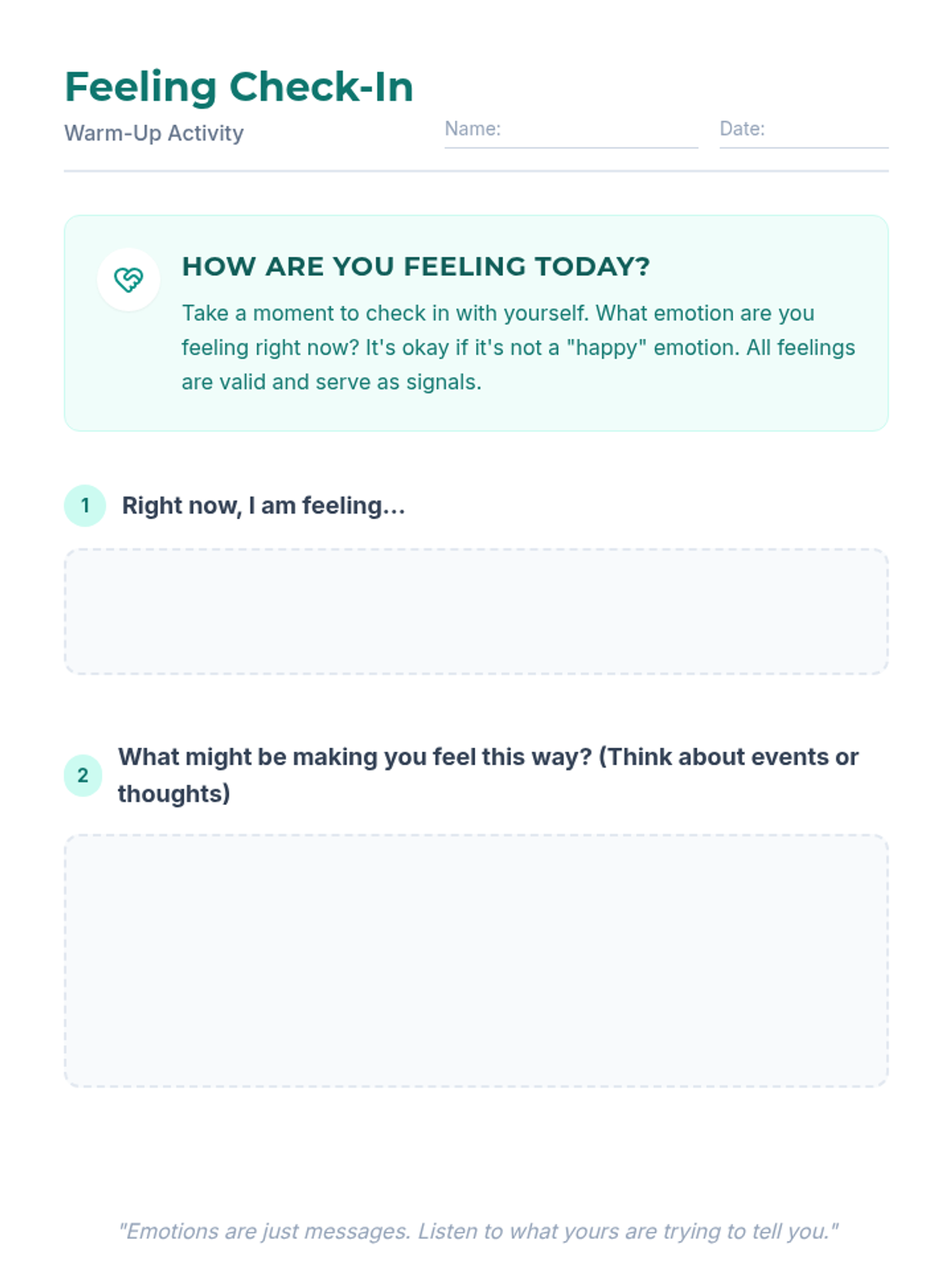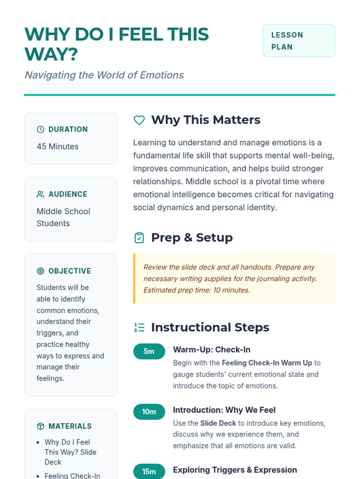 A 45-minute social-emotional learning lesson for middle schoolers to identify emotions, understand triggers, and practice healthy expression and management strategies.