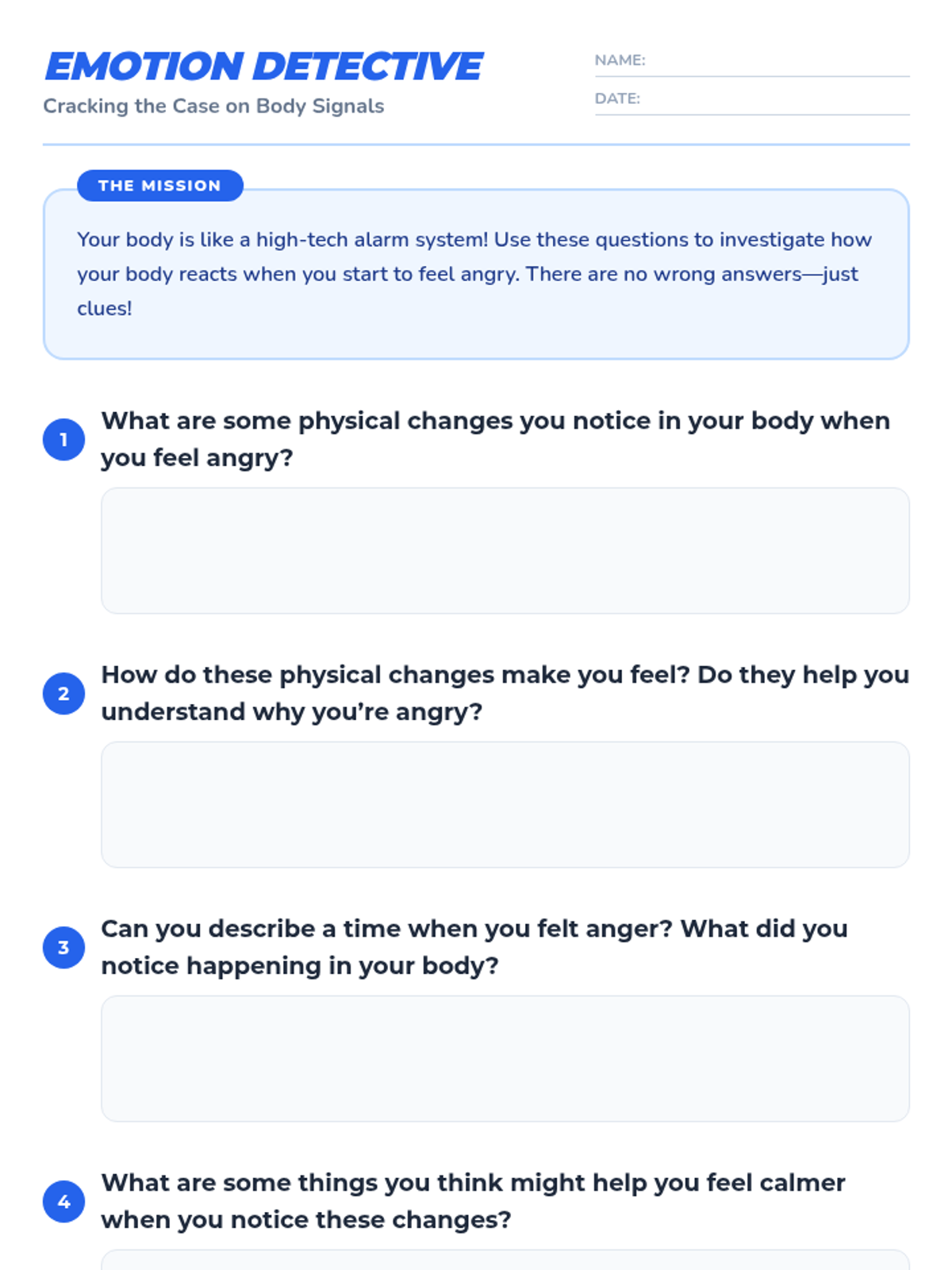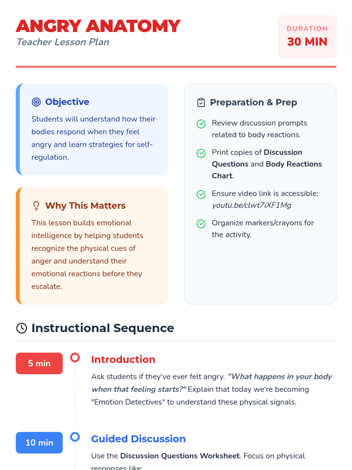 An interactive lesson for elementary students exploring the physical signs of anger and developing self-regulation skills through discussion and creative mapping.