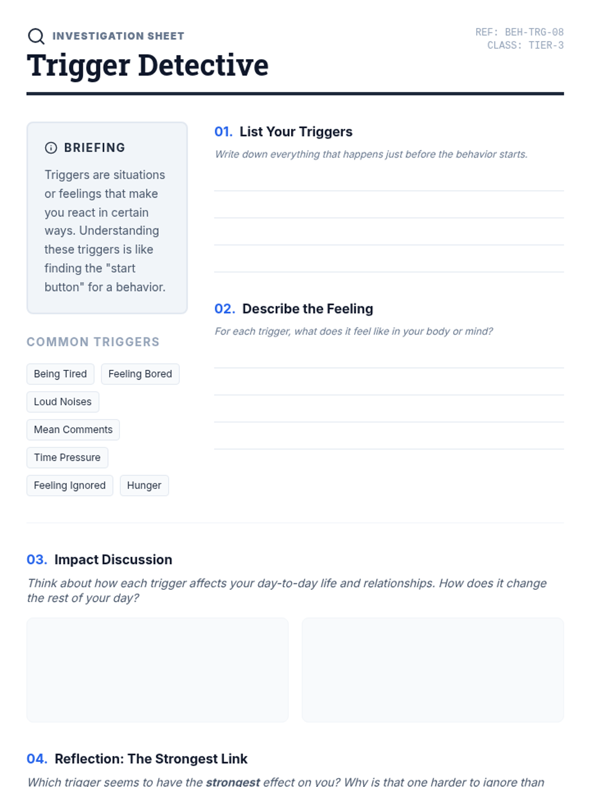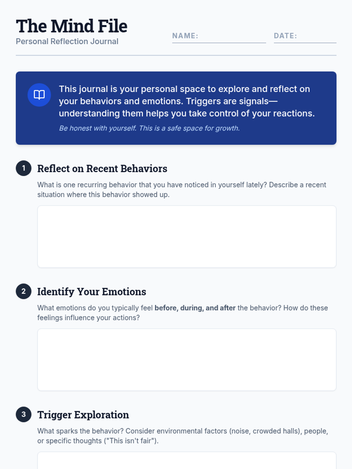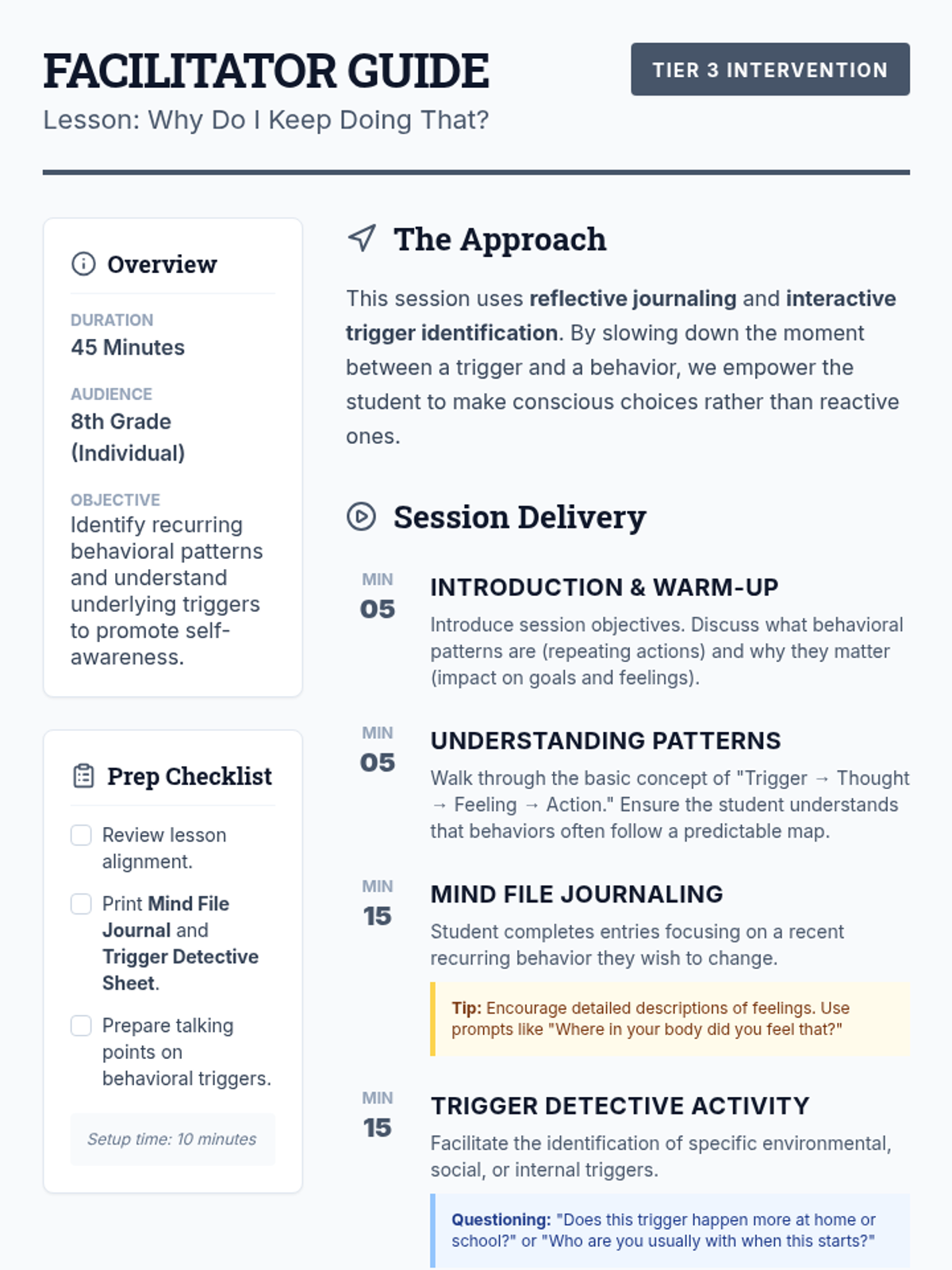 A 45-minute individual Tier 3 intervention for 8th-grade students to explore recurring behaviors, identify triggers, and build self-awareness through reflective journaling and activity-based discovery.