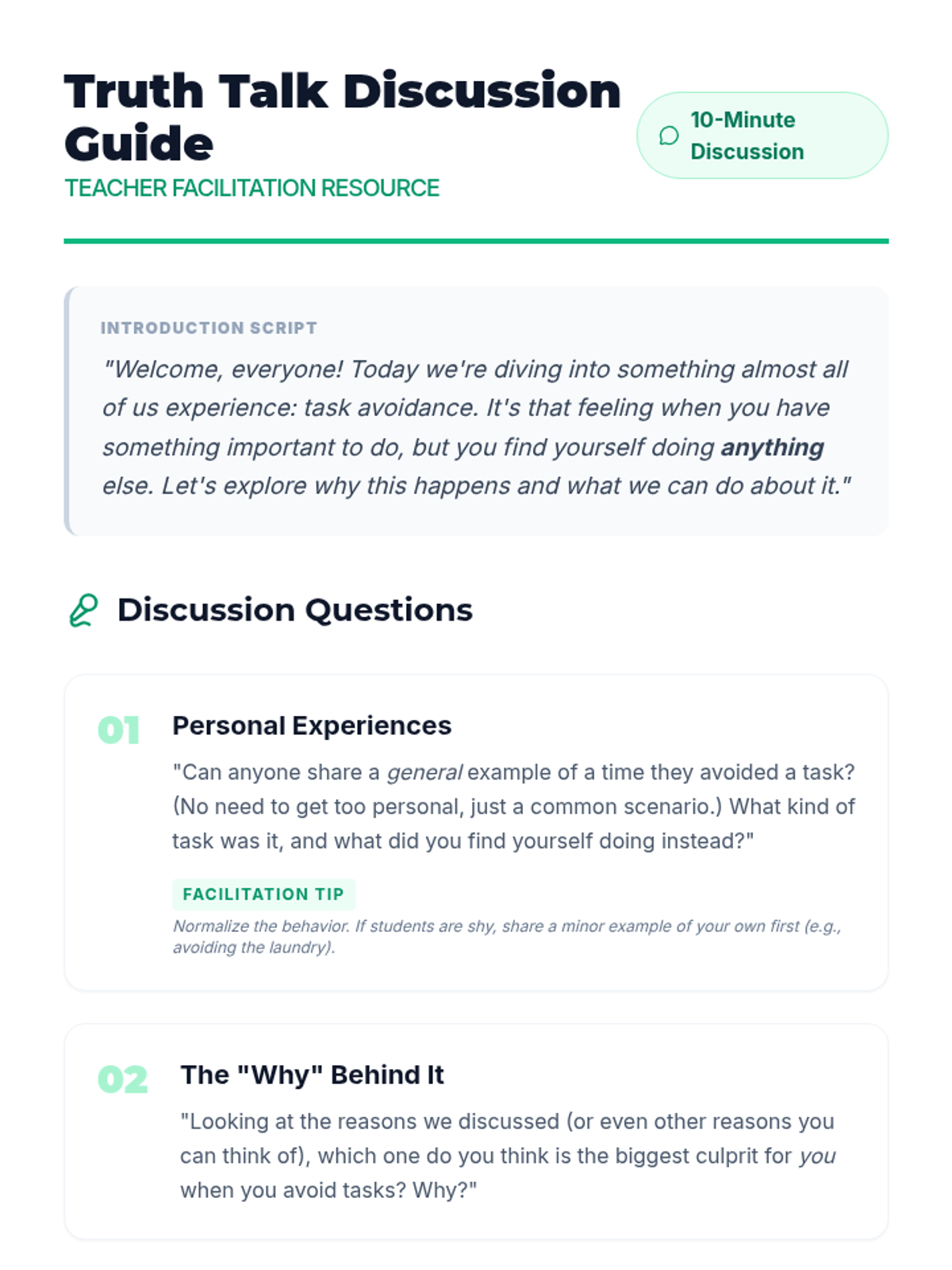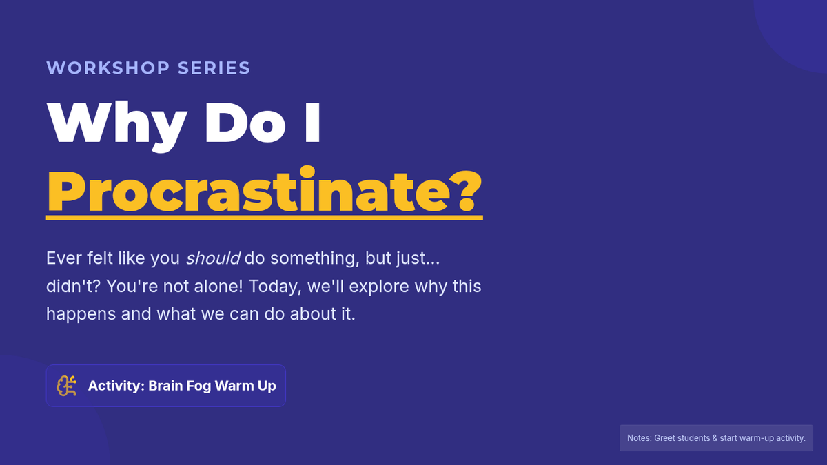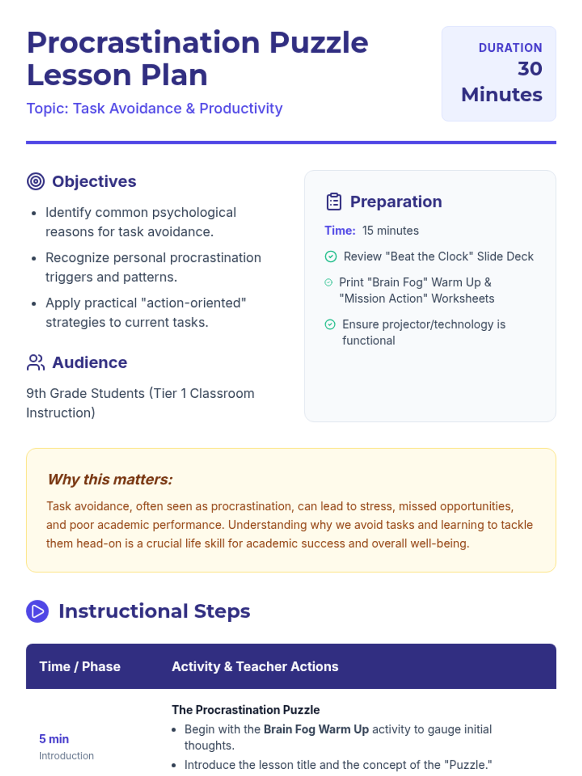 A 30-minute lesson for 9th-grade students to identify the root causes of task avoidance and learn practical strategies to overcome procrastination.