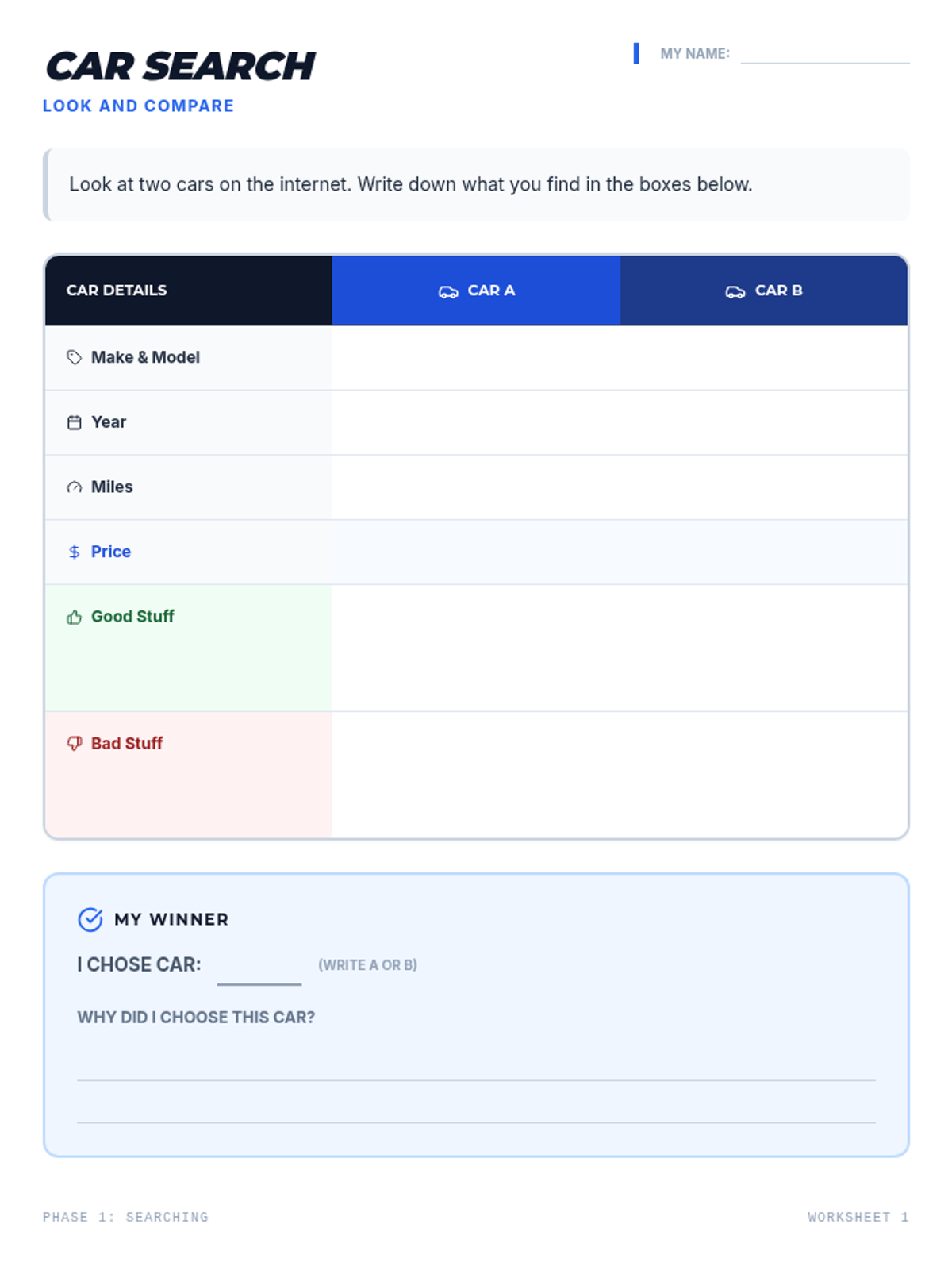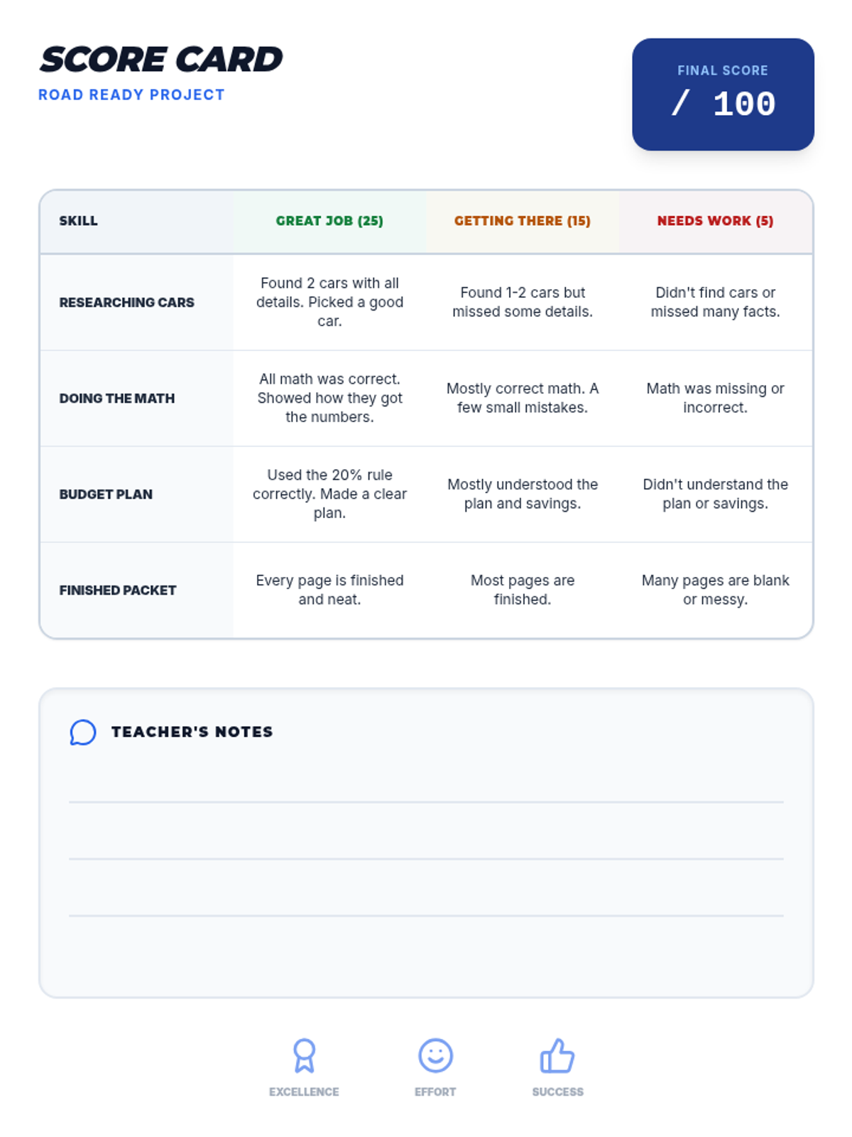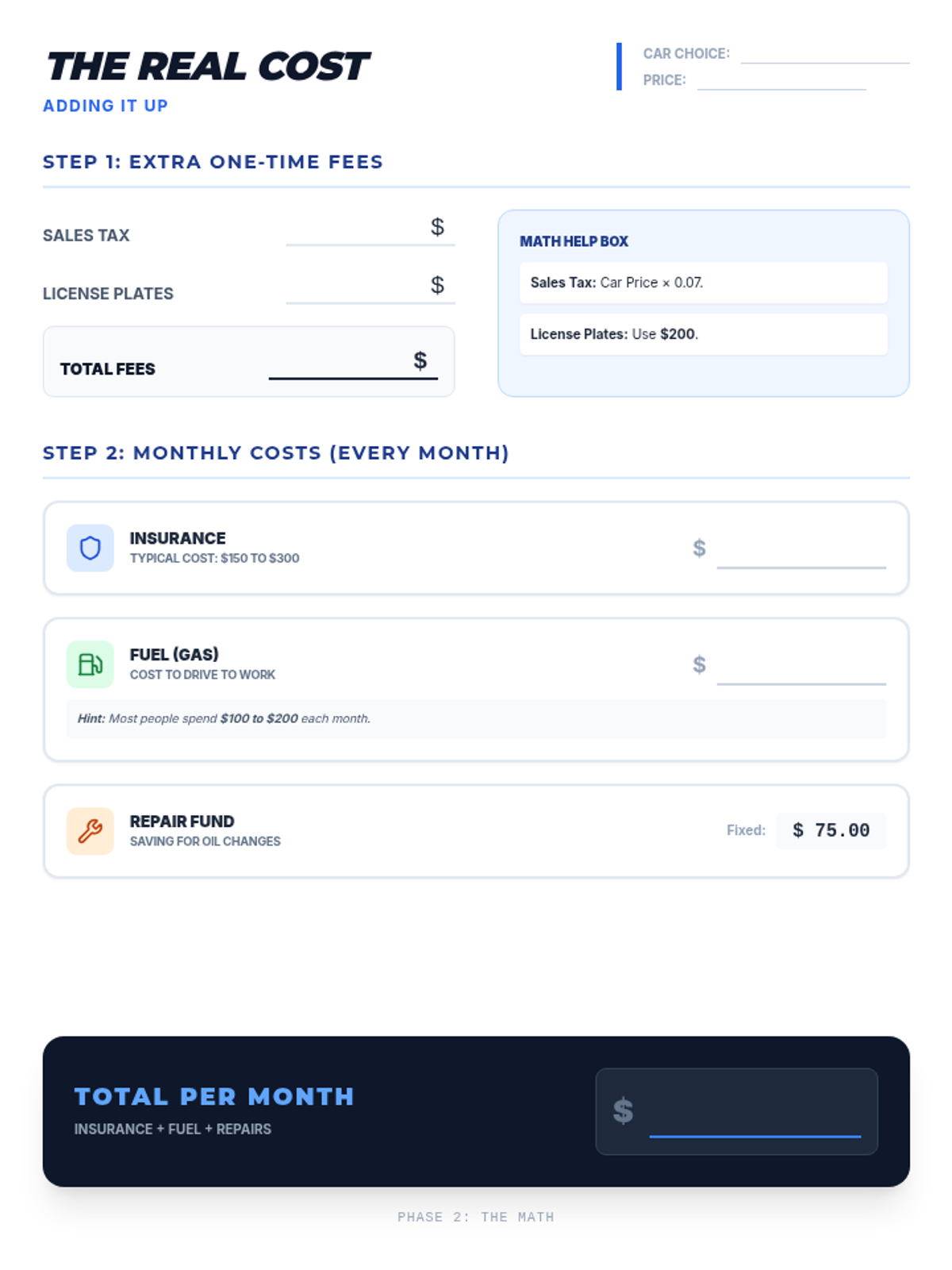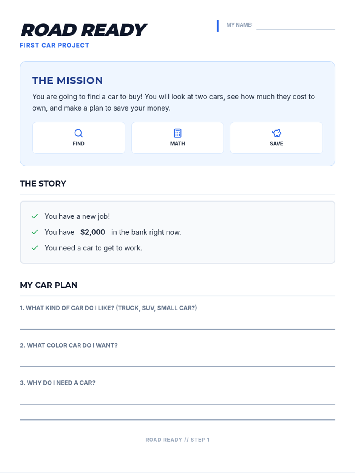 A comprehensive multi-day project where students research, compare, and budget for their first vehicle, focusing on total cost of ownership and financial planning.