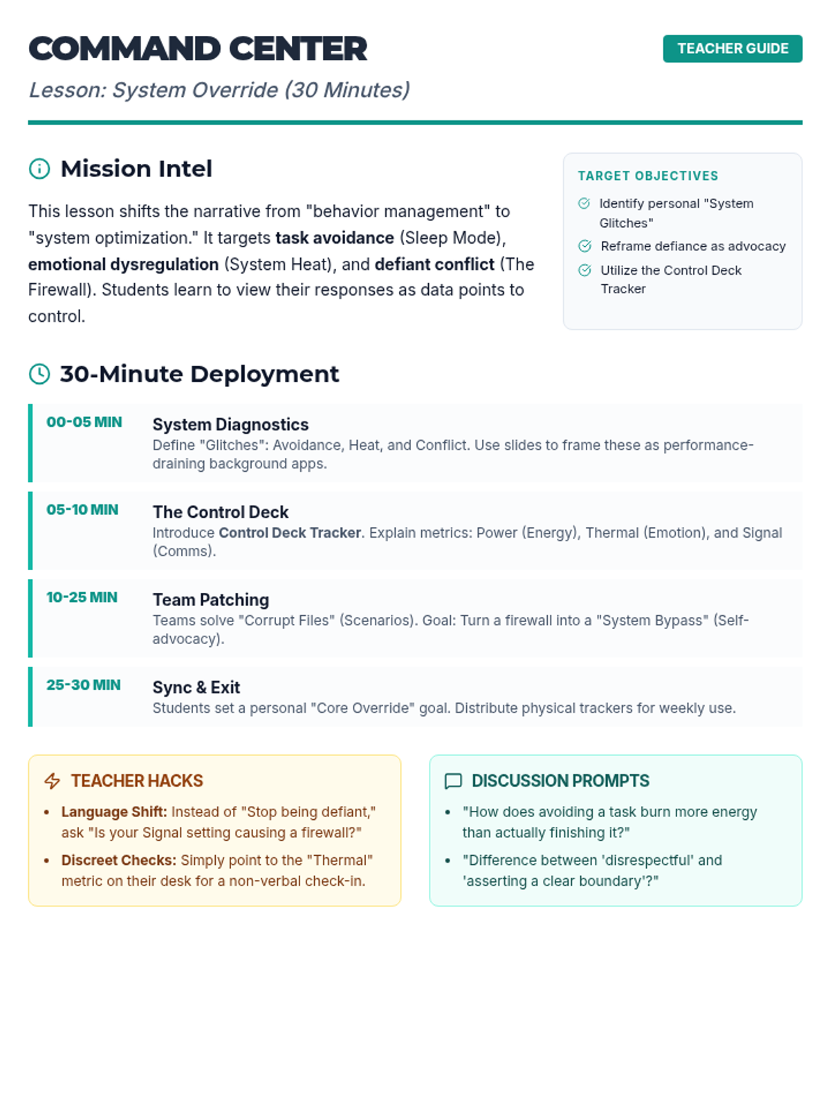 A high-impact lesson designed for high schoolers to master self-regulation and task management through a 'systems interface' lens, focusing on turning defiance into self-advocacy.