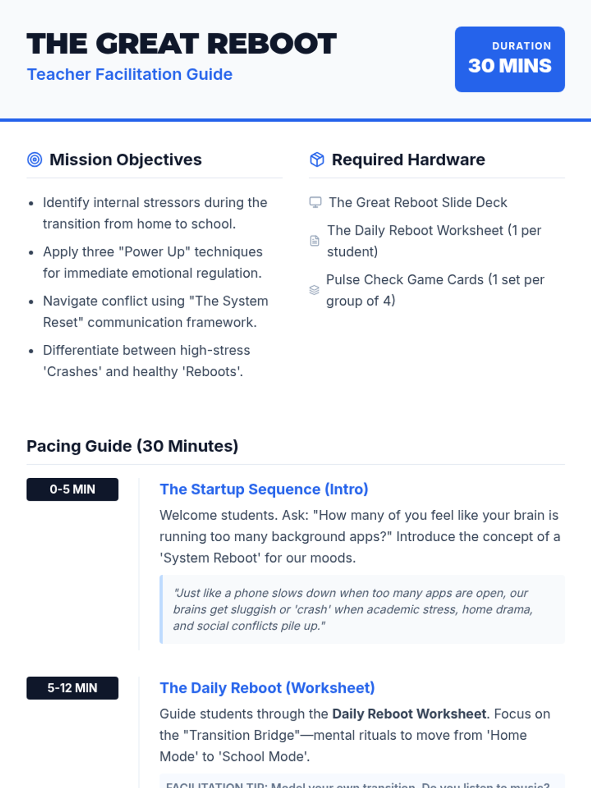 A high-energy, 30-minute social-emotional learning lesson designed for high schoolers. Students learn to navigate academic stress, resolve conflicts, and master the transition from home to school using 'The Great Reboot' framework.