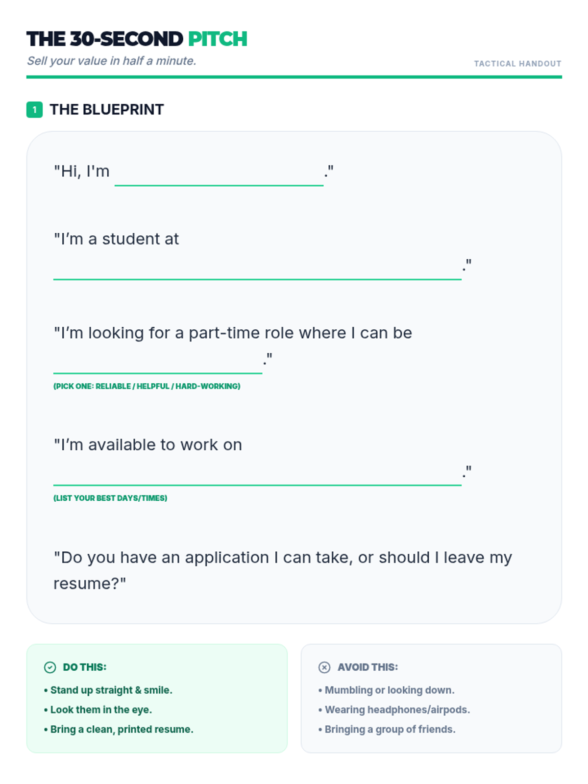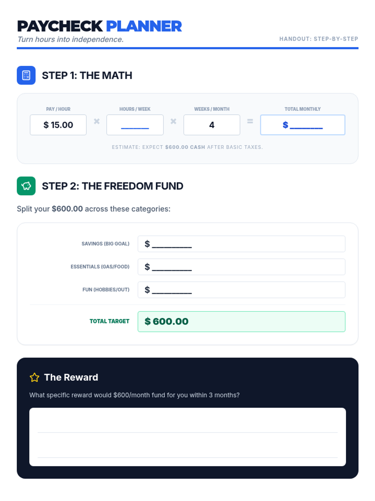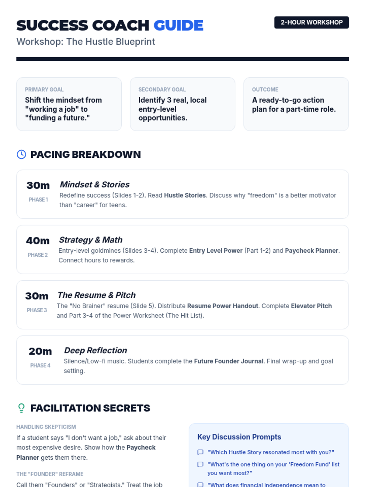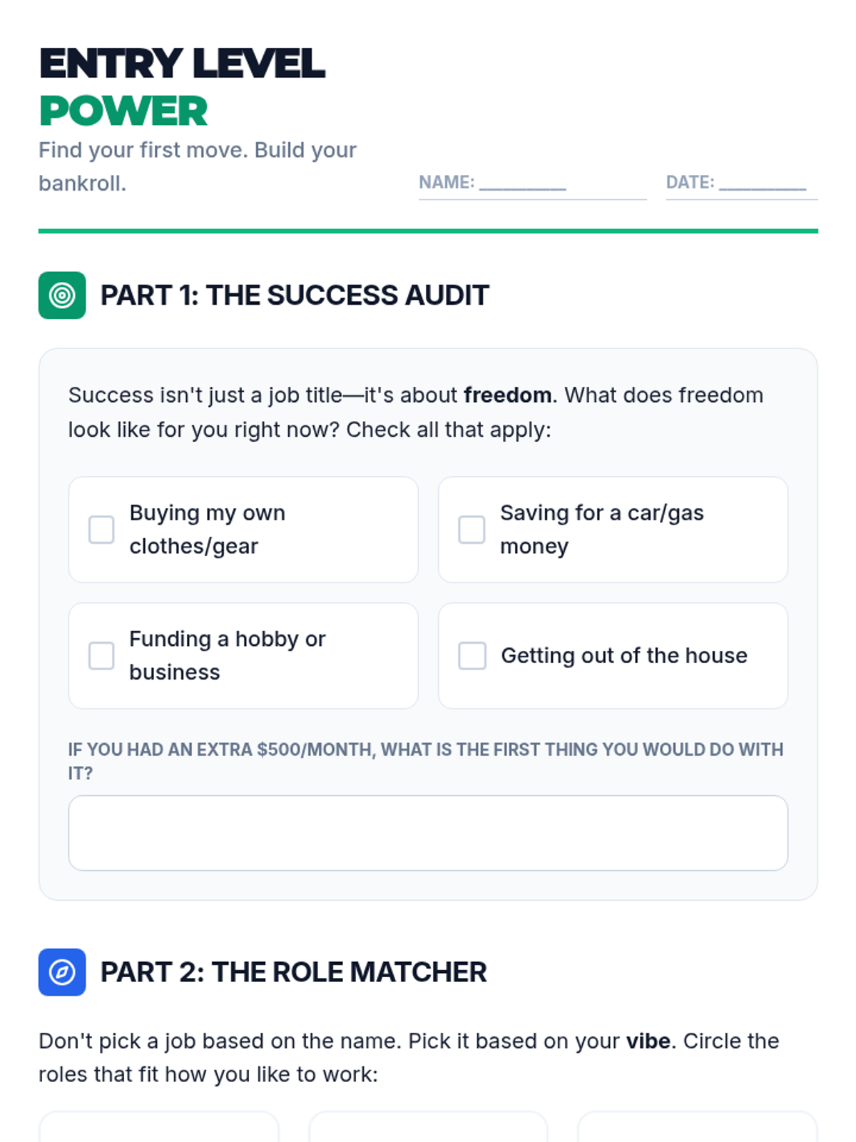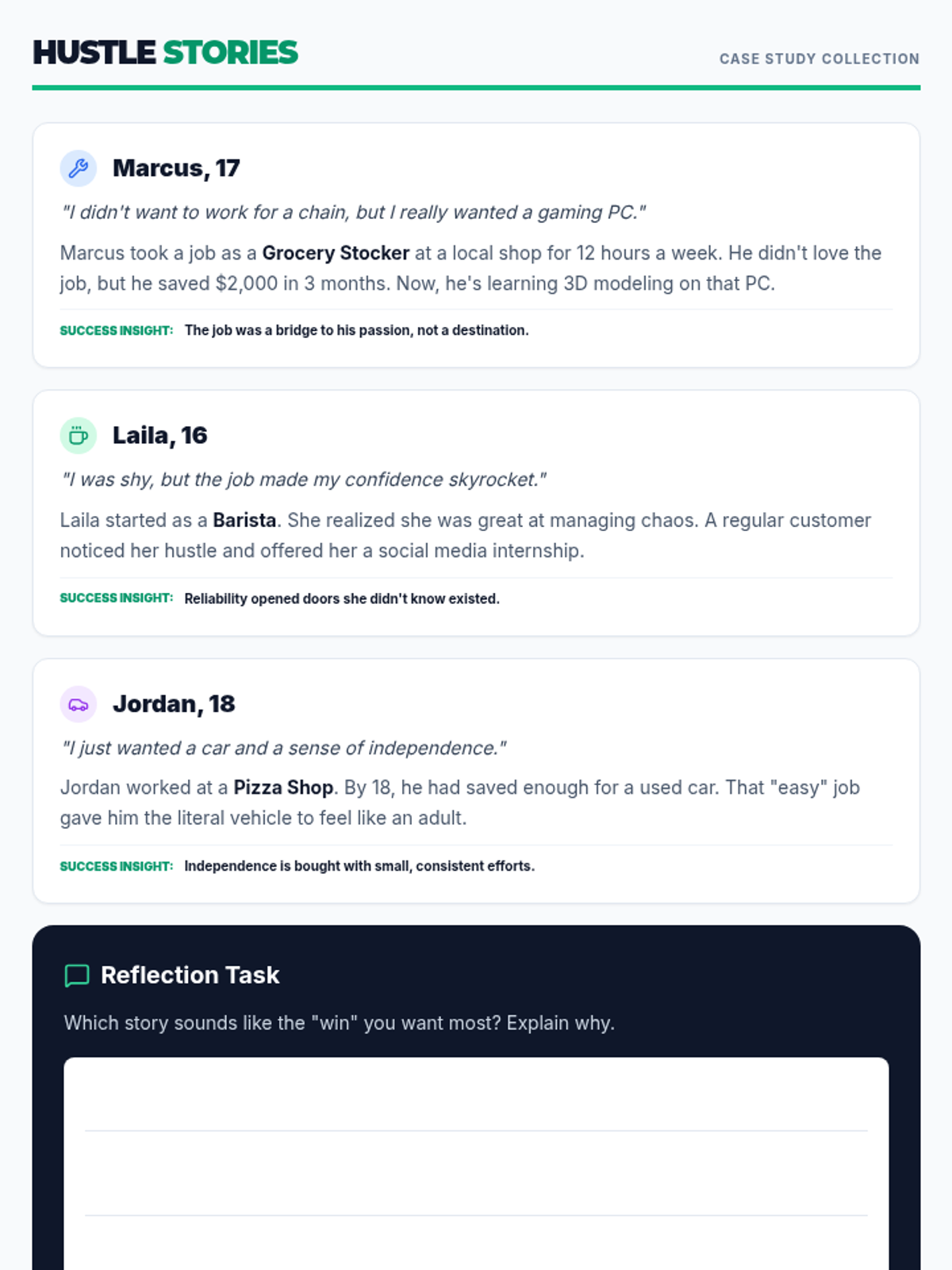 A 2-hour workshop designed for high schoolers to explore entry-level, part-time jobs as a strategic stepping stone toward personal success and independence. Students will redefine success, identify accessible roles that match their interests, and reflect on their long-term goals.