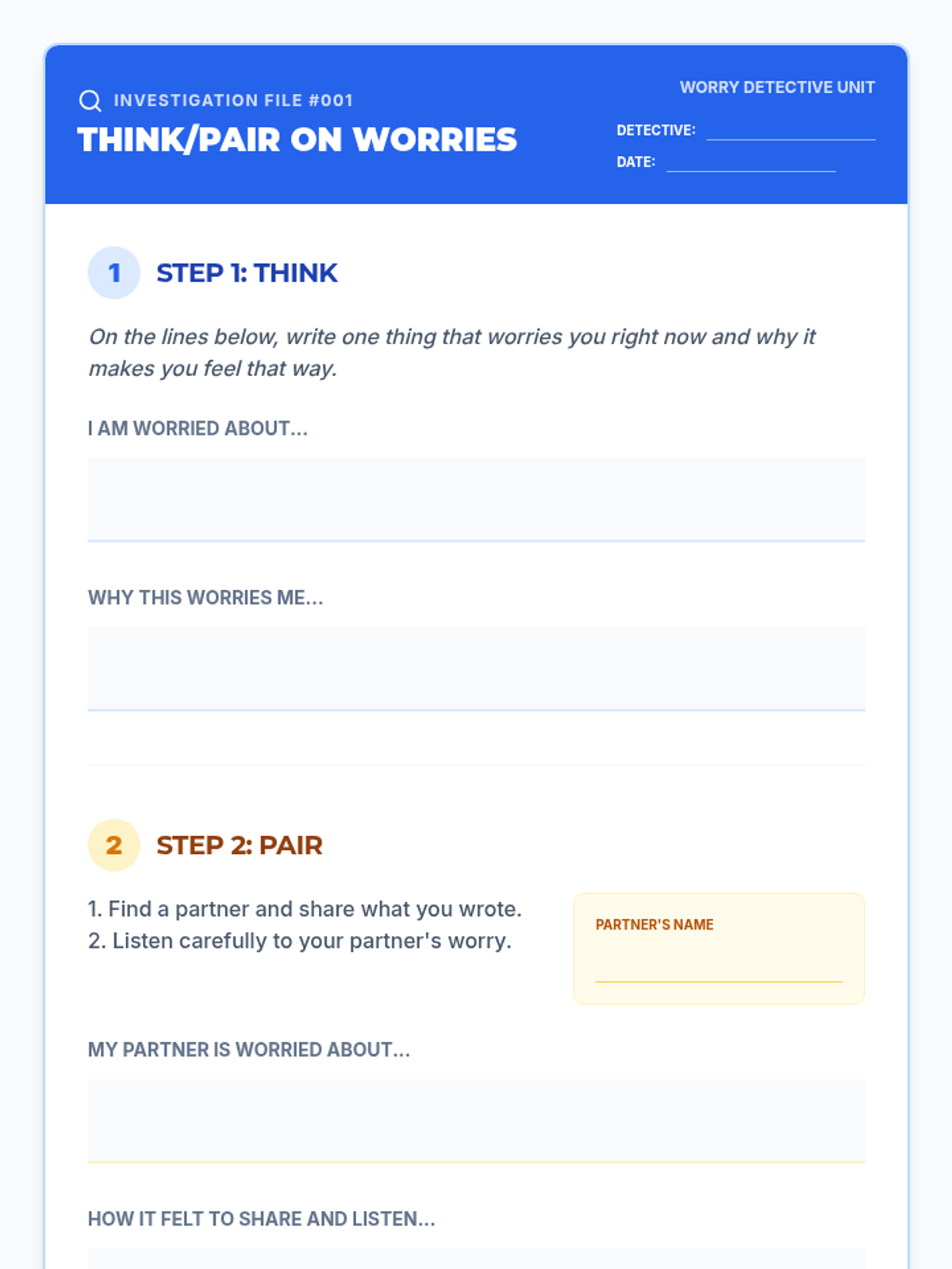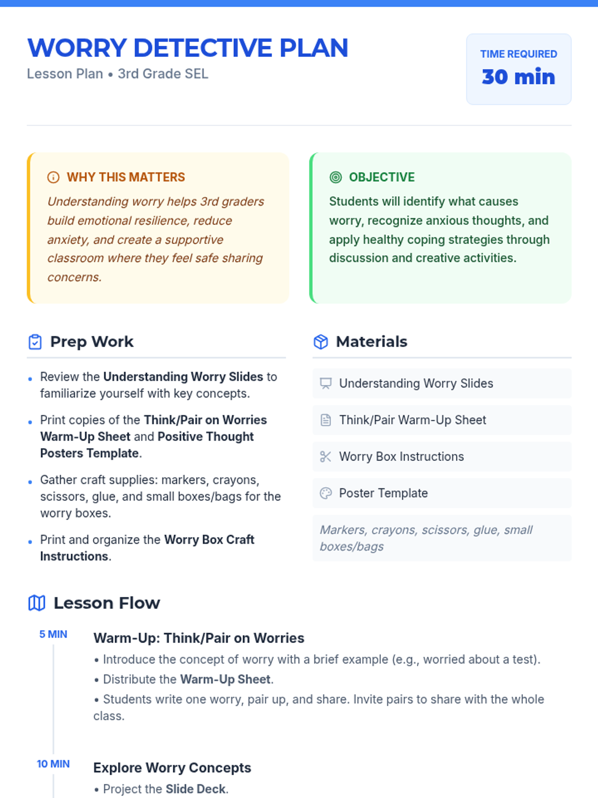 A 30-minute Tier 1 lesson for 3rd grade exploring the concept of worry, its triggers, and healthy management strategies through a 'Worry Detective' lens.