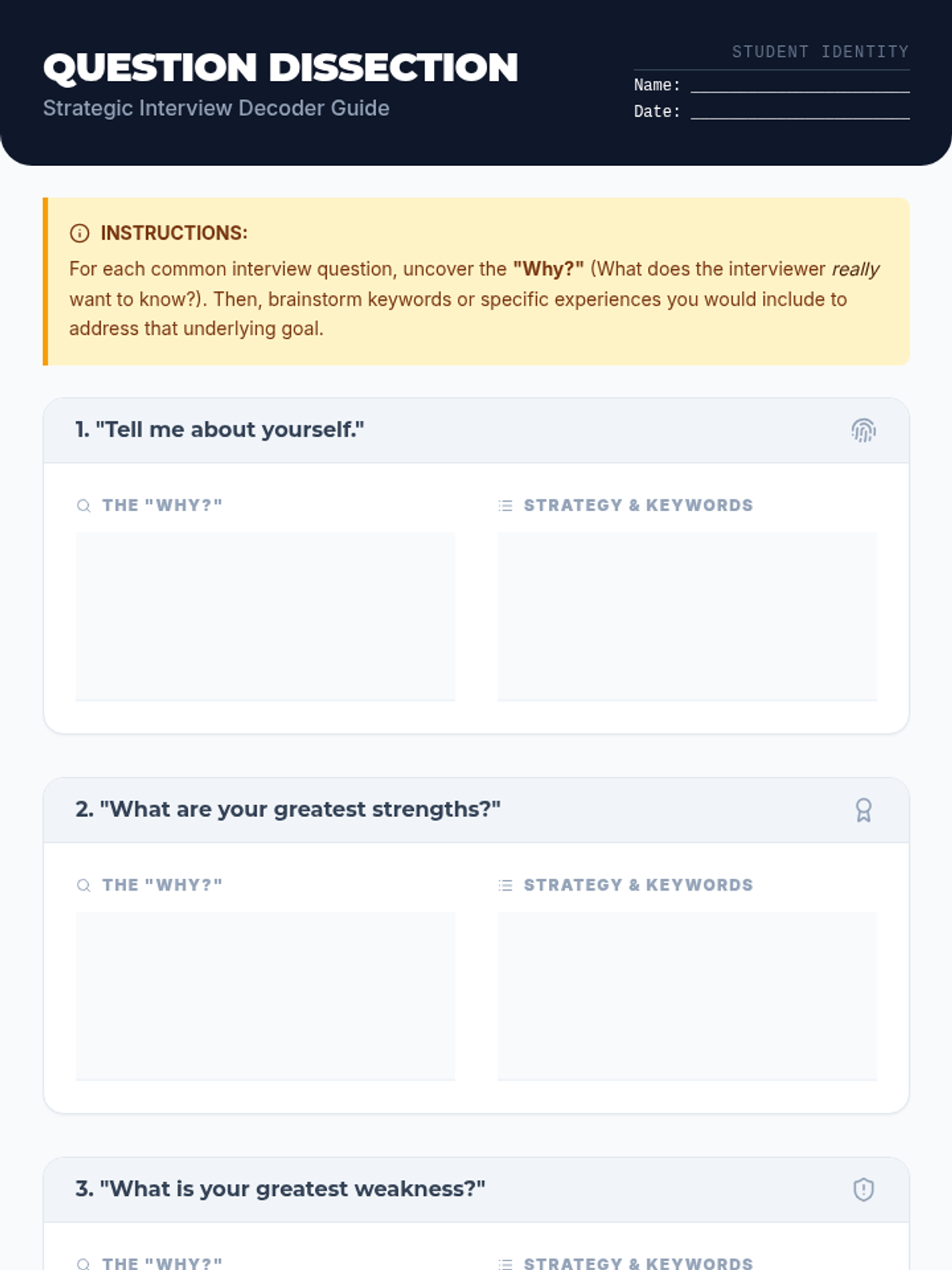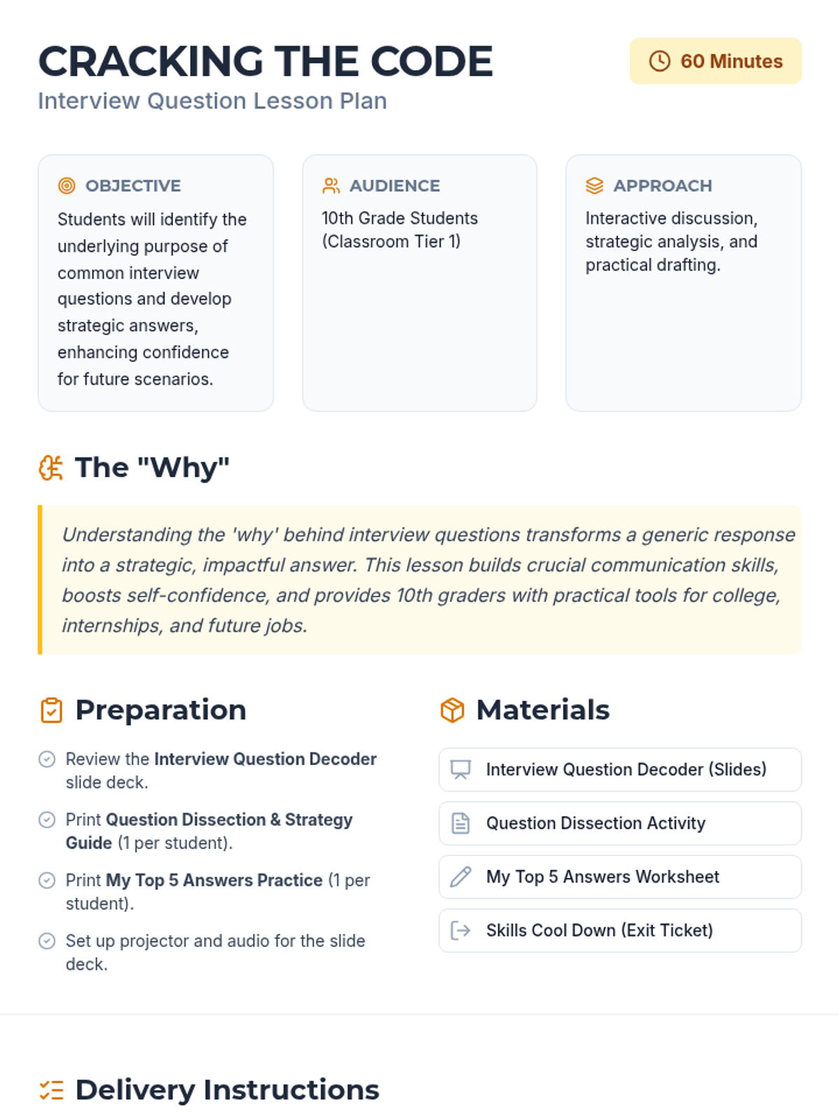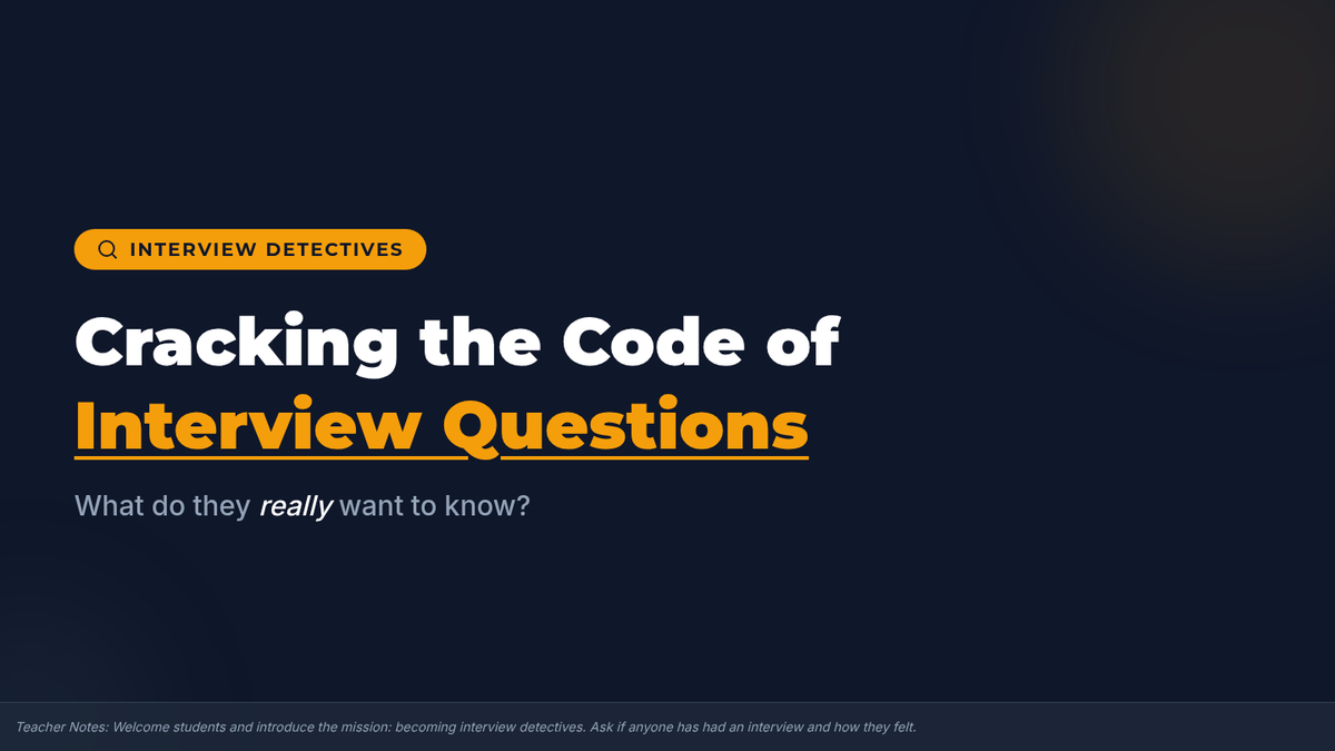 This lesson demystifies common interview questions for 10th graders, helping them understand the underlying motives of interviewers and craft strategic, confident responses. Students will move from 'mystery' to 'mastery' by decoding questions and drafting their own top answers.