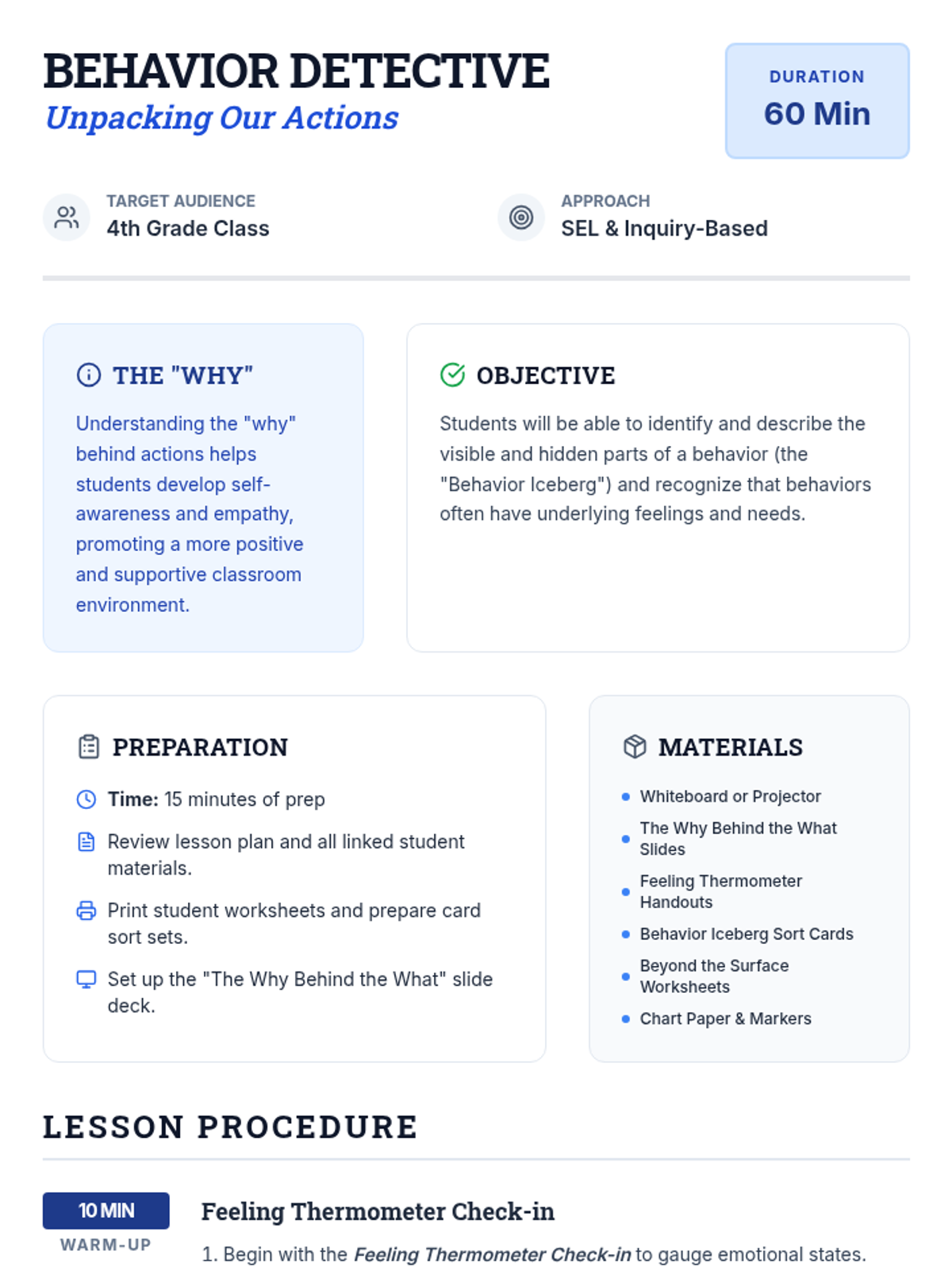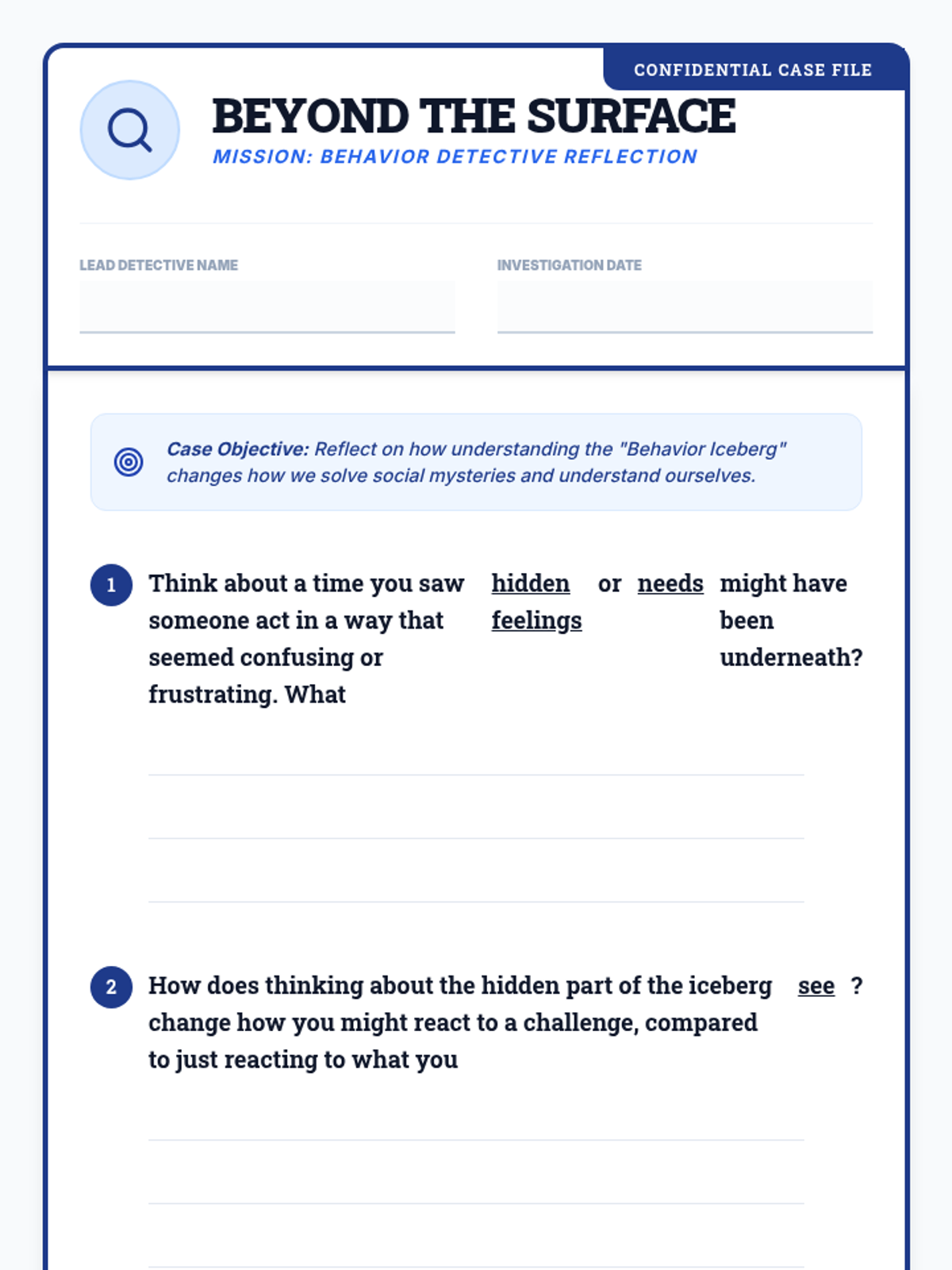 A 60-minute lesson for 4th graders to explore the 'Behavior Iceberg,' understanding that visible actions are often driven by hidden feelings and needs. Students develop empathy and self-awareness by learning to look 'beyond the surface' of behavior.